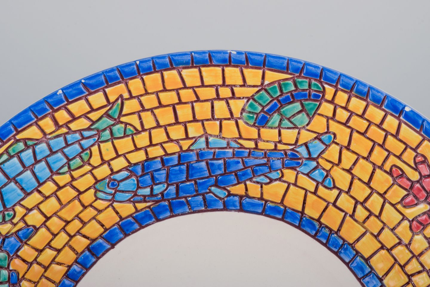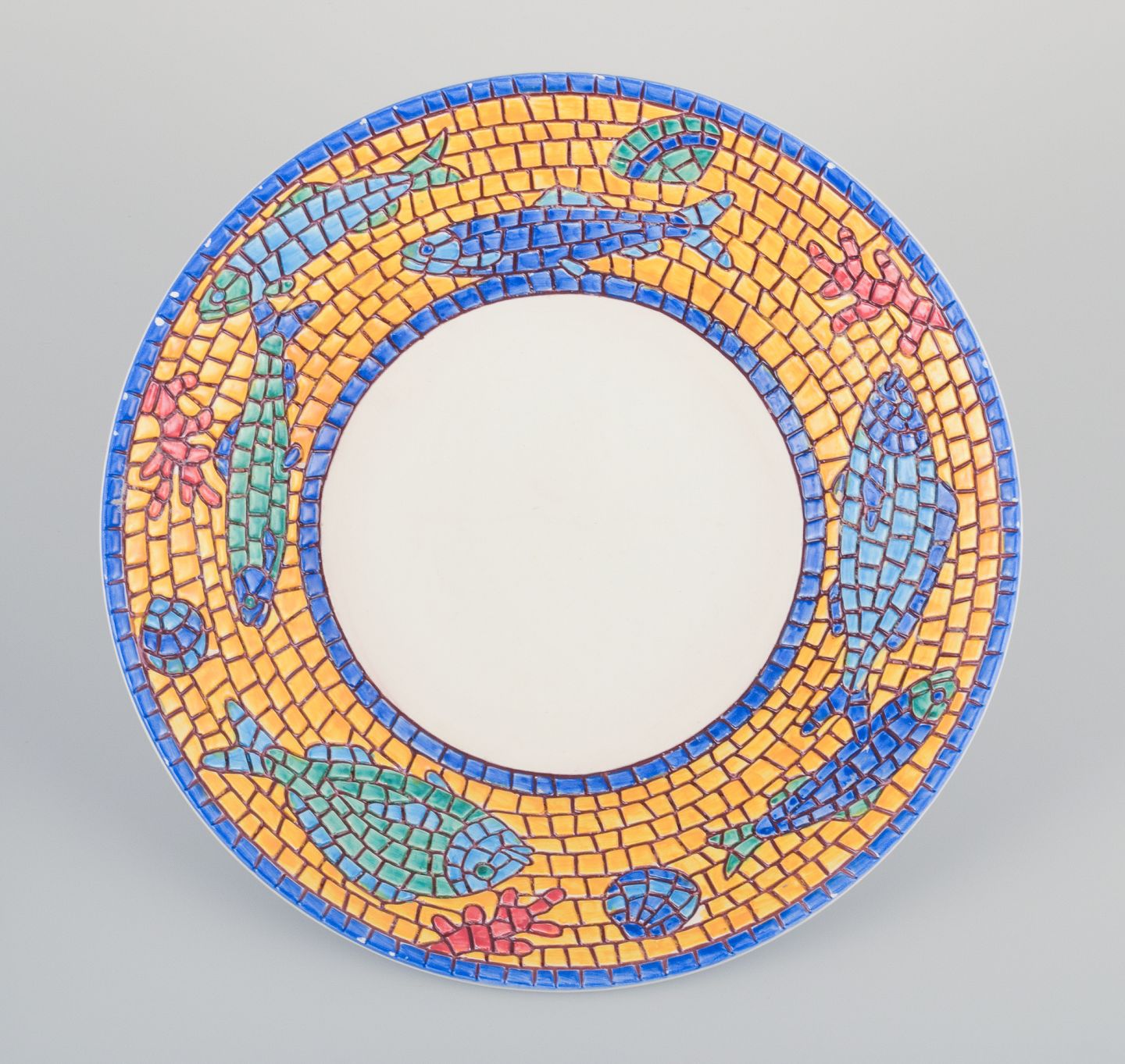 Vietri, Italien, tre store dybe tallerkner og aflangt fad i keramik. Fisk og skaldyrsmotiver.