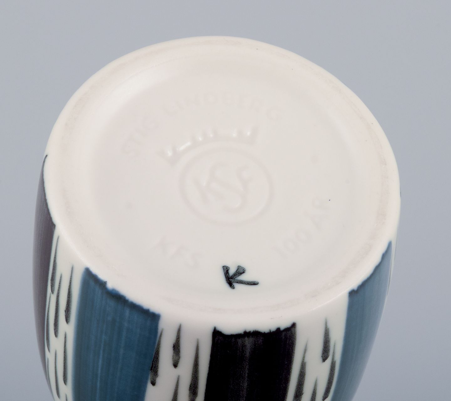 Stig Lindberg for Gustavsberg, Sverige. Jubilæumsvase i keramik med glasur i blå og sorte toner. Håndmalet. 2000-tallet. Stemplet. Perfekt stand. Mål: H 29,0 cm. x D 6,5 cm.
