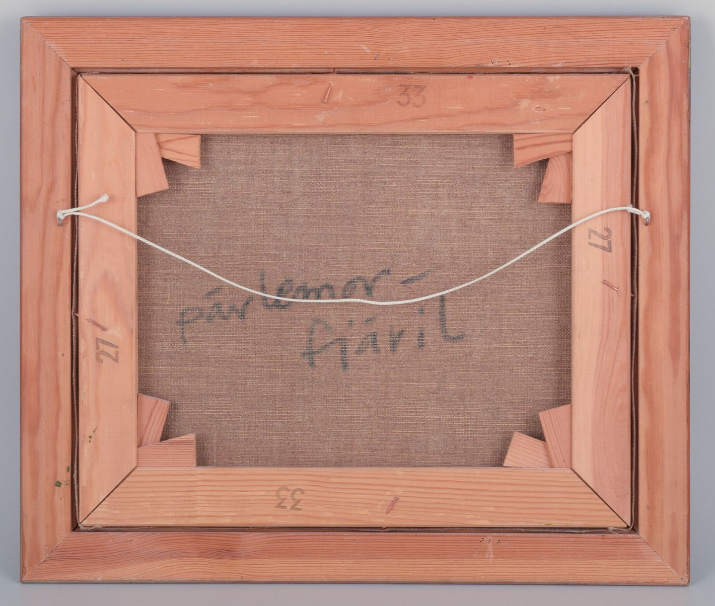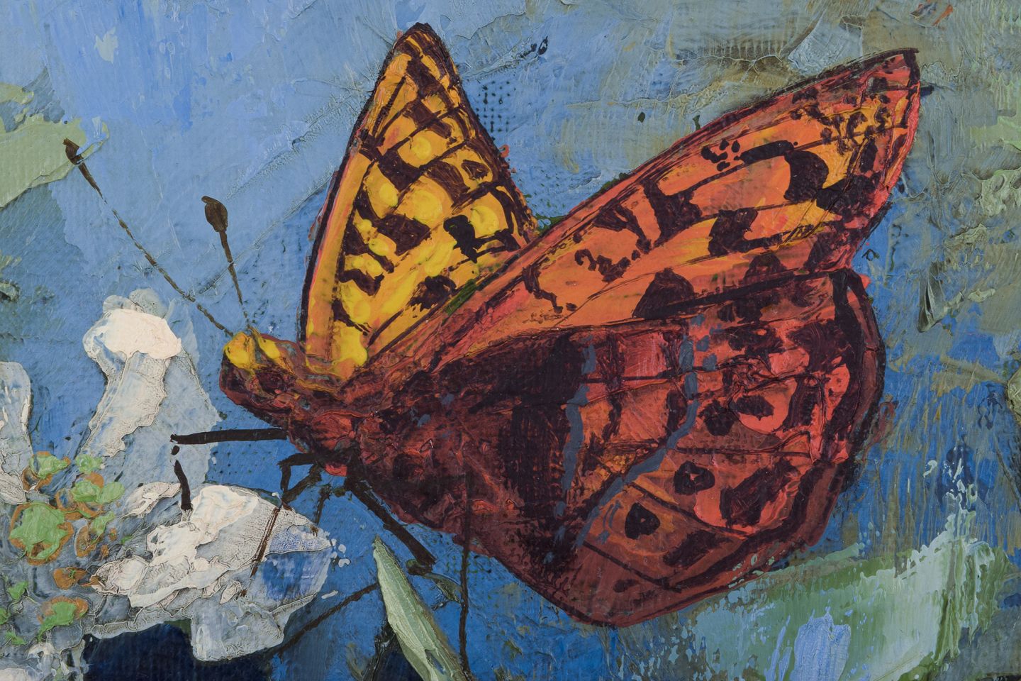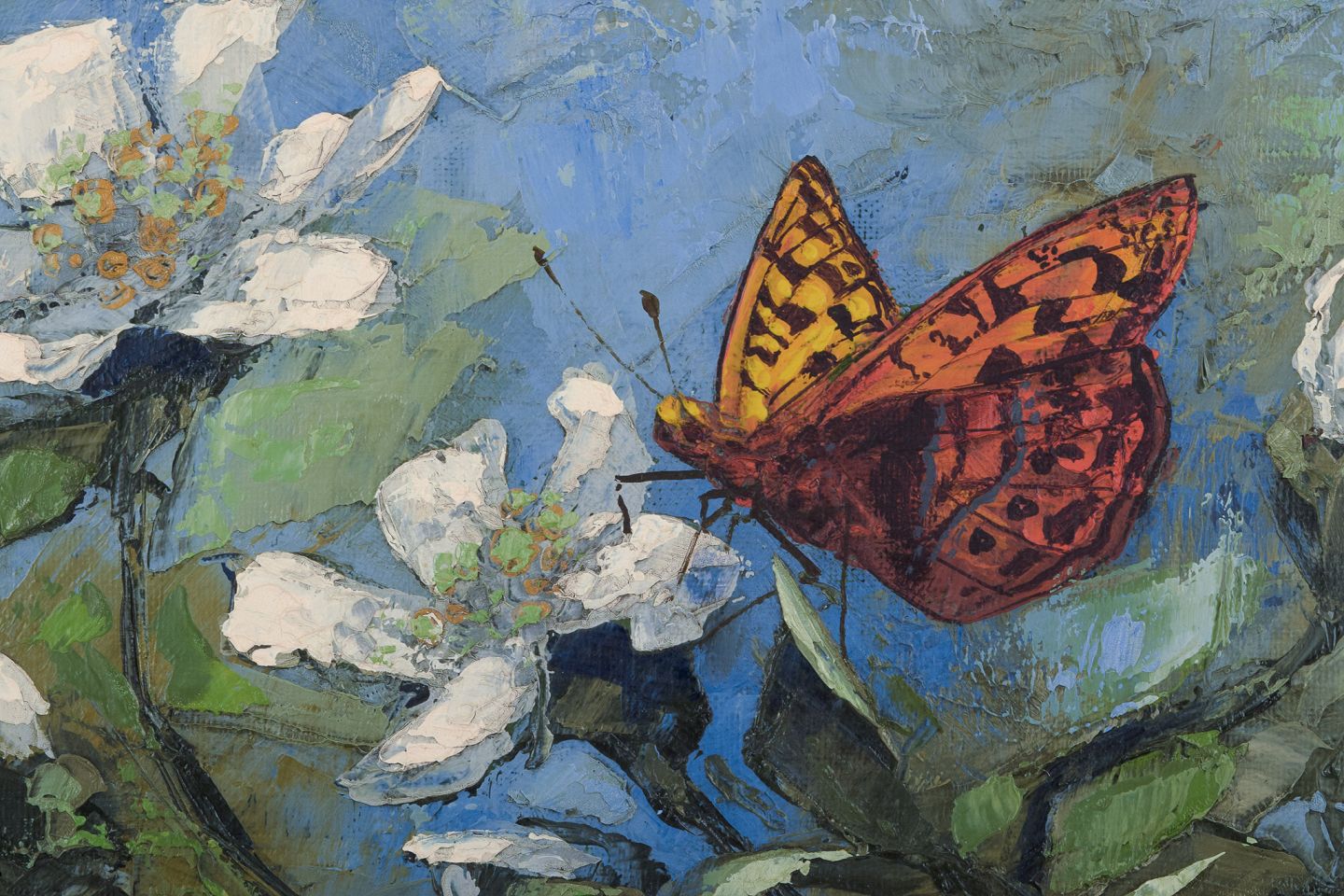 Ulf Ålund (f 1948), svensk kunstner, olie på lærred. Perlemorssommerfugl i blomsterlandskab.