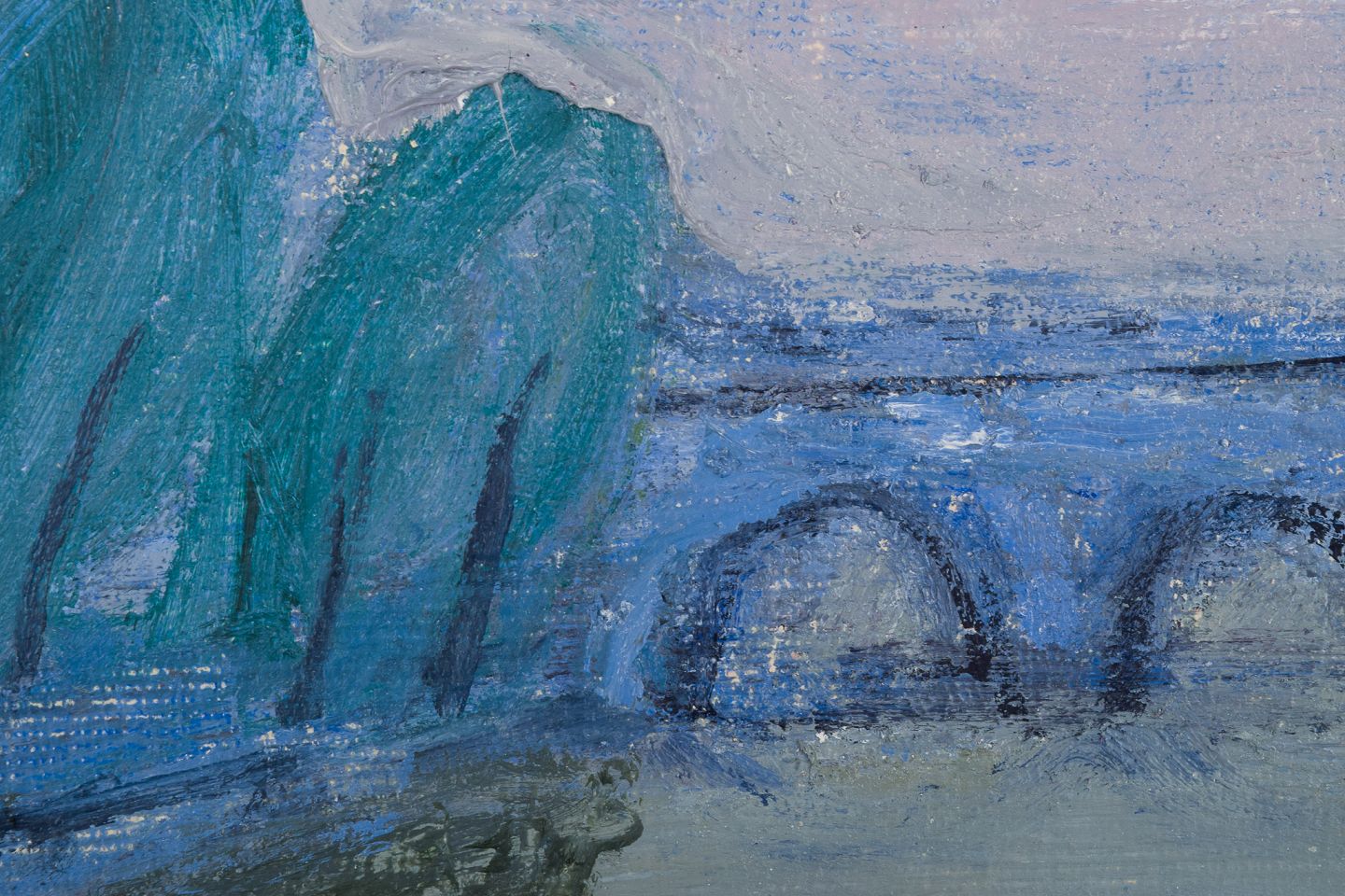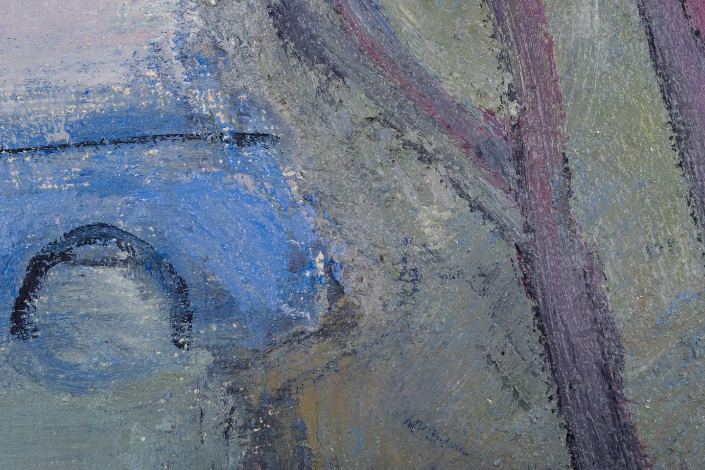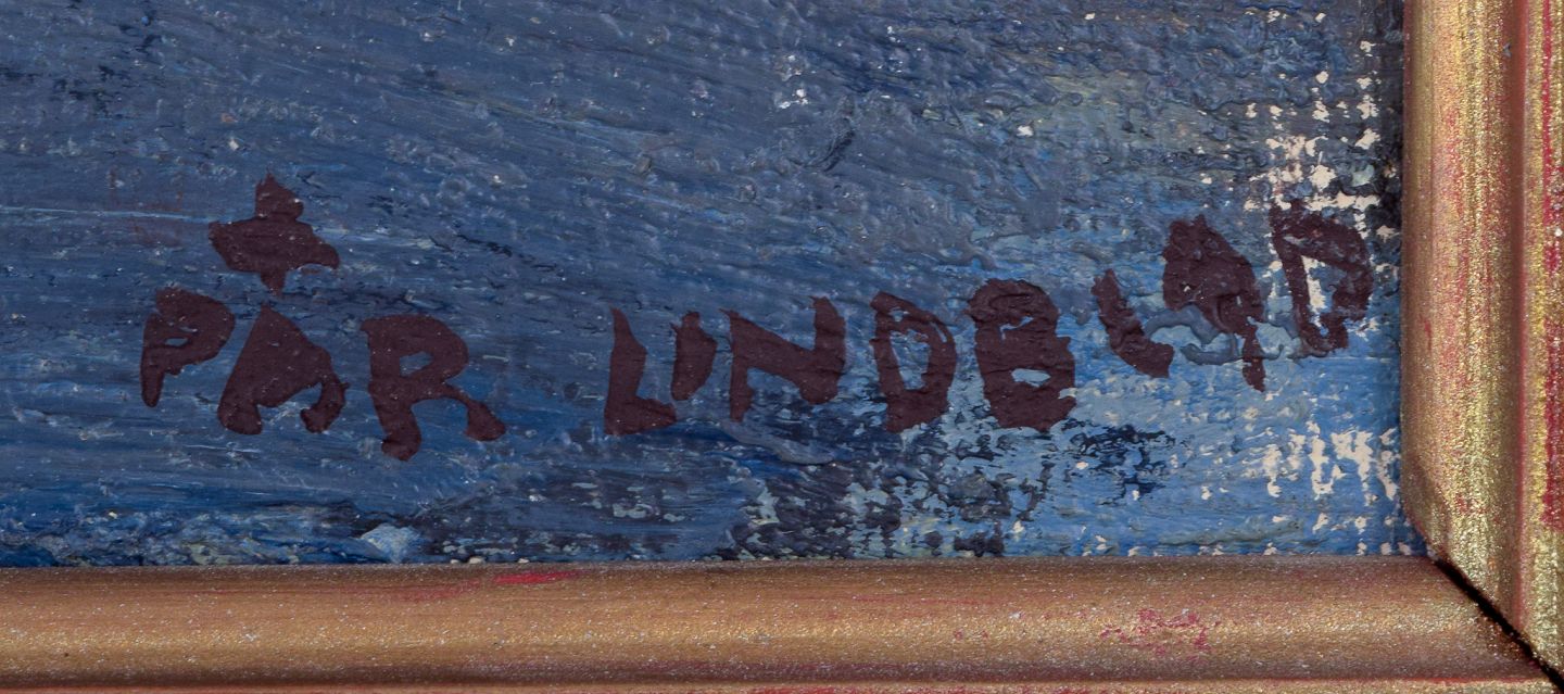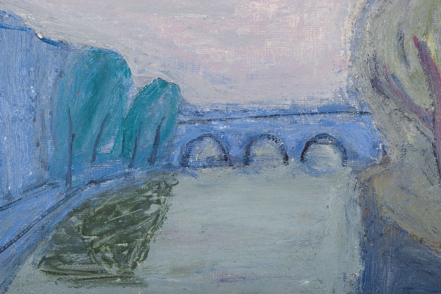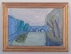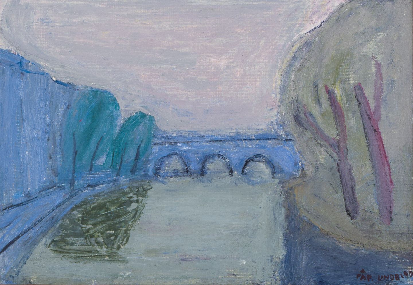 Pär Lindblad, svensk kunstner, olie på lærred. Modernistisk landskab med flod og bro.