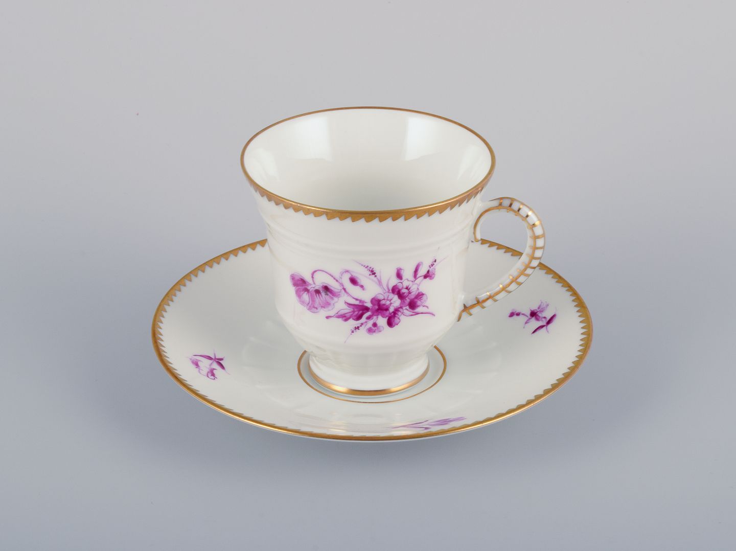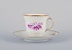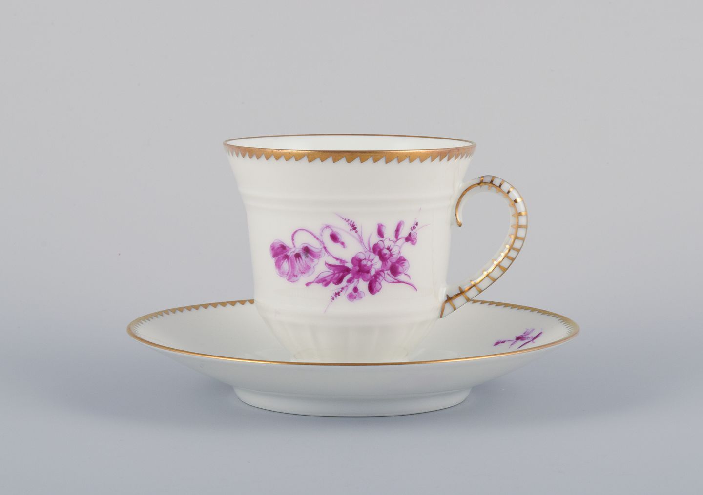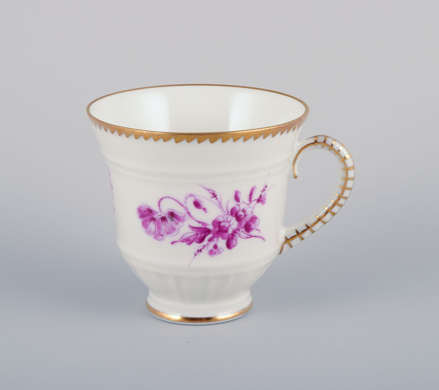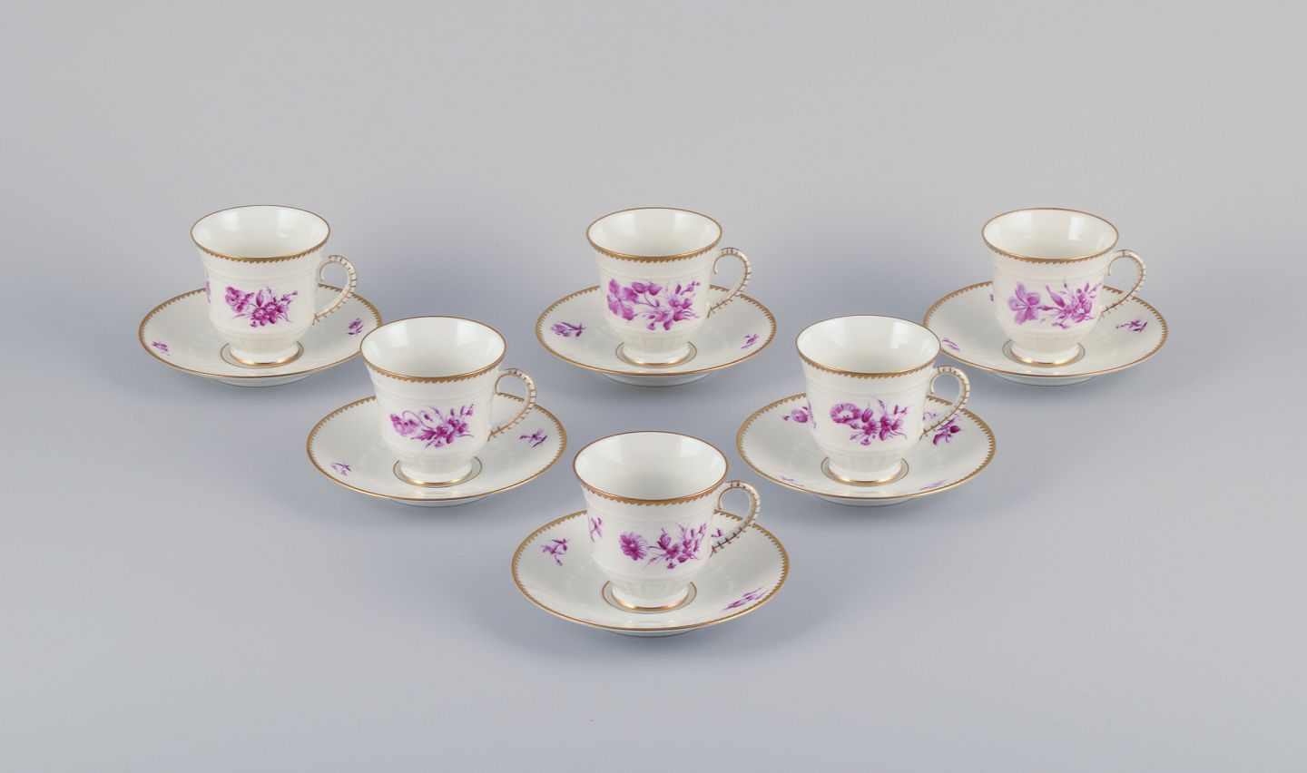 Bing & Grøndahl, Danmark. Et sæt på seks kaffekopper og underkopper med blomsterdekorationer i purpur og guldkant. Håndmalet.