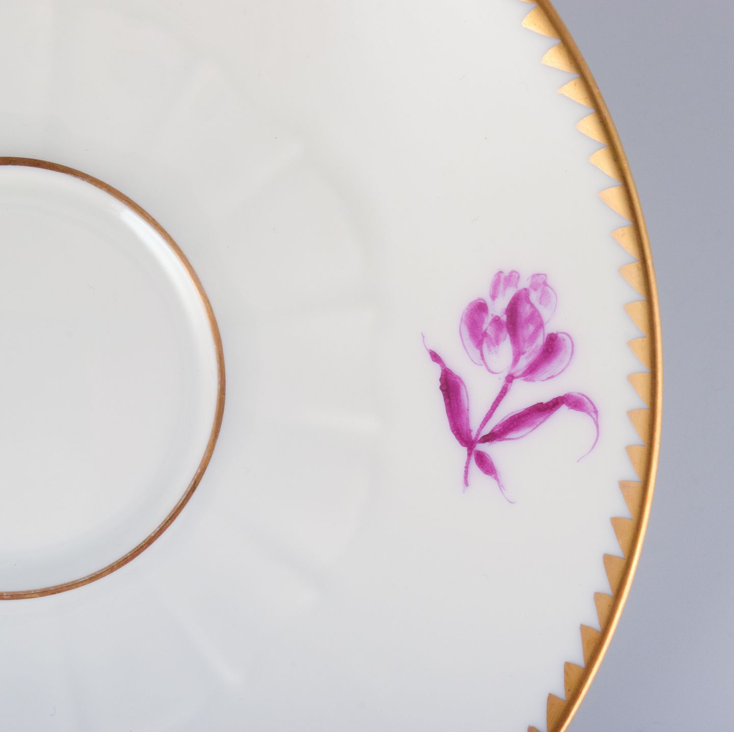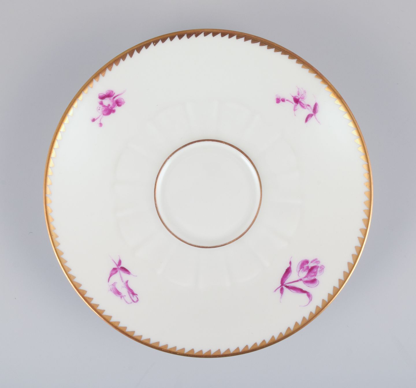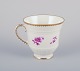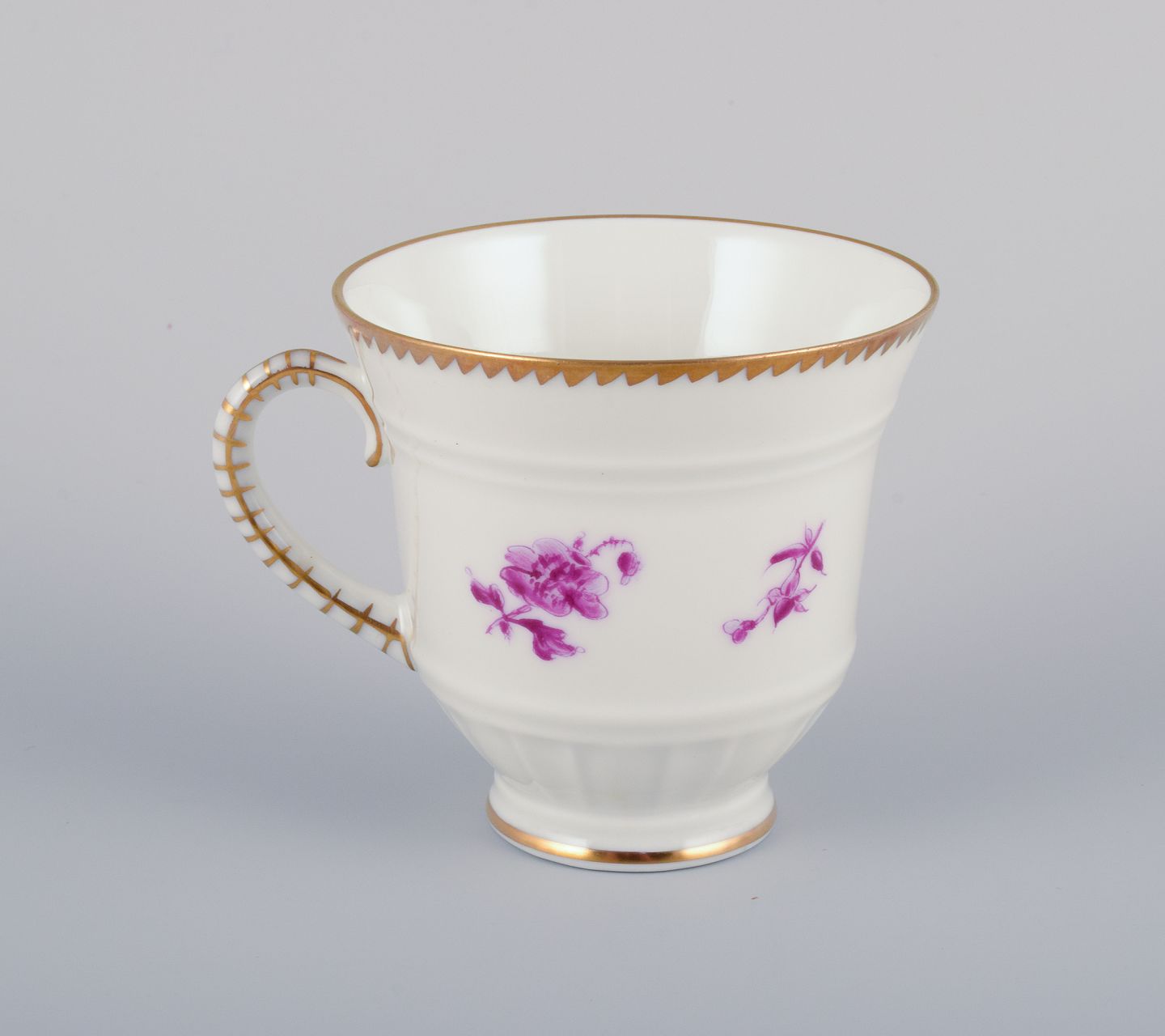 Bing & Grøndahl, Danmark. Et sæt på seks kaffekopper og underkopper med blomsterdekorationer i purpur og guldkant. Håndmalet.