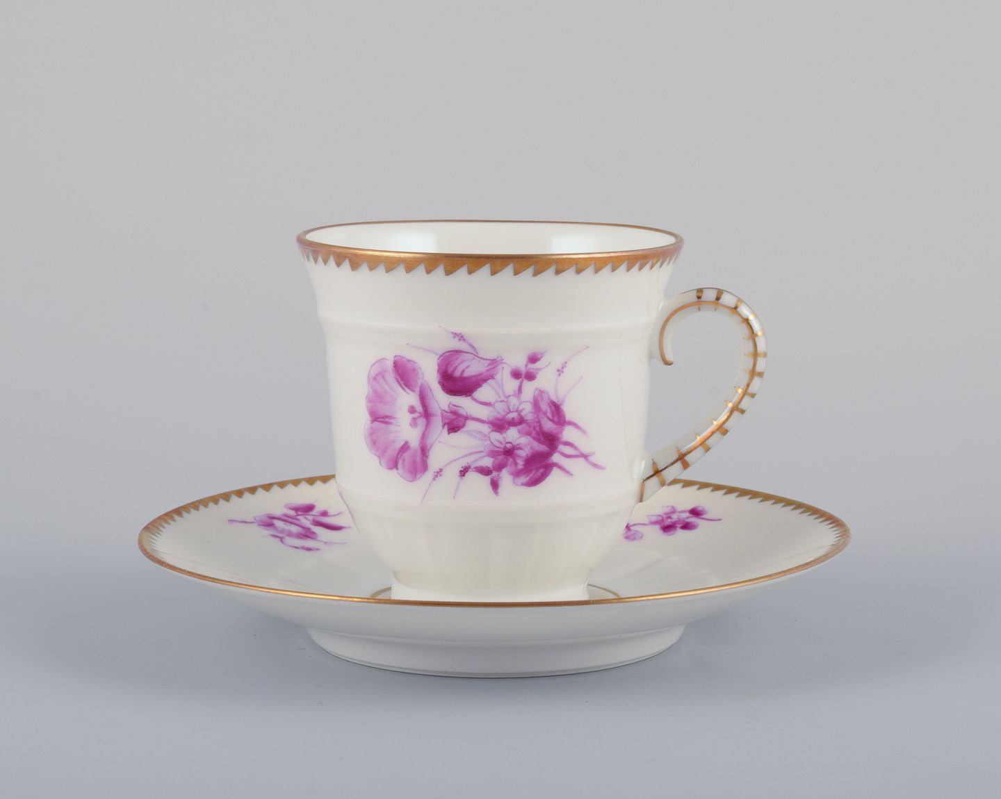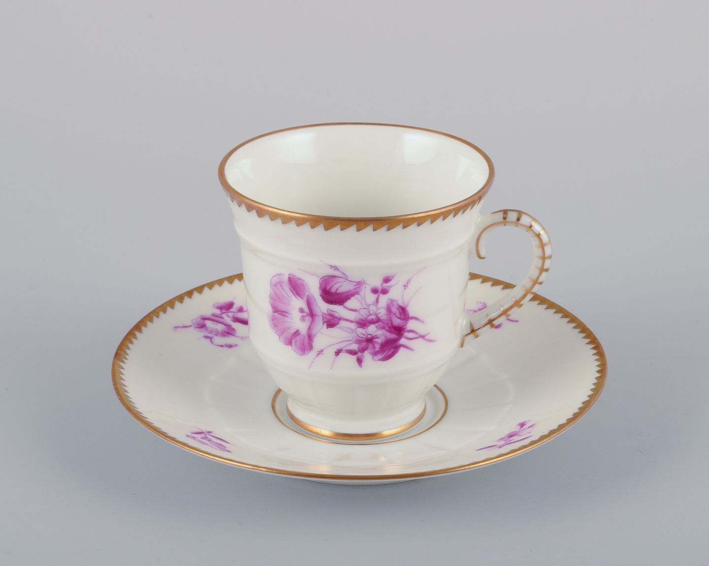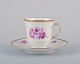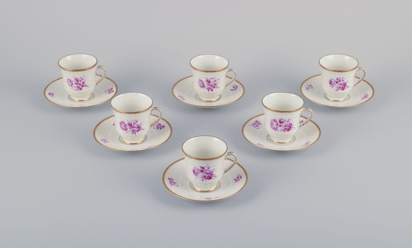 Bing & Grøndahl, Danmark. Et sæt på seks mokkakopper med tilhørende underkopper dekoreret med blomstermotiver i purpur og guldkant. Håndmalet.