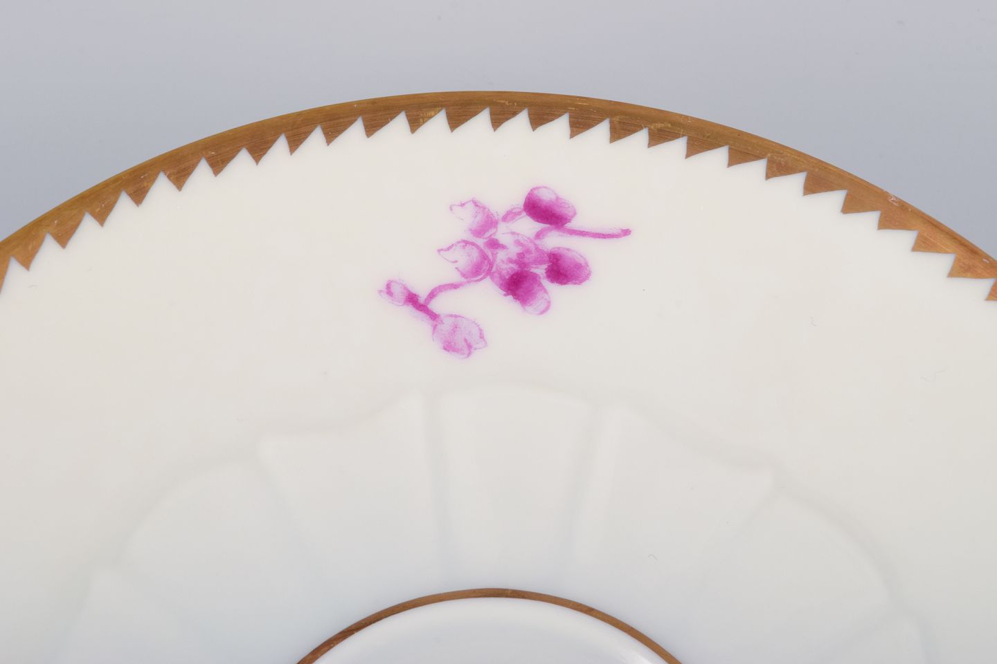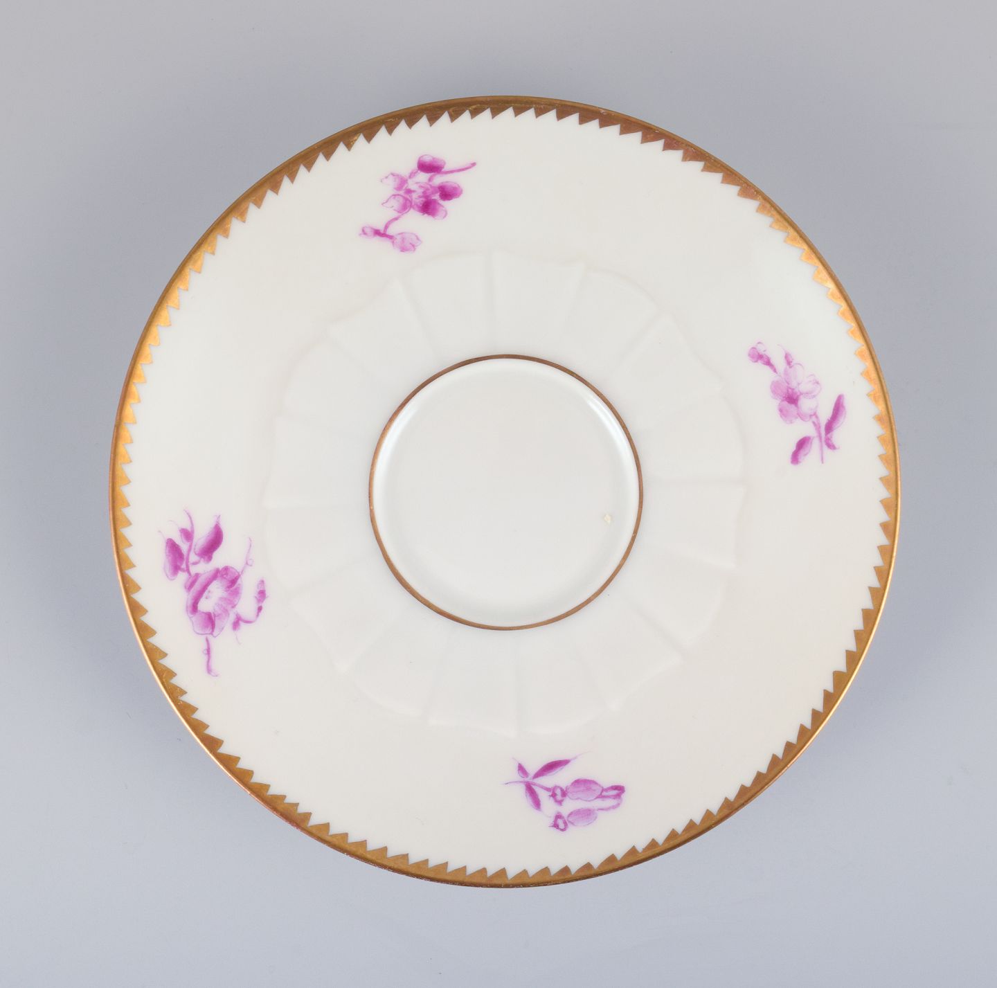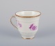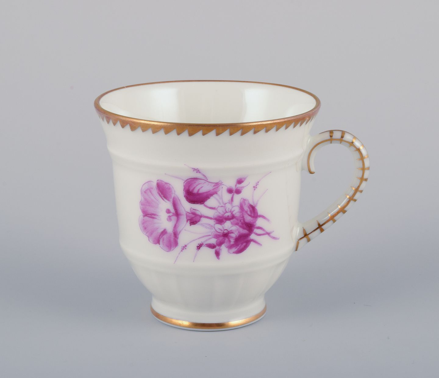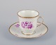Bing & Grøndahl, Danmark. Et sæt på seks mokkakopper med tilhørende underkopper dekoreret med blomstermotiver i purpur og guldkant. Håndmalet.
