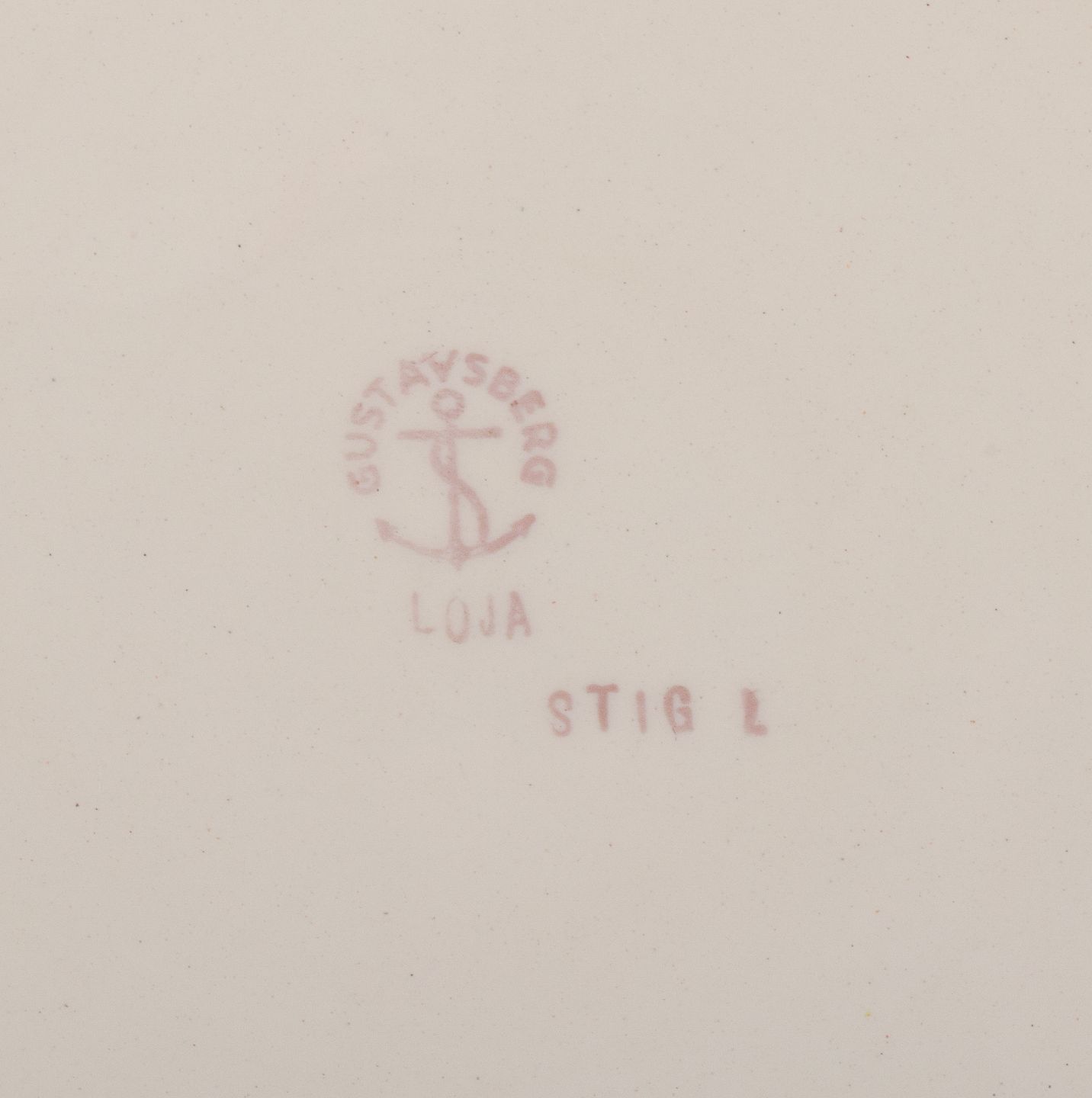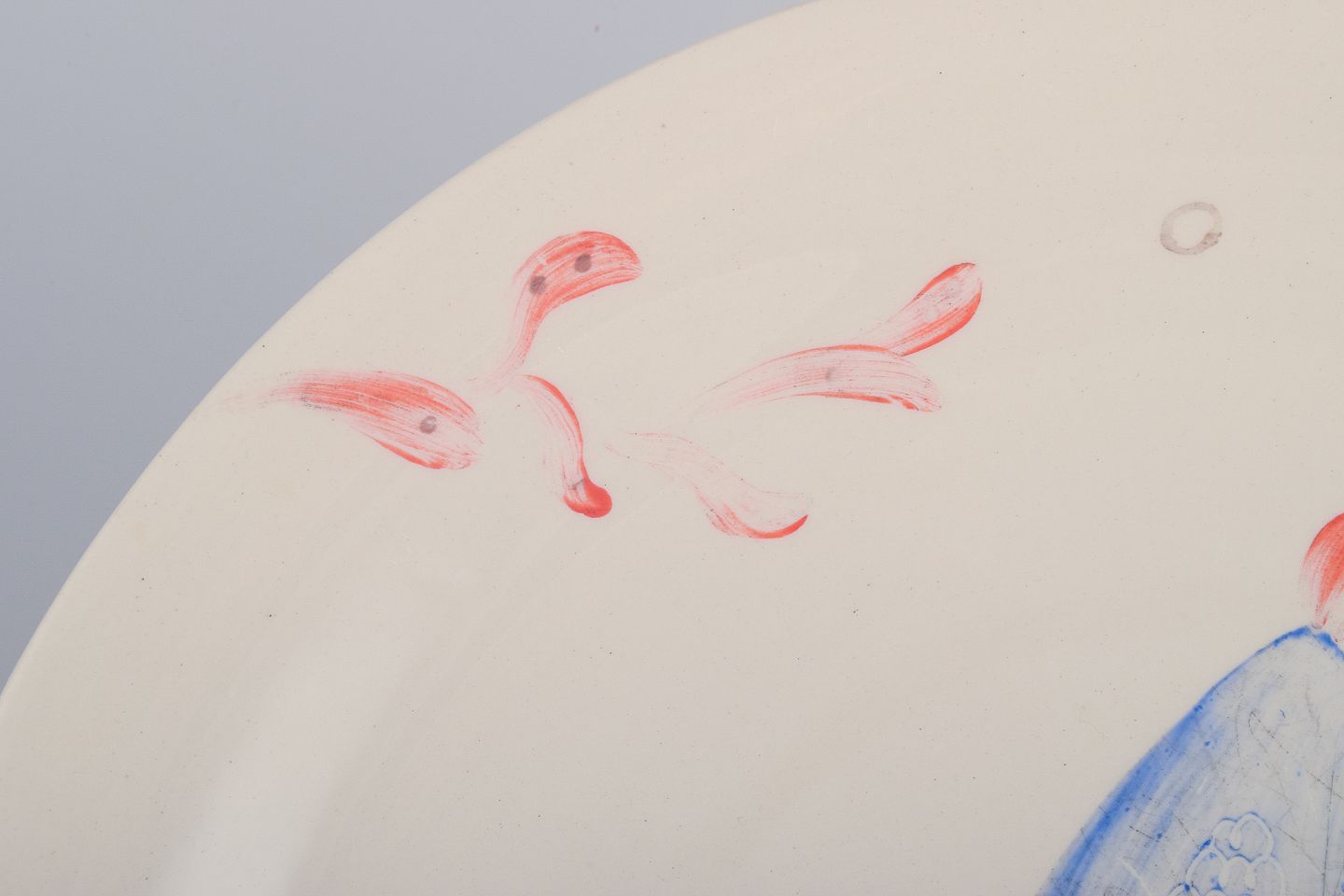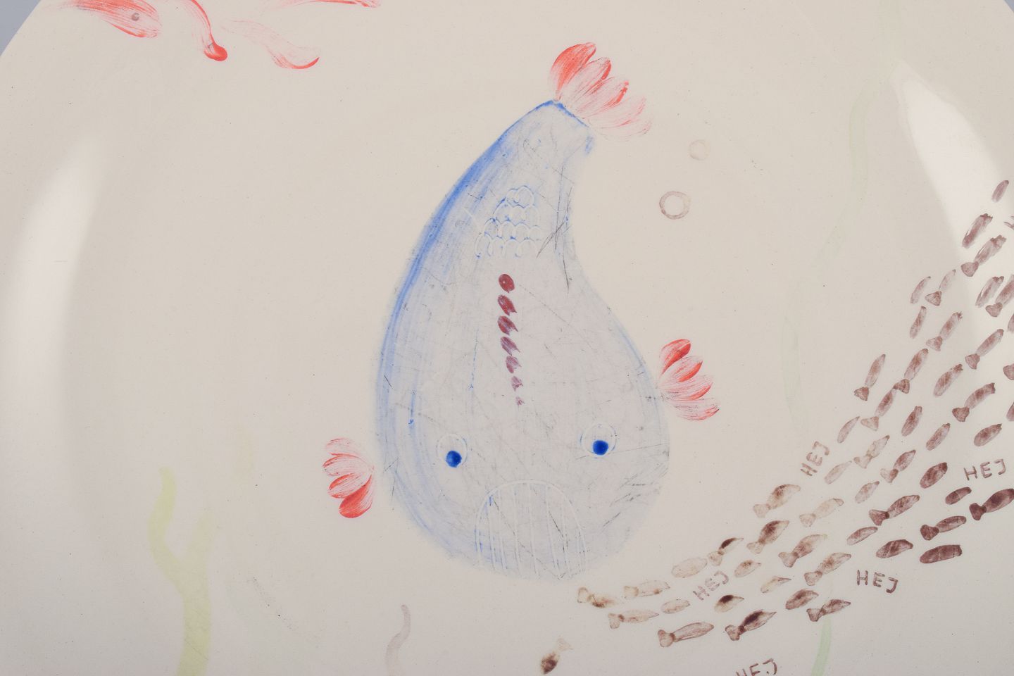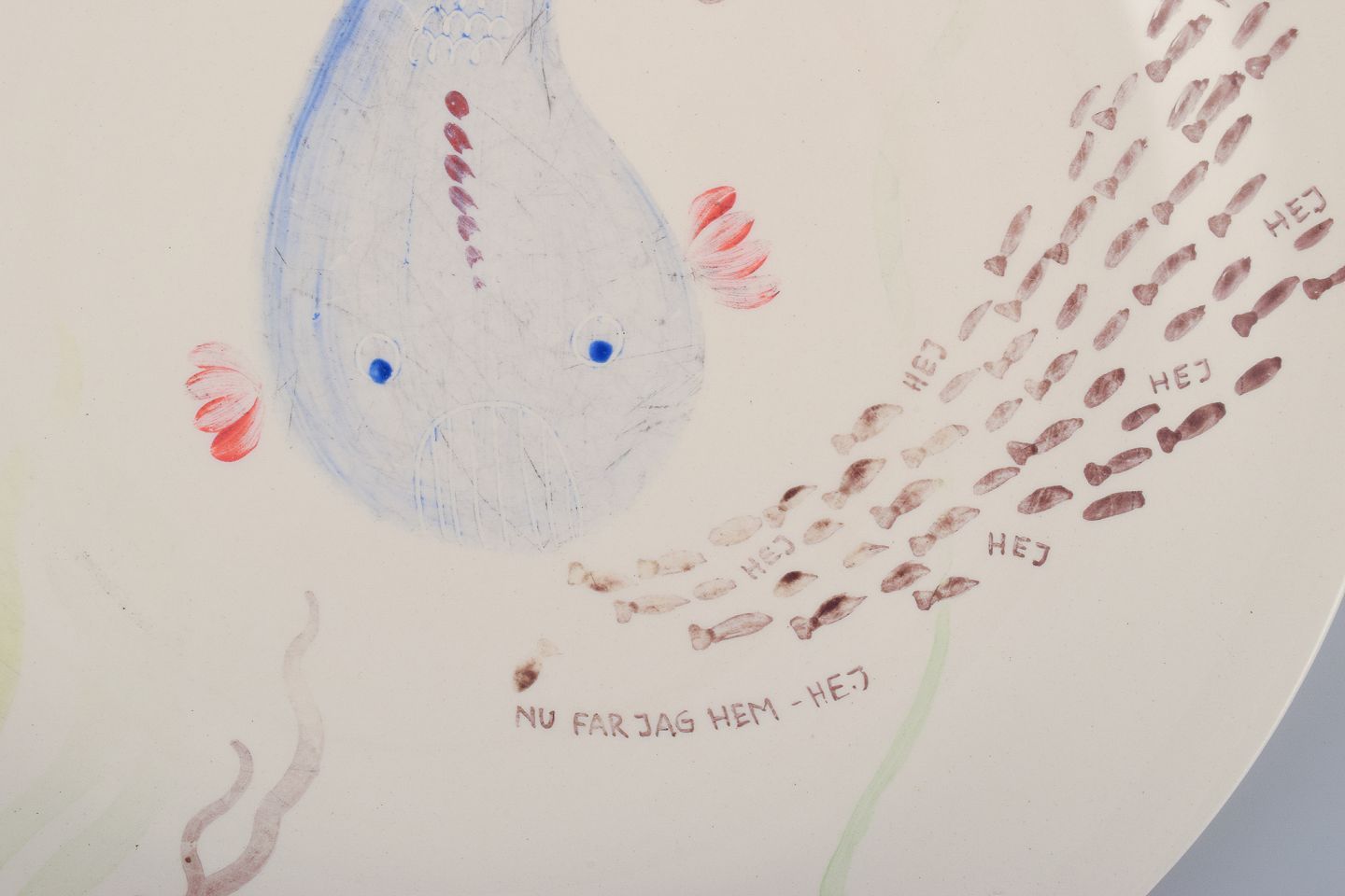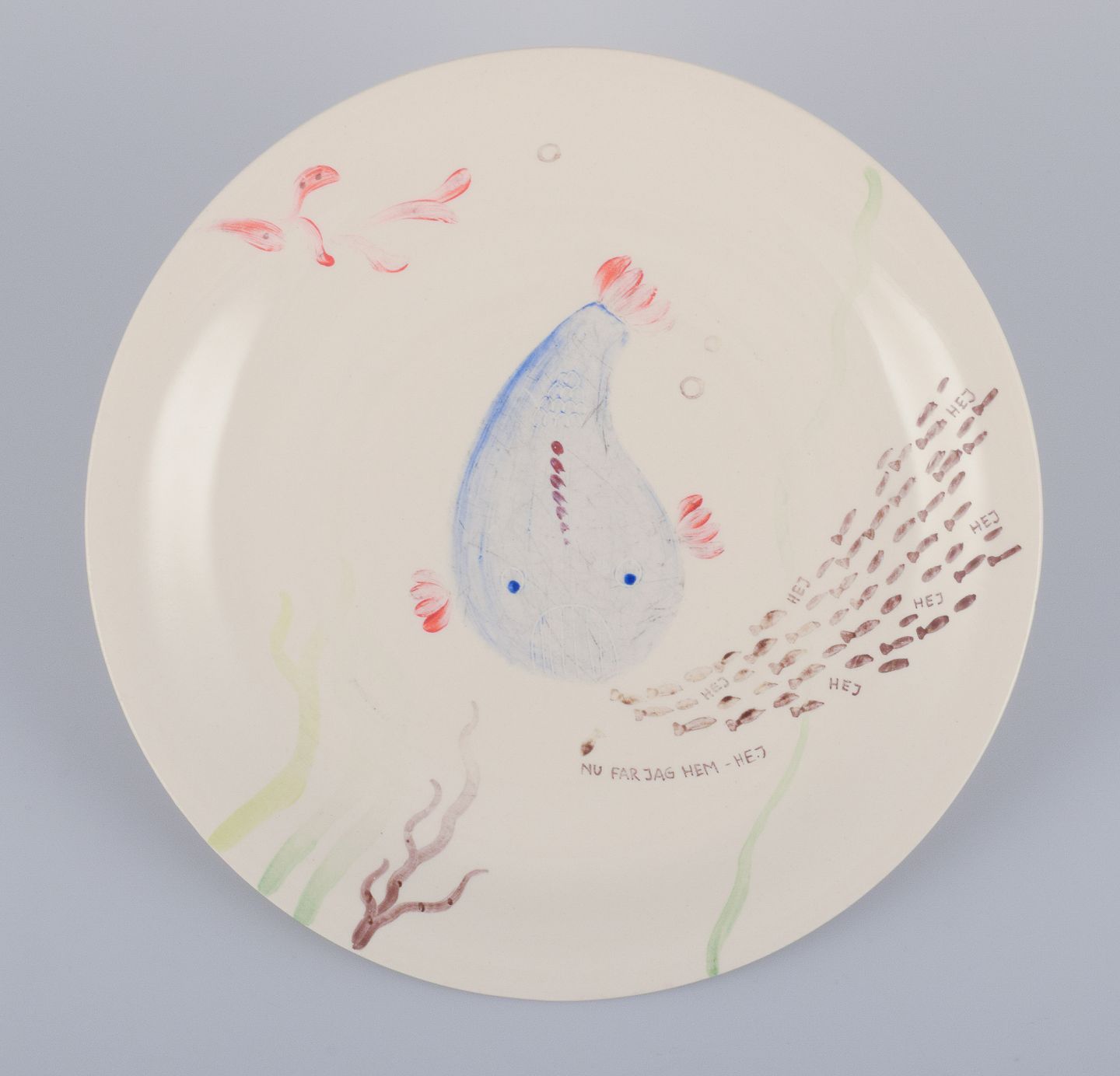 Stig Lindberg for Gustavsberg. "Löja" tallerken. Håndmalet med fiskemotiv. Satirisk motiv med svensk tekst.