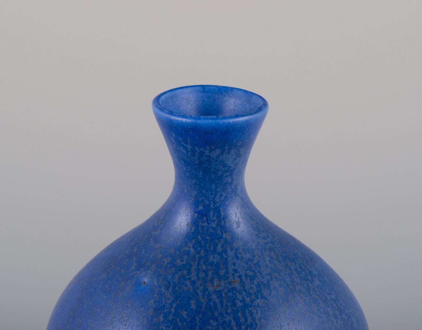 Berndt Friberg (1899-1981) for Gustavsberg, Sverige. Keramikvase i blå glasur. Buttet form. 1960/70’erne. Etiket. I god stand med ubetydeligt skår i bunden. Se foto. Mål: H 8,0 cm. x D 6,0 cm.