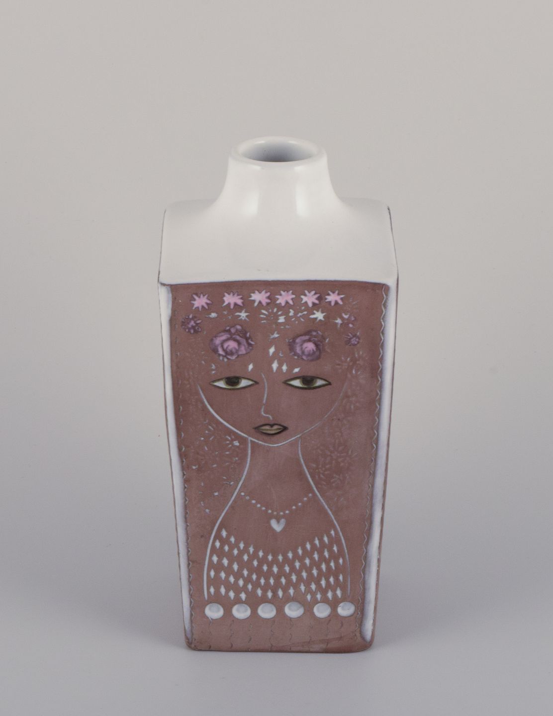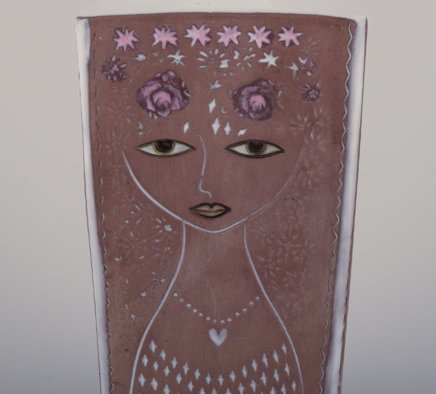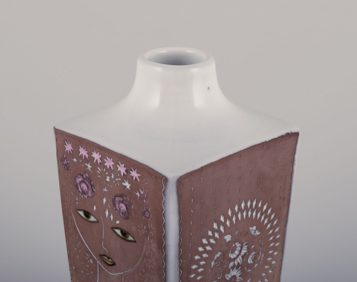 Mari Simmulson (1911-2000) for Upsala Ekeby, Sverige. Keramikvase i firkantet form. Blomster og kvindemotiv. Ca. 1960. Modelnummer 43130/955. Stemplet. Perfekt stand. Mål: H 23,2 cm. x D 9,5 cm.