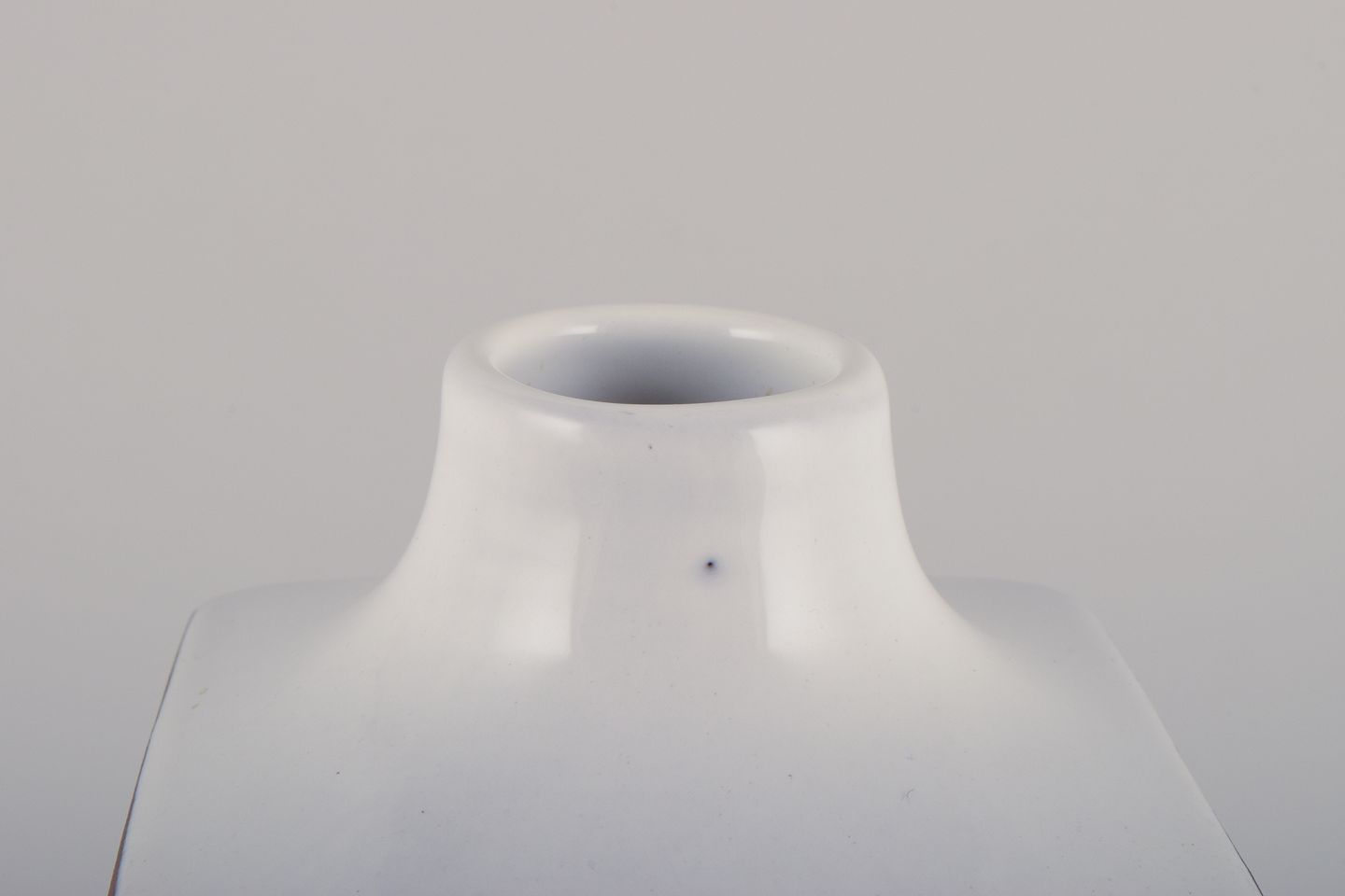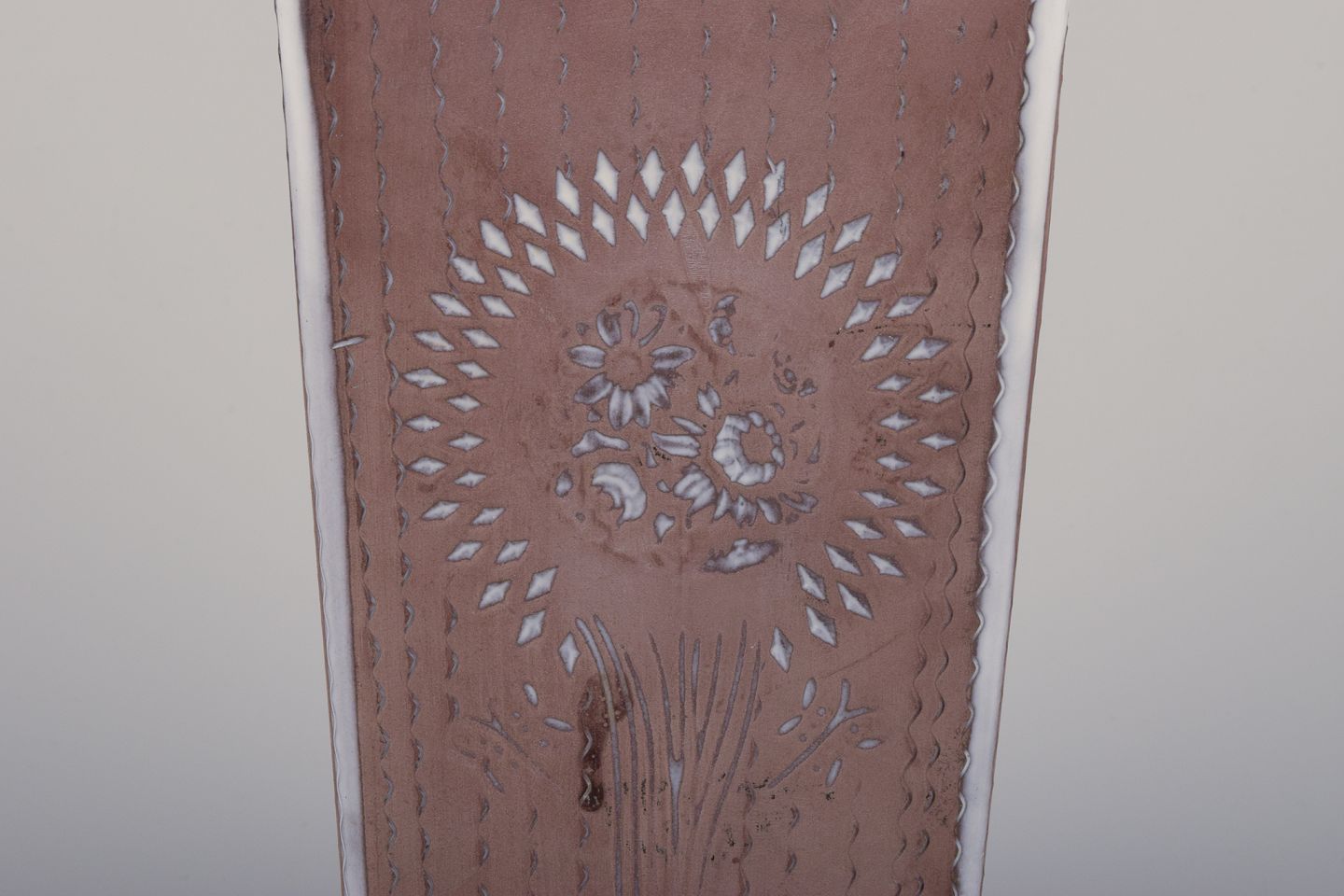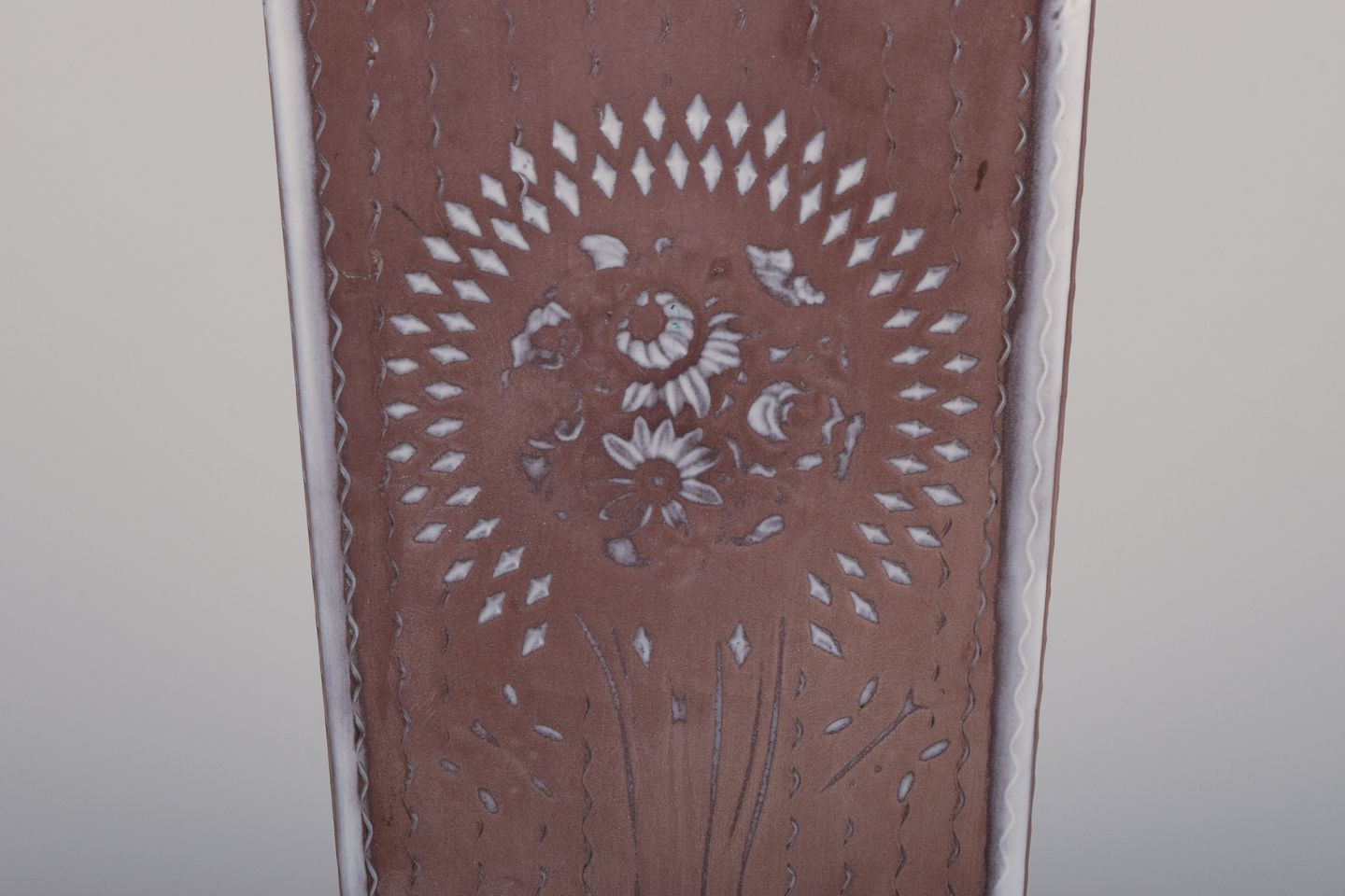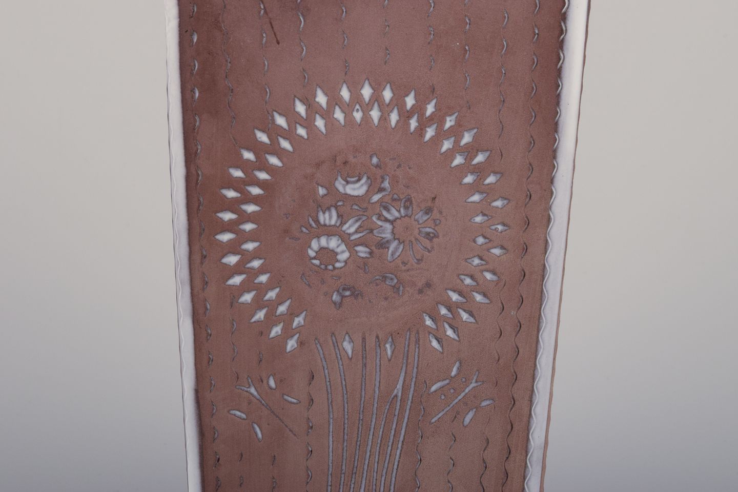 Mari Simmulson (1911-2000) for Upsala Ekeby, Sverige. Keramikvase i firkantet form. Blomster og kvindemotiv. Ca. 1960. Modelnummer 43130/955. Stemplet. Perfekt stand. Mål: H 23,2 cm. x D 9,5 cm.
