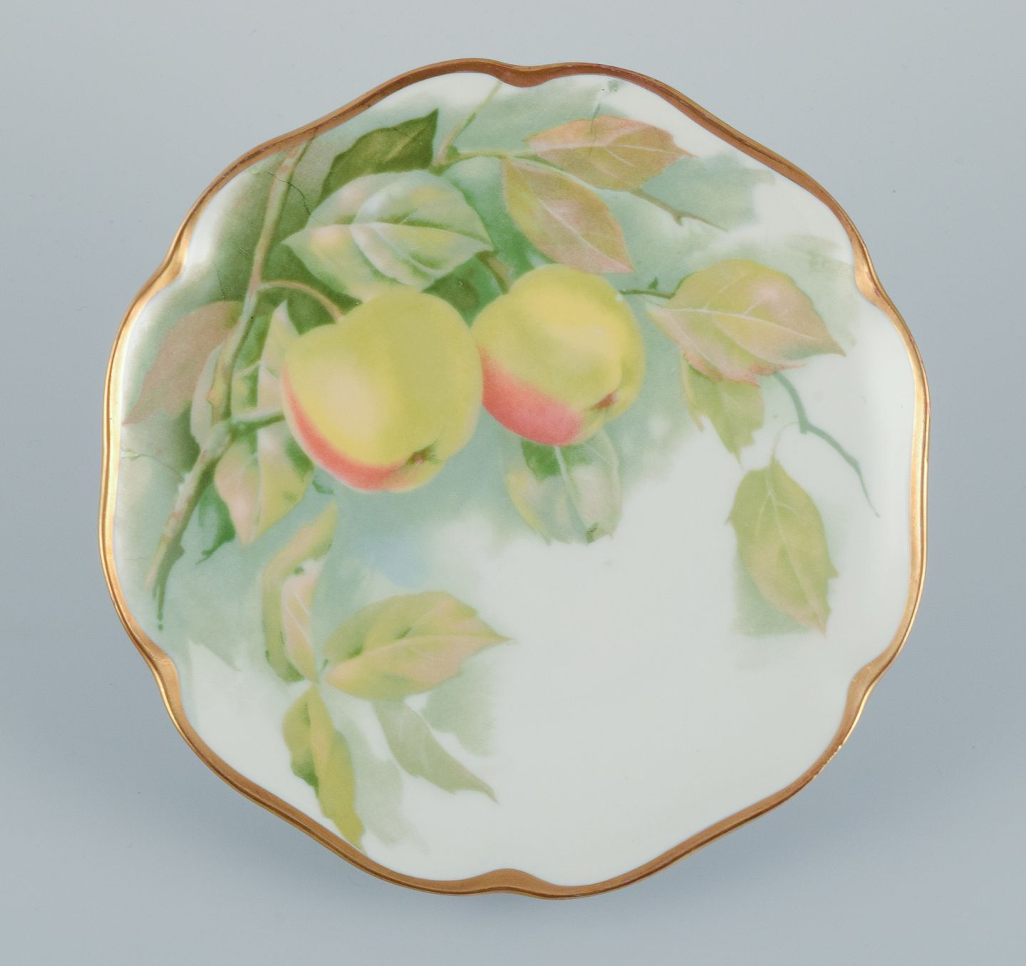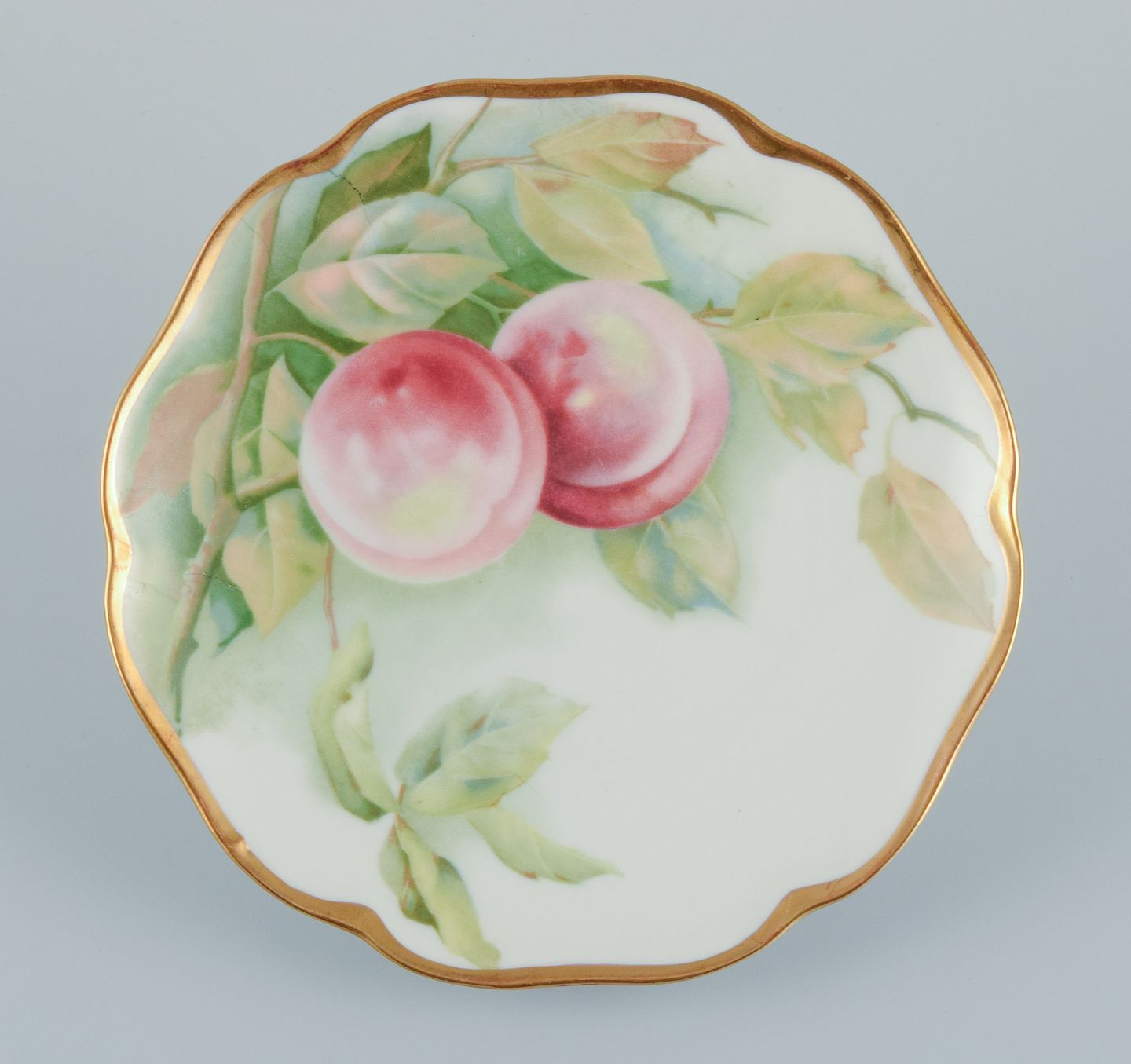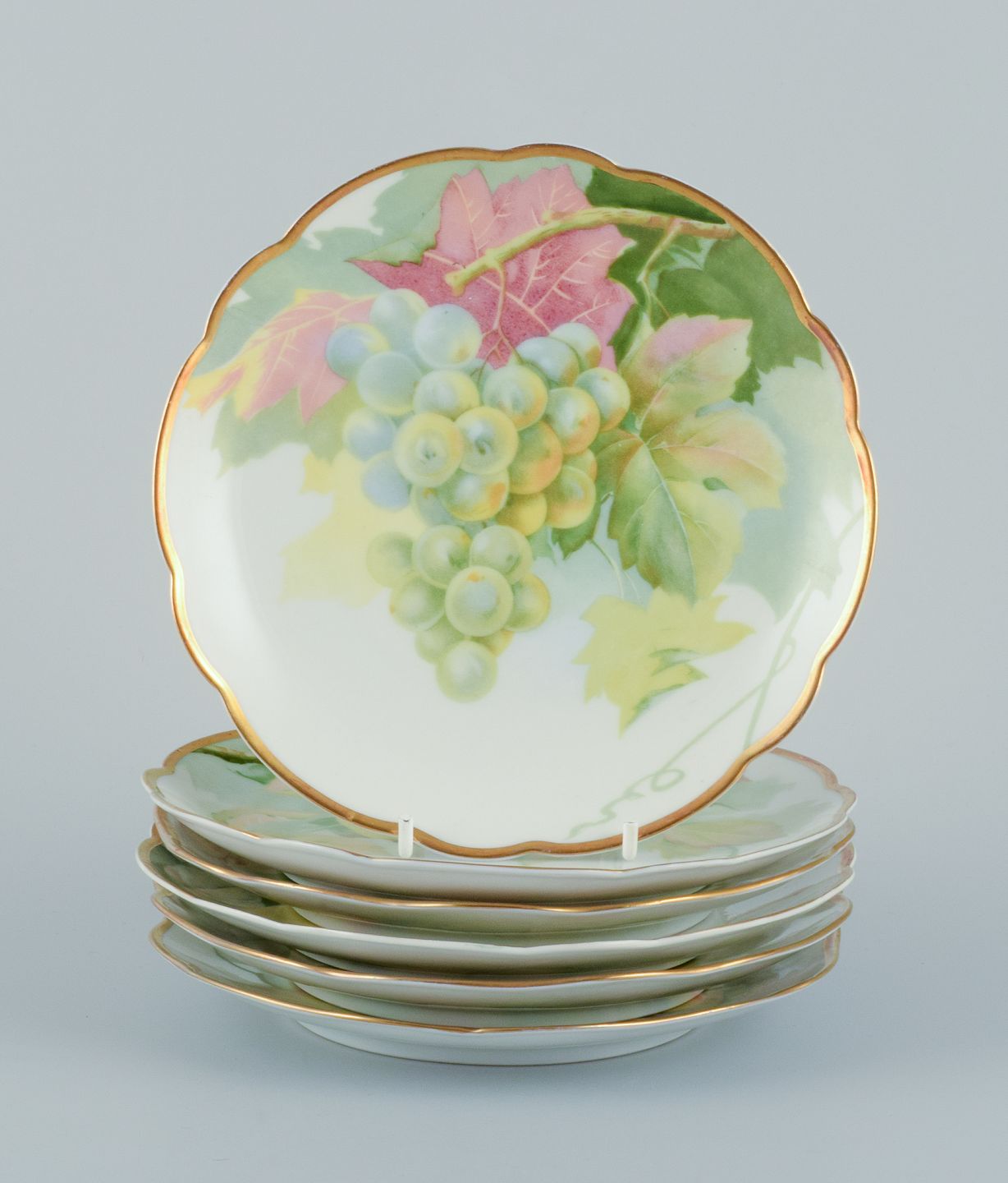 Rosenthal, Tyskland. Et sæt på seks porcelænstallerkner med forskellige frugtmotiver. Guldkant. Ca. 1930. Stemplet. Perfekt stand. Mål: D 17,3 cm.