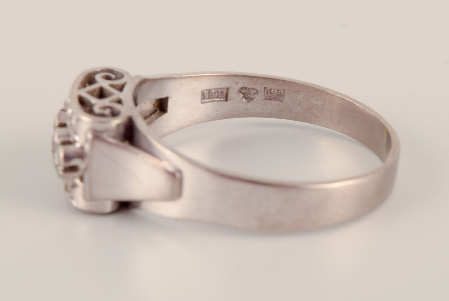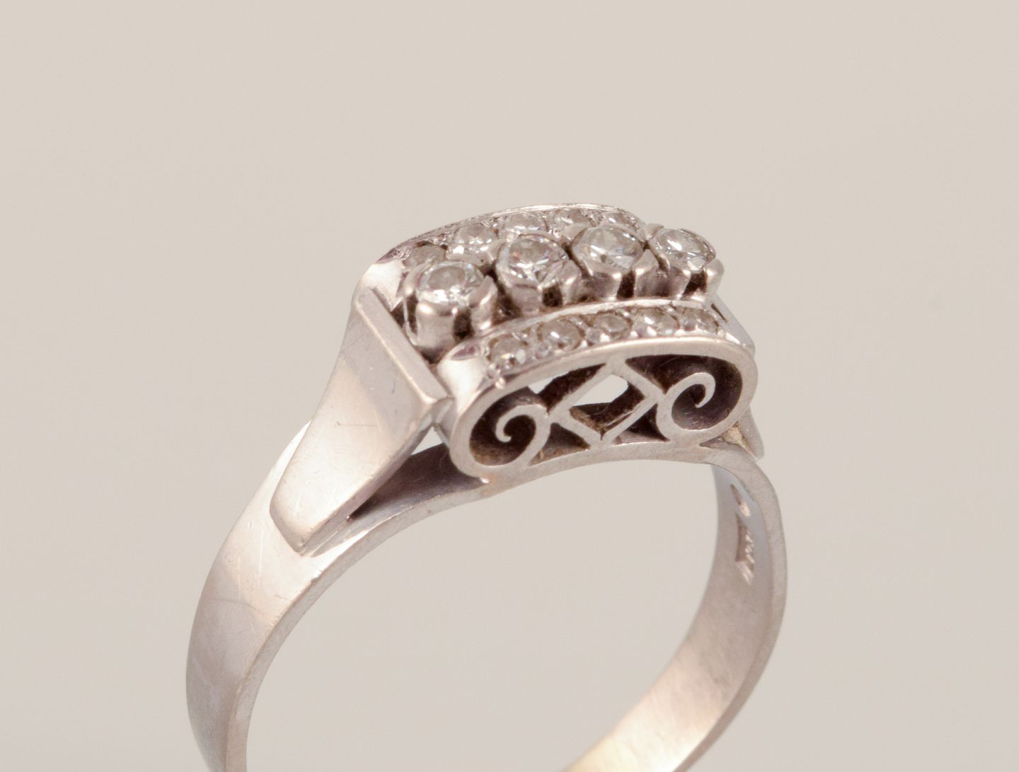 Svensk vintage 18 karat diamantring i hvidguld prydet med fire store diamanter samt ti små diamanter. Klassisk Art Deco-stil. Göteborg guldsmed.