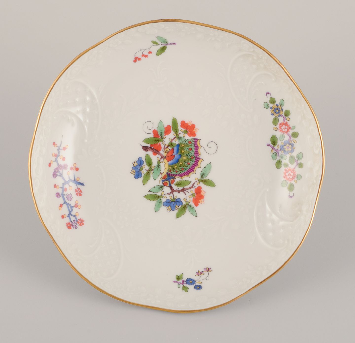 Meissen, Tyskland. Skål håndmalet med sommerfugl på gren og polykrome blomstermotiver. Guldkant. Ca. 1930’erne. Stemplet. Perfekt stand. Første sortering. Mål: D 17,0 cm. x H 3,5 cm.