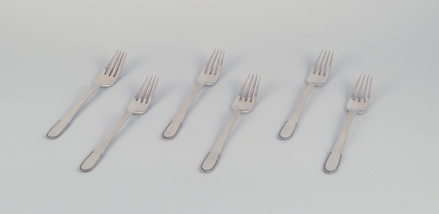Georg Jensen, et sæt på seks Kugle middagsgafler i tretårnet sølv. Stempel fra 1926-1928. Perfekt stand. Fremstå som nye. Mål: L 19,4 cm.