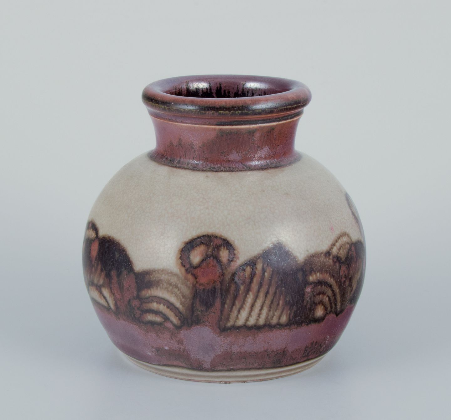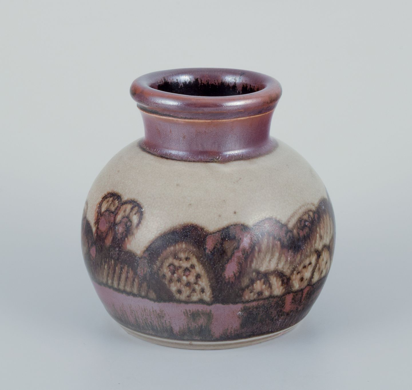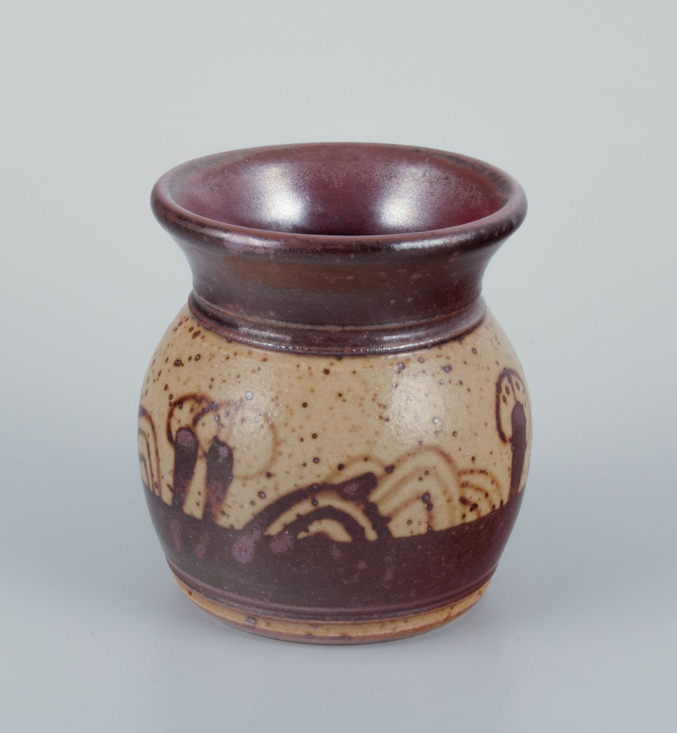 Elly Kuch (1929-2008) og Wilhelm Kuch (1925-2022). To unika keramikvaser. Glasur i brune og sandfarvet nuancer. Abstrakte motiver. 1980’erne. Signeret. I perfekt stand. Største: H 8,0 cm. x D 7,5 cm.