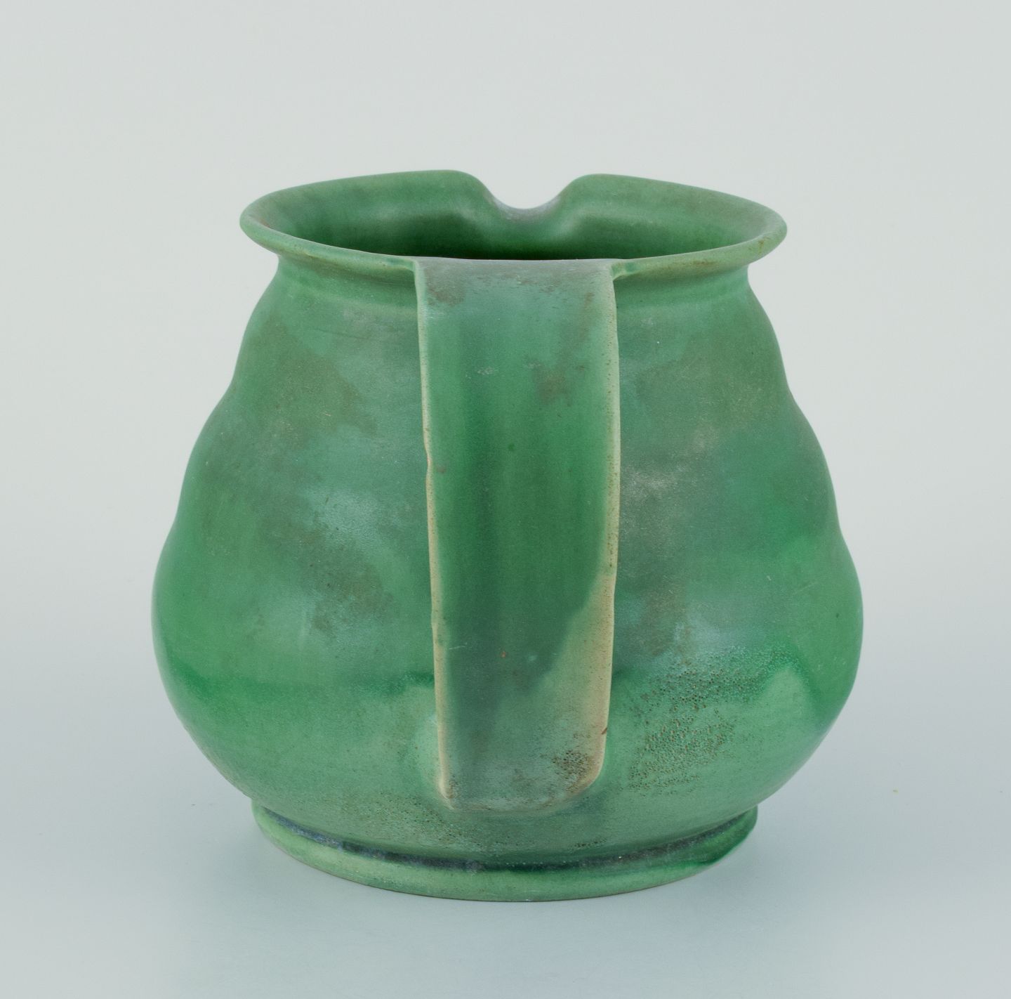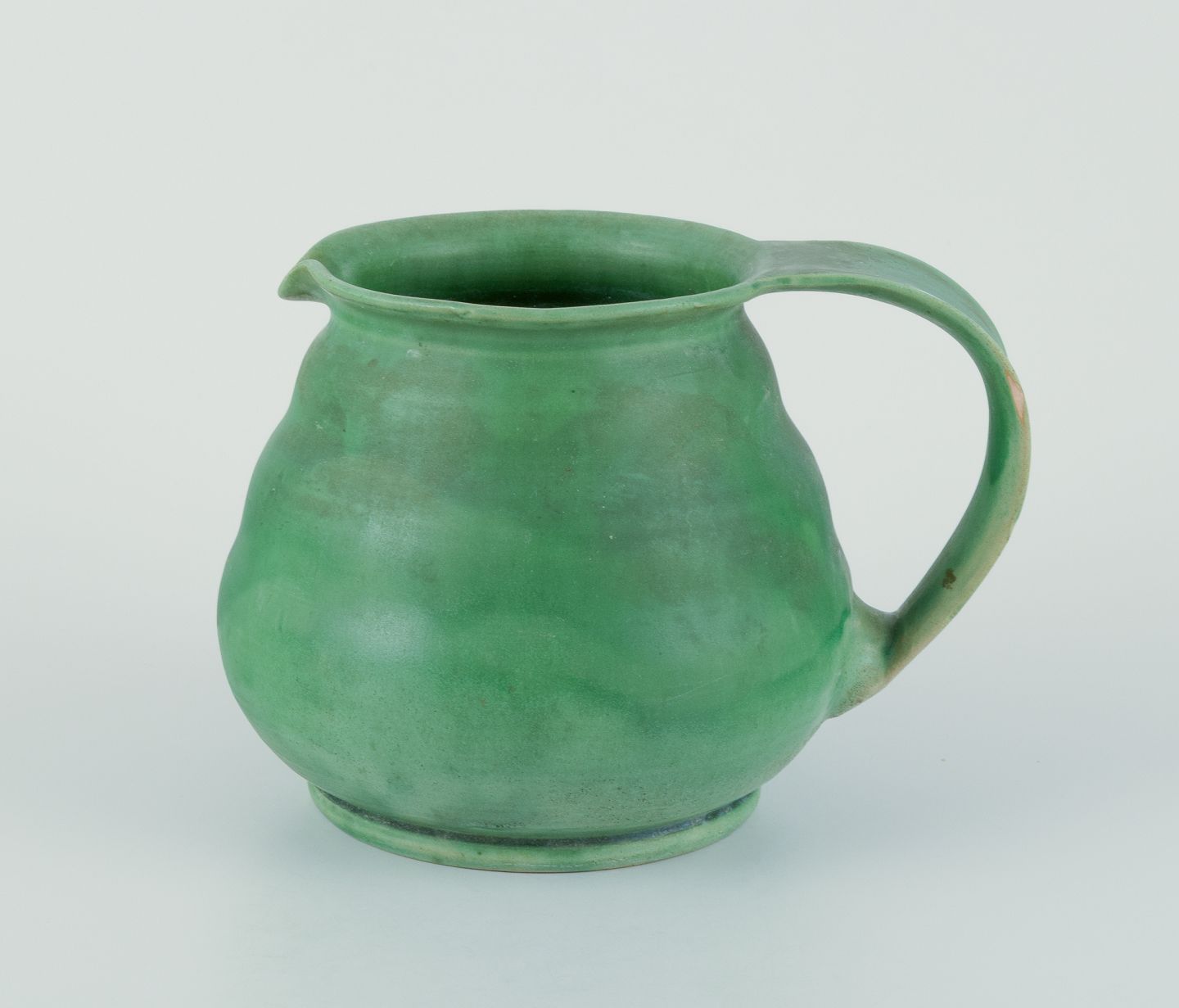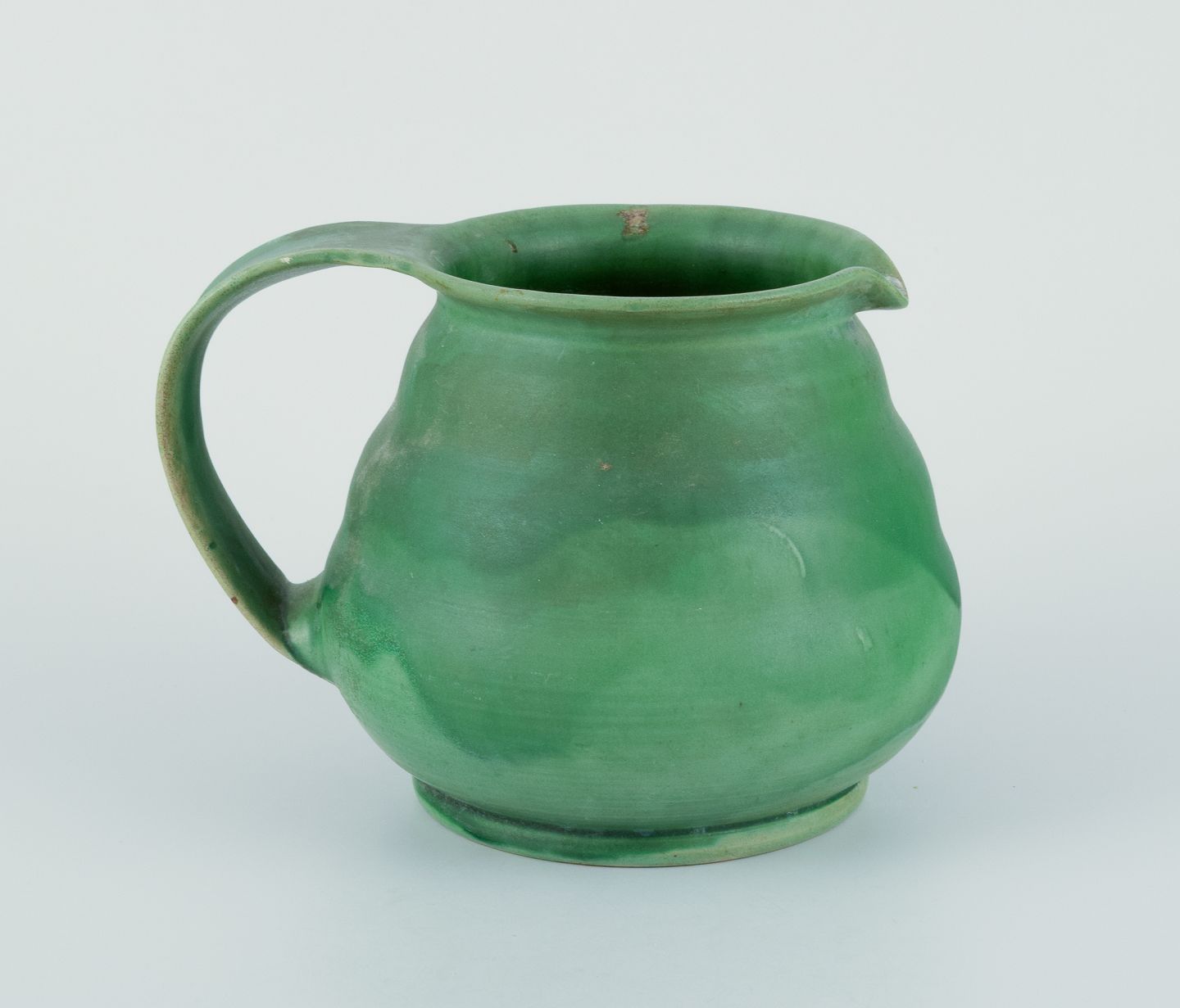 Kähler, Danmark. Kande i keramik. Glasur i grønne nuancer. Ca. 1930/40’erne. Stemplet. I flot stand med minimalt glasur afslag på hanken. Se foto. Mål: H 12,0 cm. x D 17,0 cm. inklusive hank.