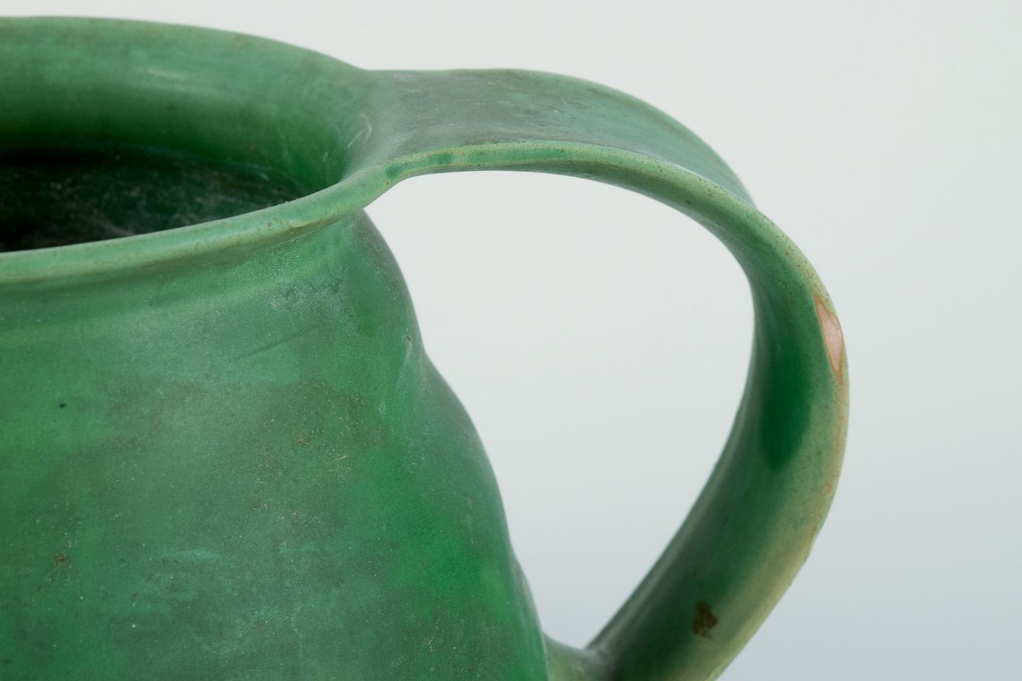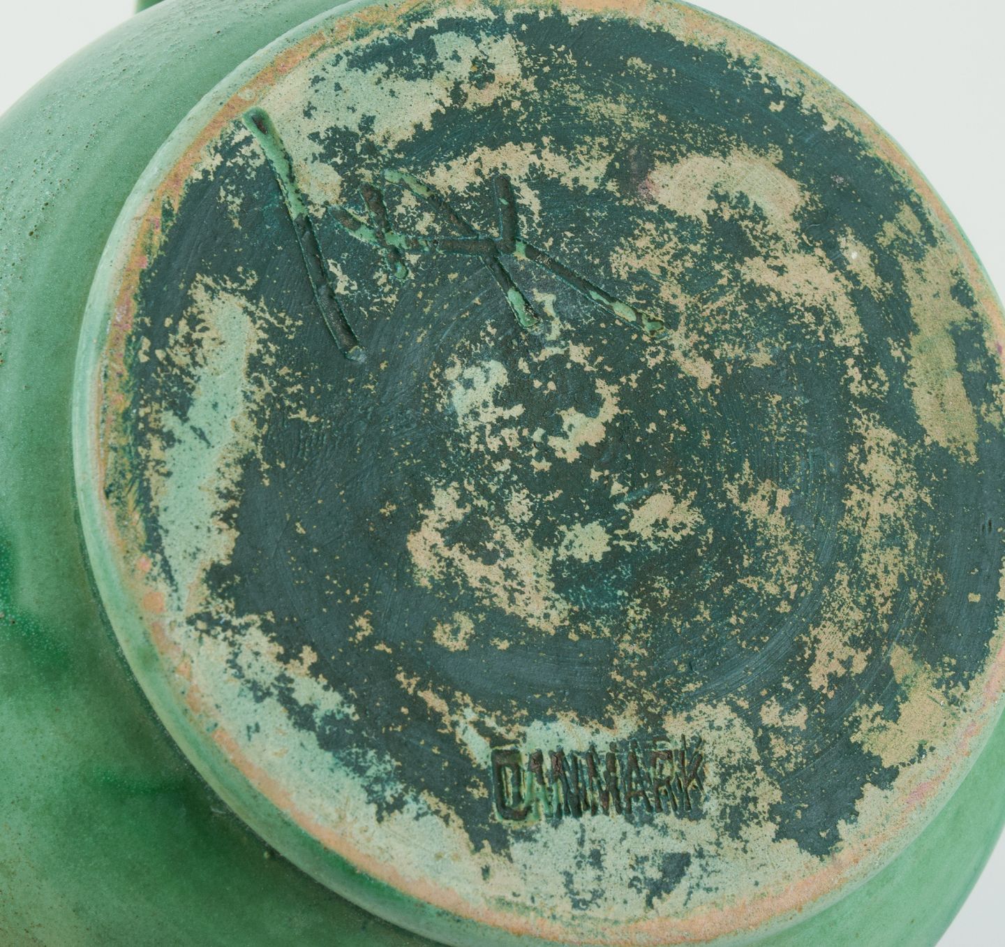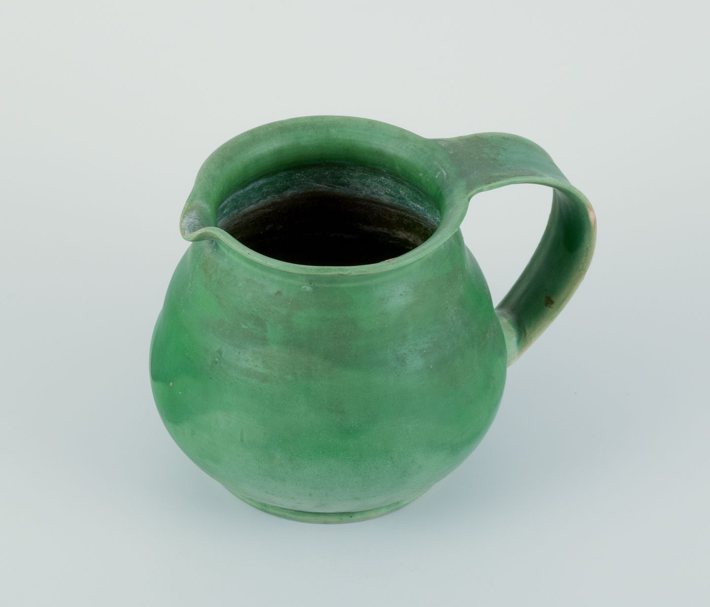 Kähler, Danmark. Kande i keramik. Glasur i grønne nuancer. Ca. 1930/40’erne. Stemplet. I flot stand med minimalt glasur afslag på hanken. Se foto. Mål: H 12,0 cm. x D 17,0 cm. inklusive hank.