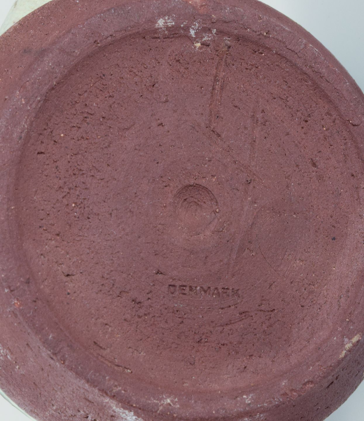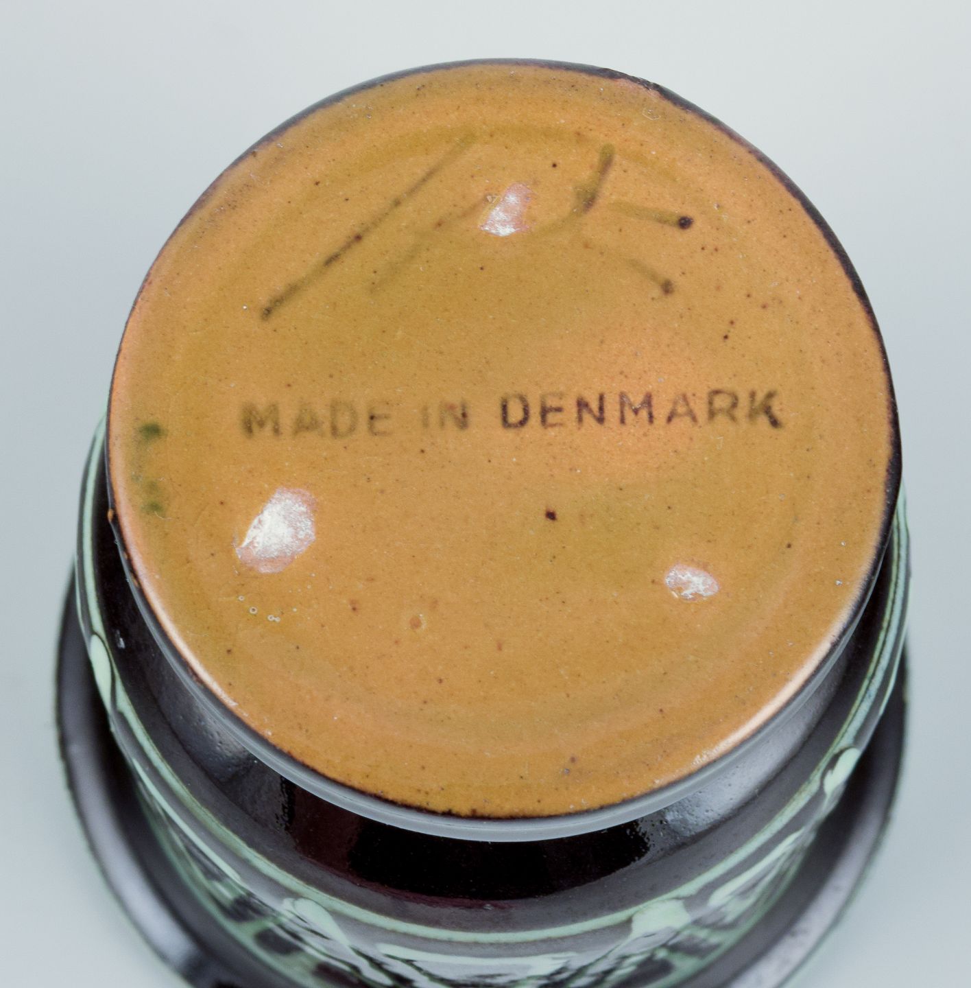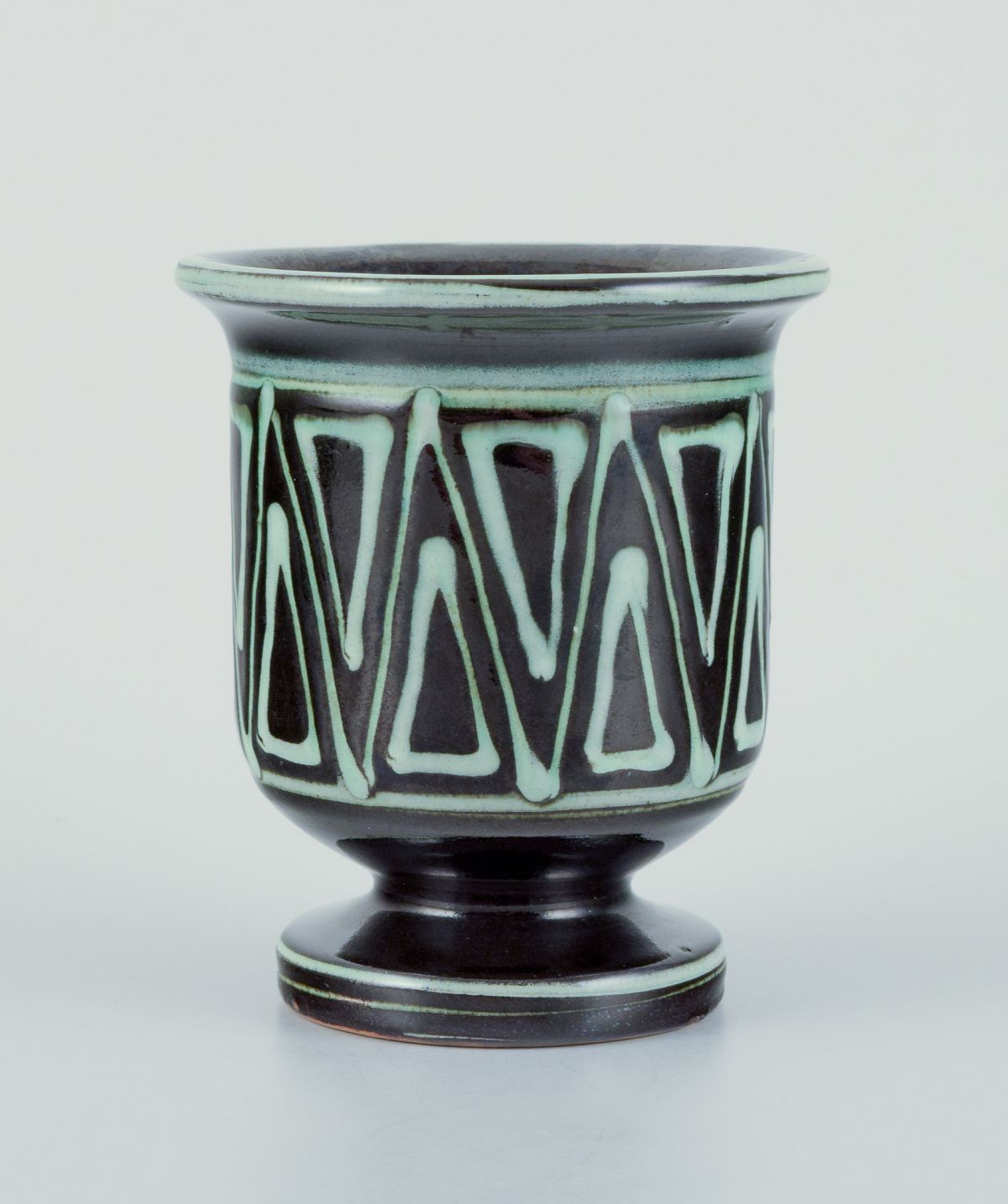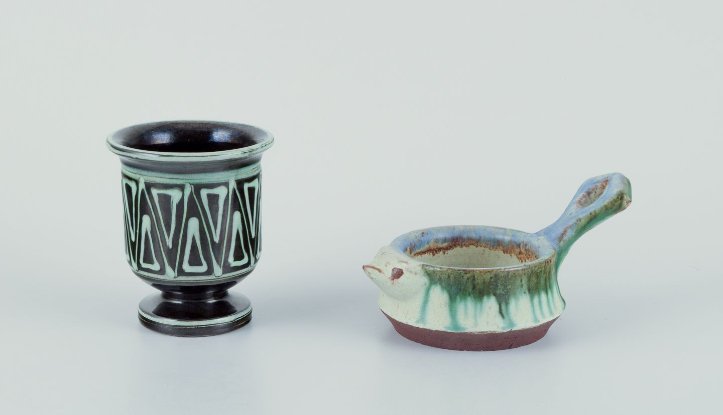 Kähler, Danmark. Lille vase og lille skål med hank udformet som en fugl. Håndlavet keramik. Vase med geometrisk mønster.