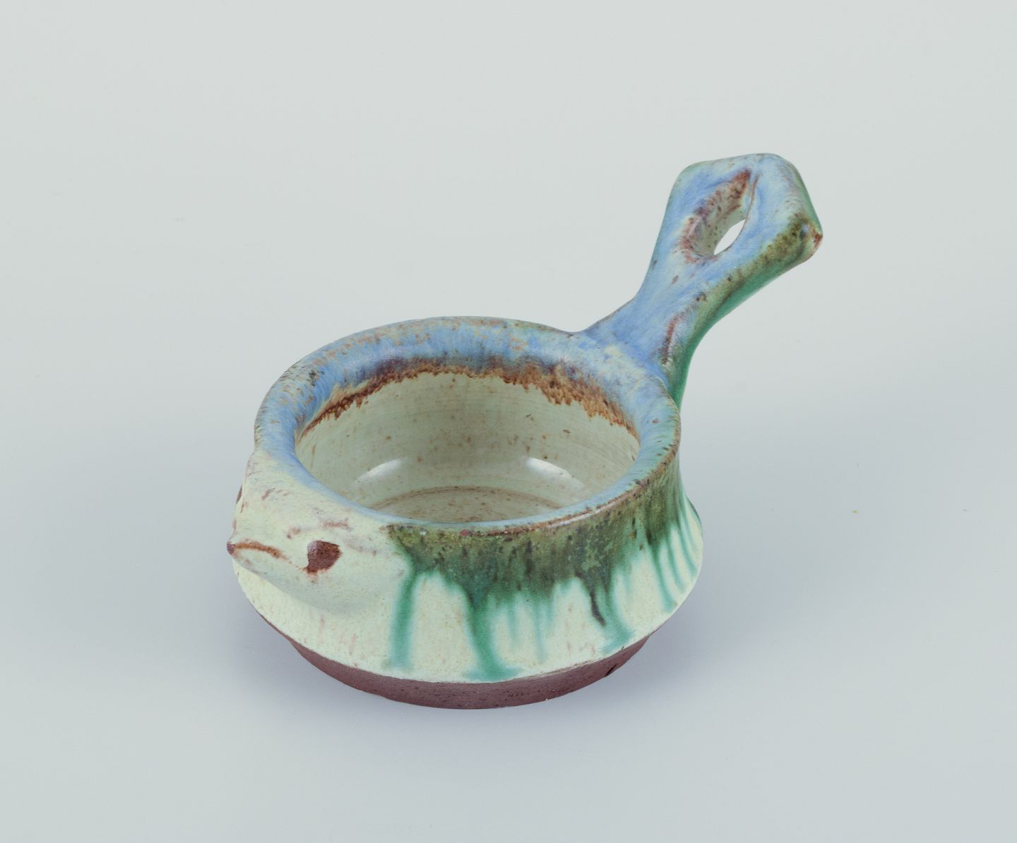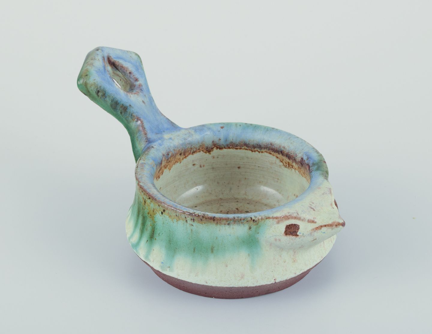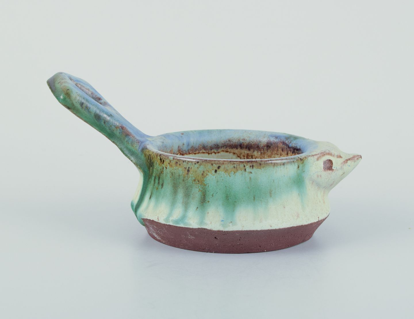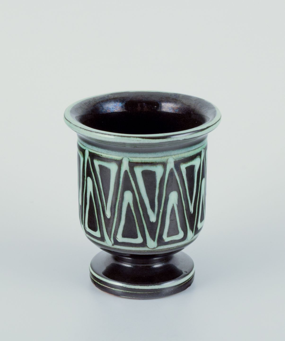 Kähler, Danmark. Lille vase og lille skål med hank udformet som en fugl. Håndlavet keramik. Vase med geometrisk mønster.