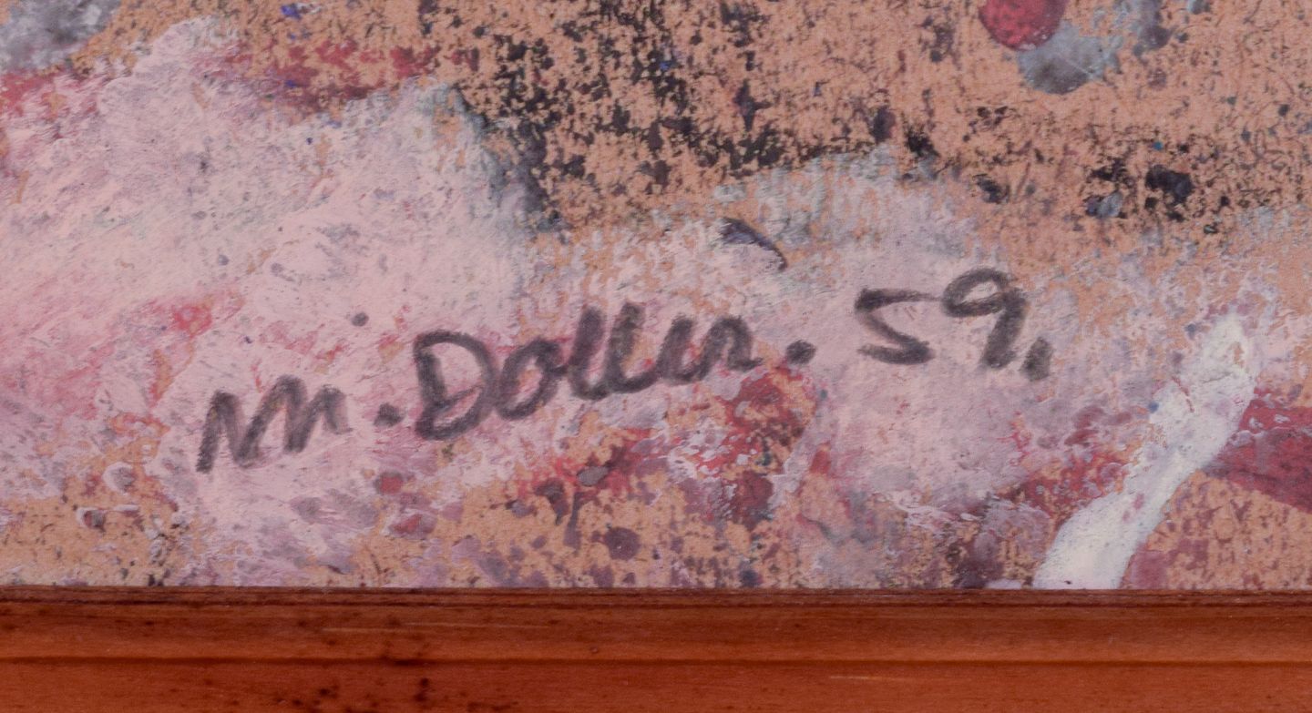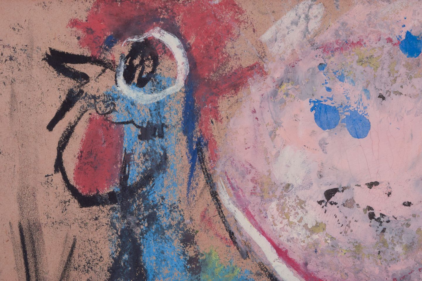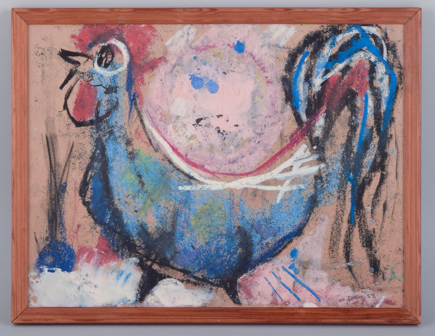Mette Doller (f. 1925), dansk kunstner. Mixed media på papir. Hane. Dateret 1959.