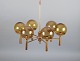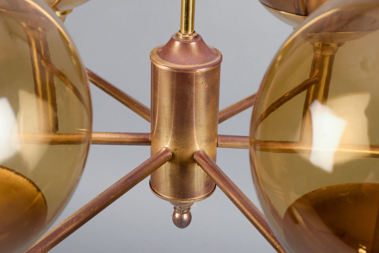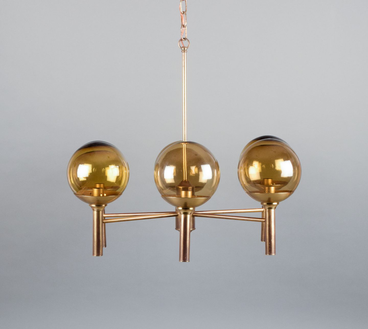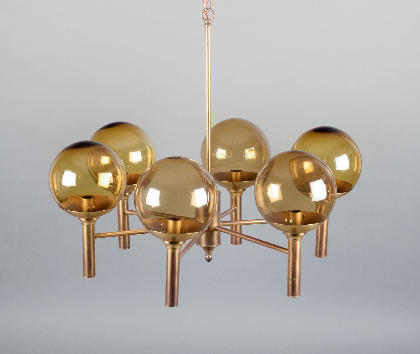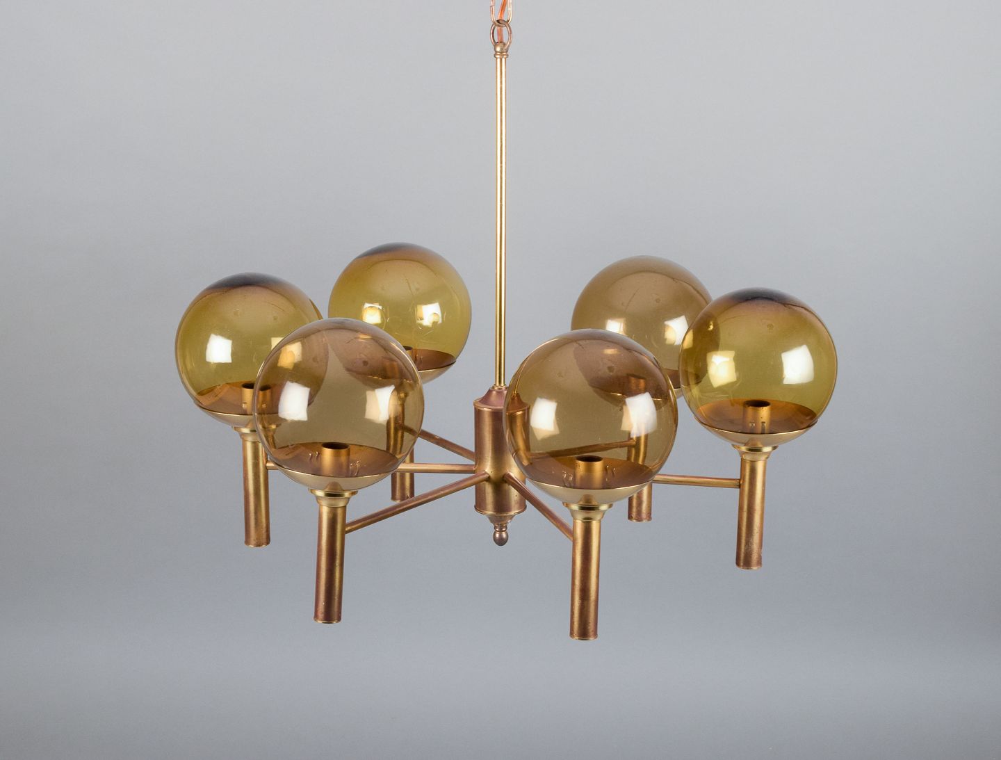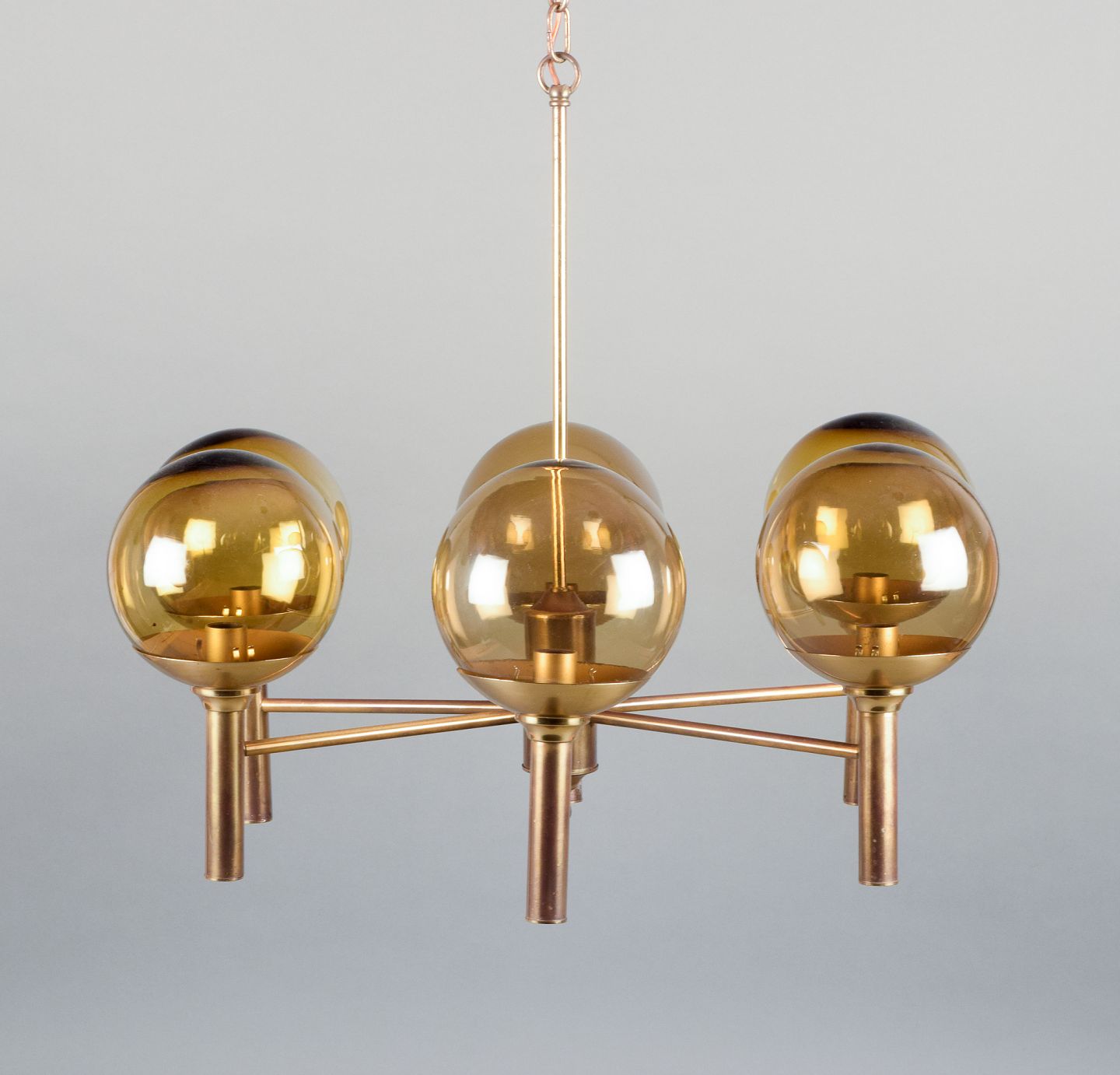 Sv. Mejlstrøm, dansk designer. Lysekrone af messing, seks arme med kuppelformede skærme af ravfarvet glas.