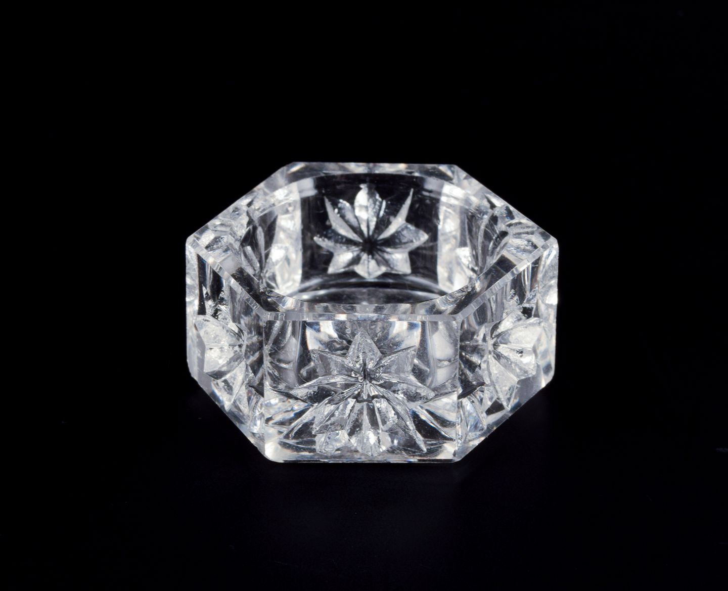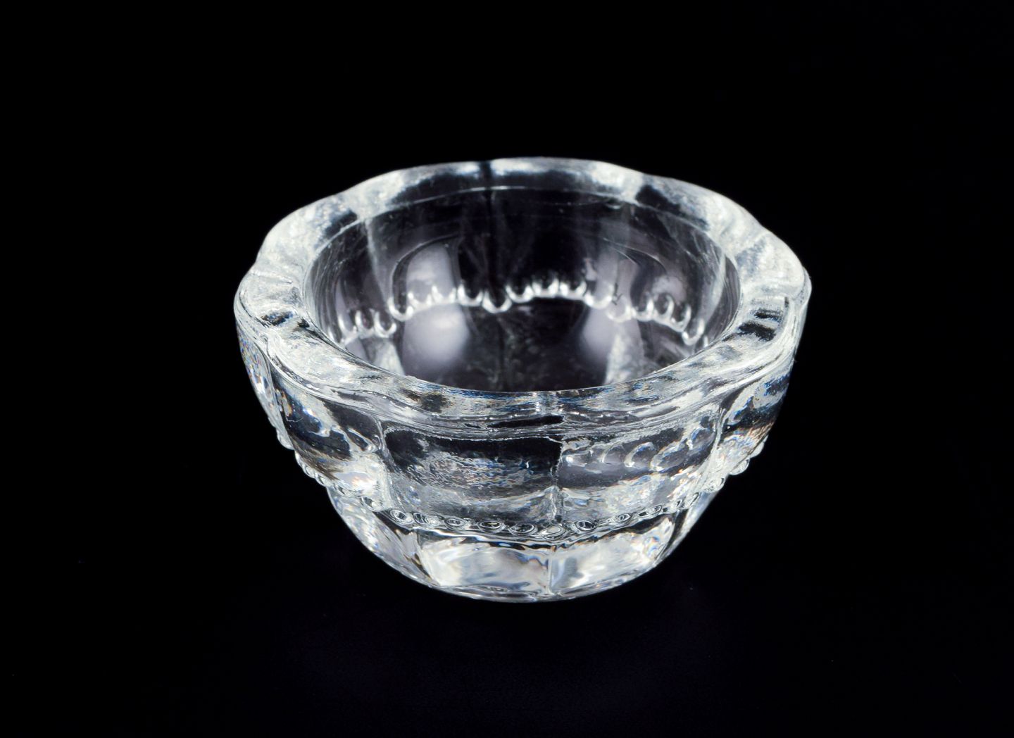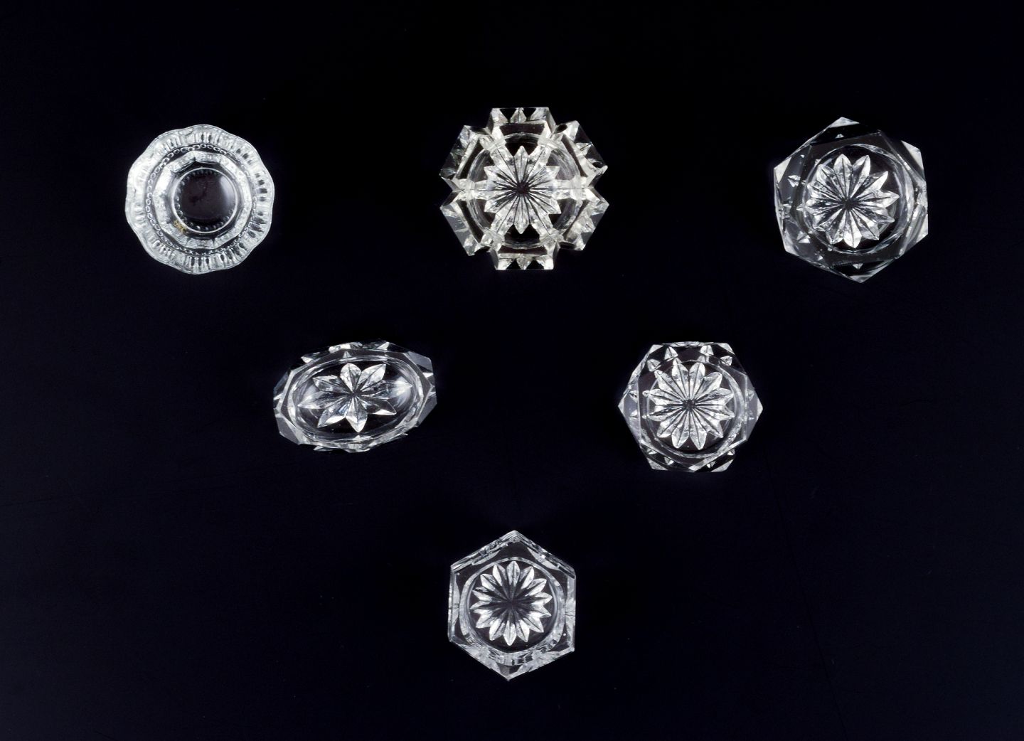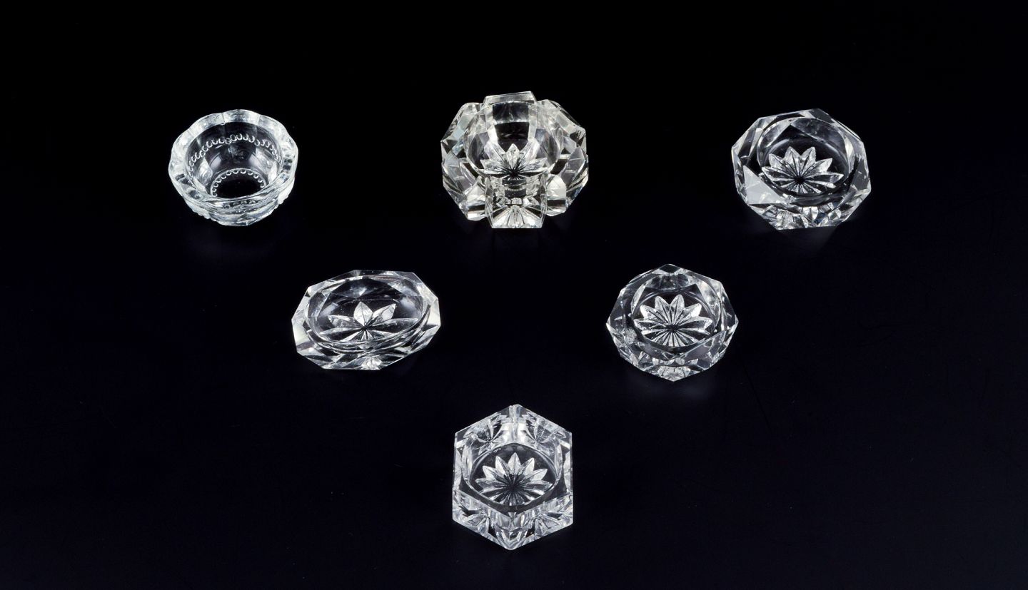 Fåglavik Glasbruk (1874-1980), Sverige. Seks saltkar i håndlavet klart glas. Privat svensk samling. Midt 1900-tallet. I flot stand. Største: D 5,0 cm. x H 2,5 cm.