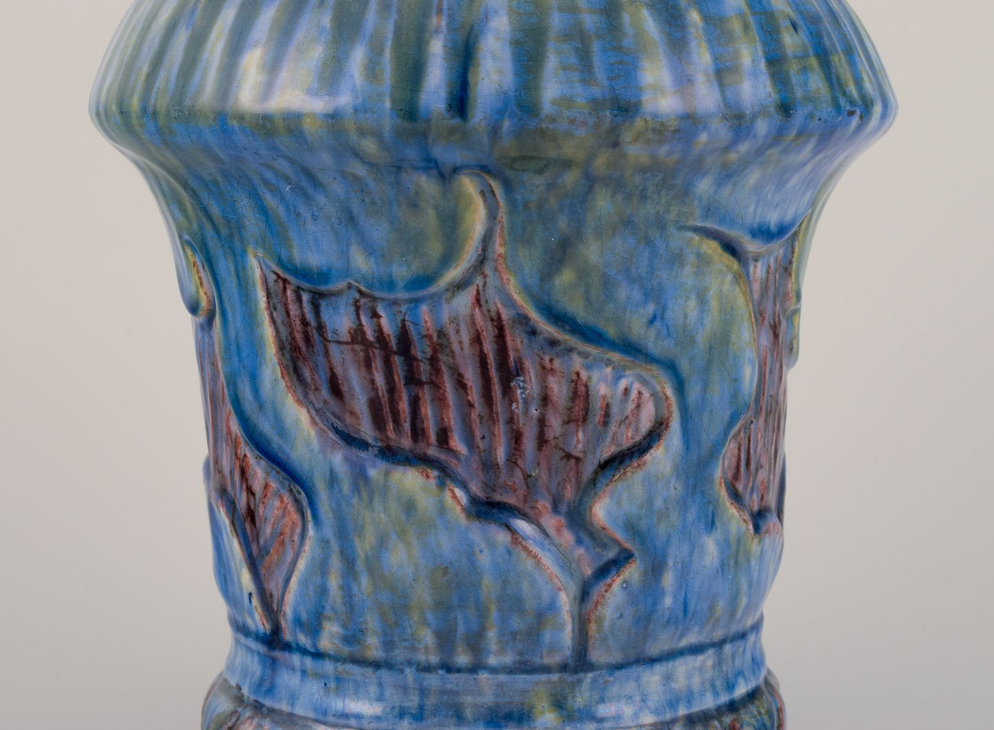 Møller & Bøgely, Danmark. Dansk skønvirke keramikvase i Bindesbøll stil. Glasur i blå og grønne toner.