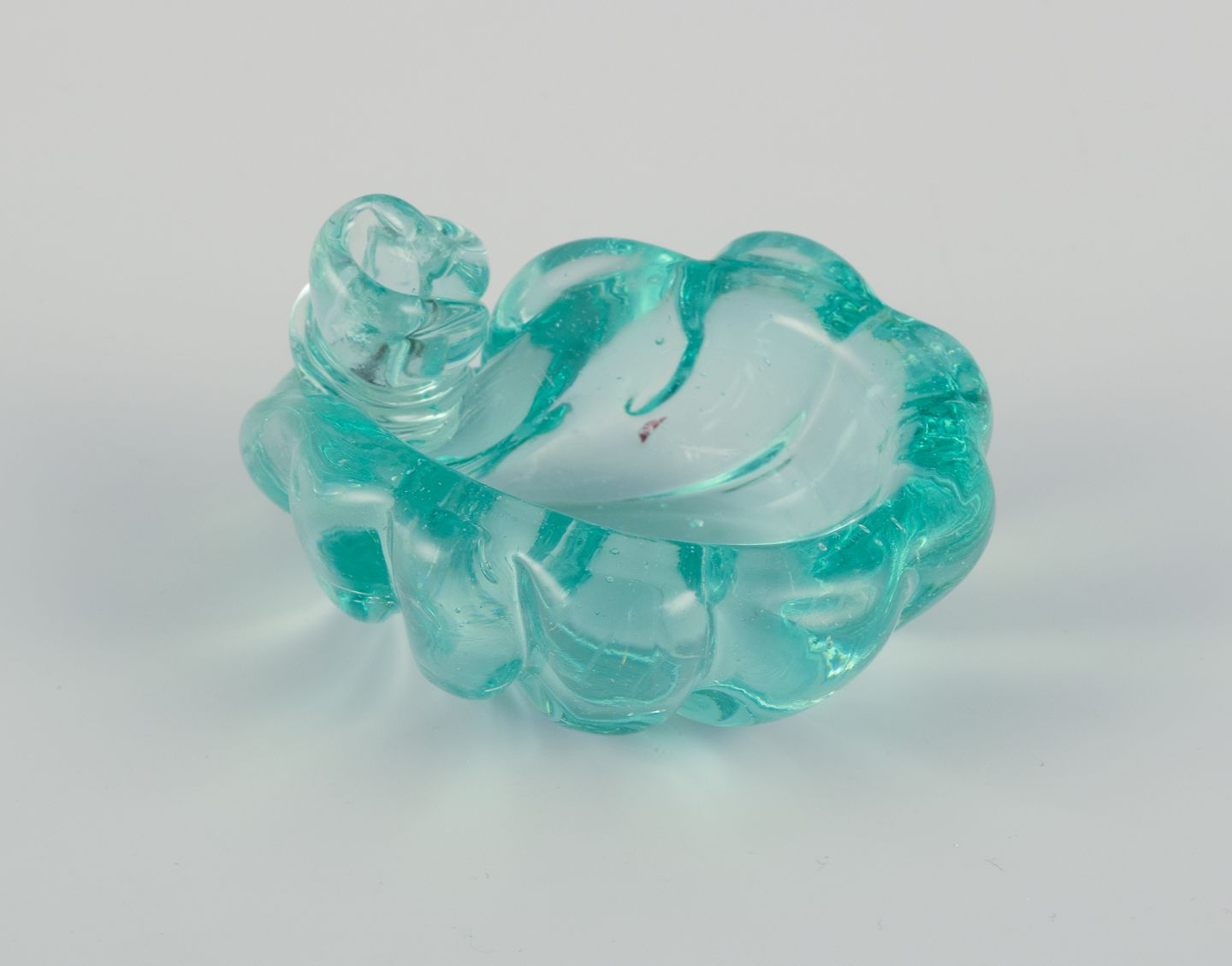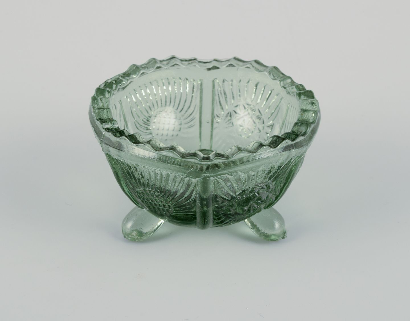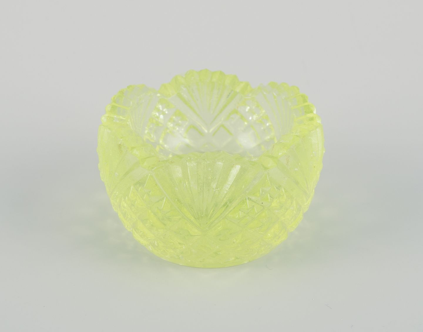 Fem saltkar i farvet glas. Grønt og gult håndlavet glas.