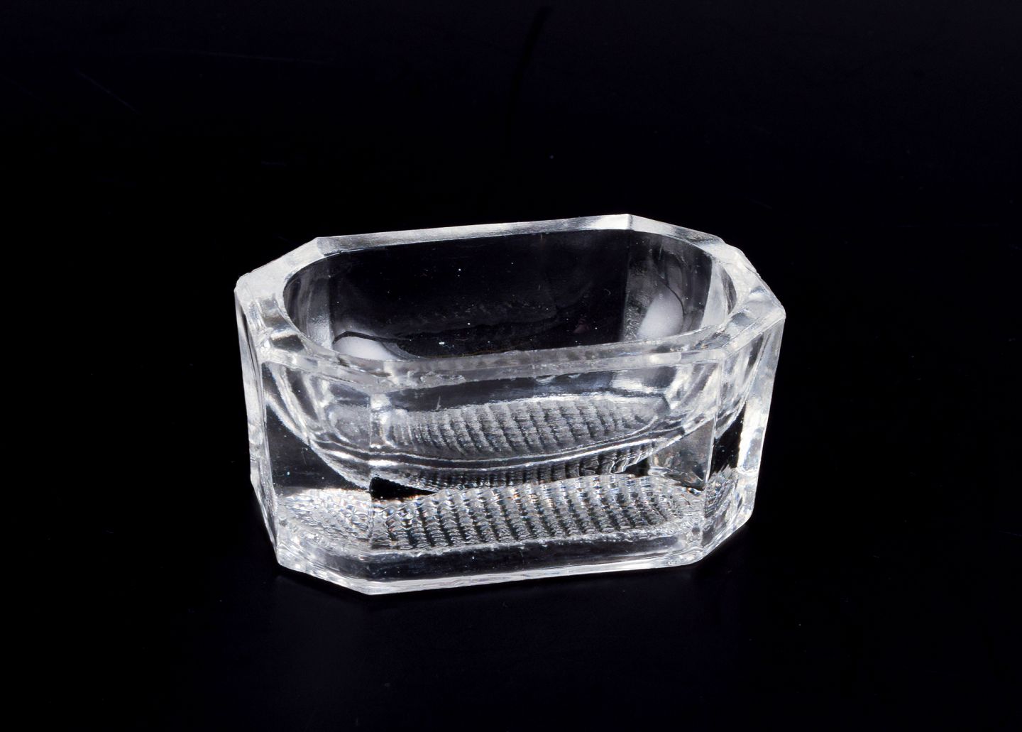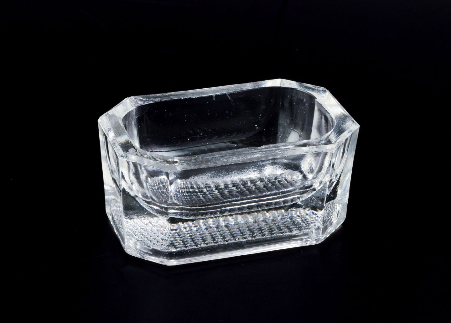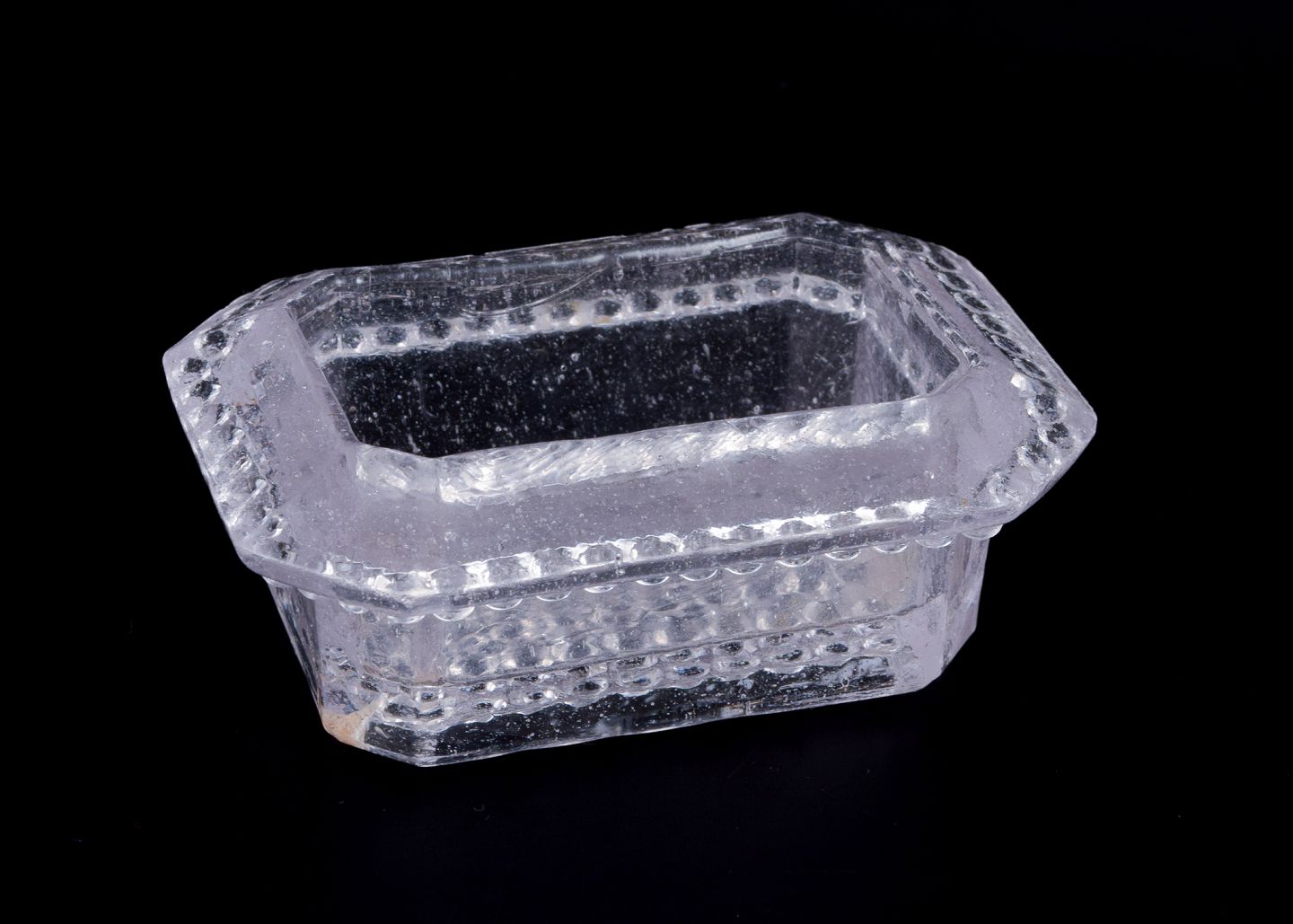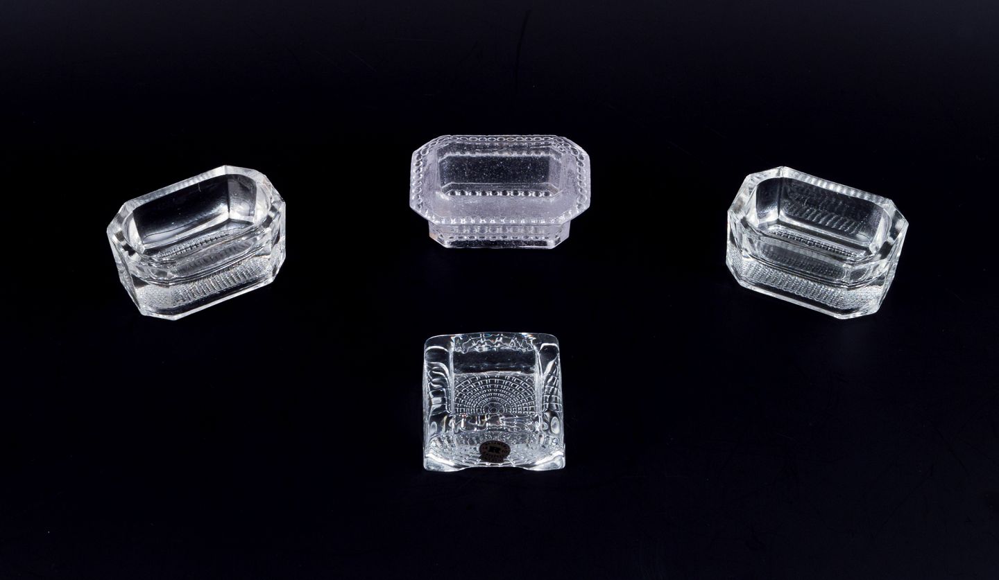 Fåglavik Glasbruk (1874-1980), Sverige. Fire saltkar i klart håndlavet glas. Privat svensk samling. Midt 1900-tallet. I flot stand. Største: L 7,5 cm. x D 5,0 cm. x H 3,5 cm.