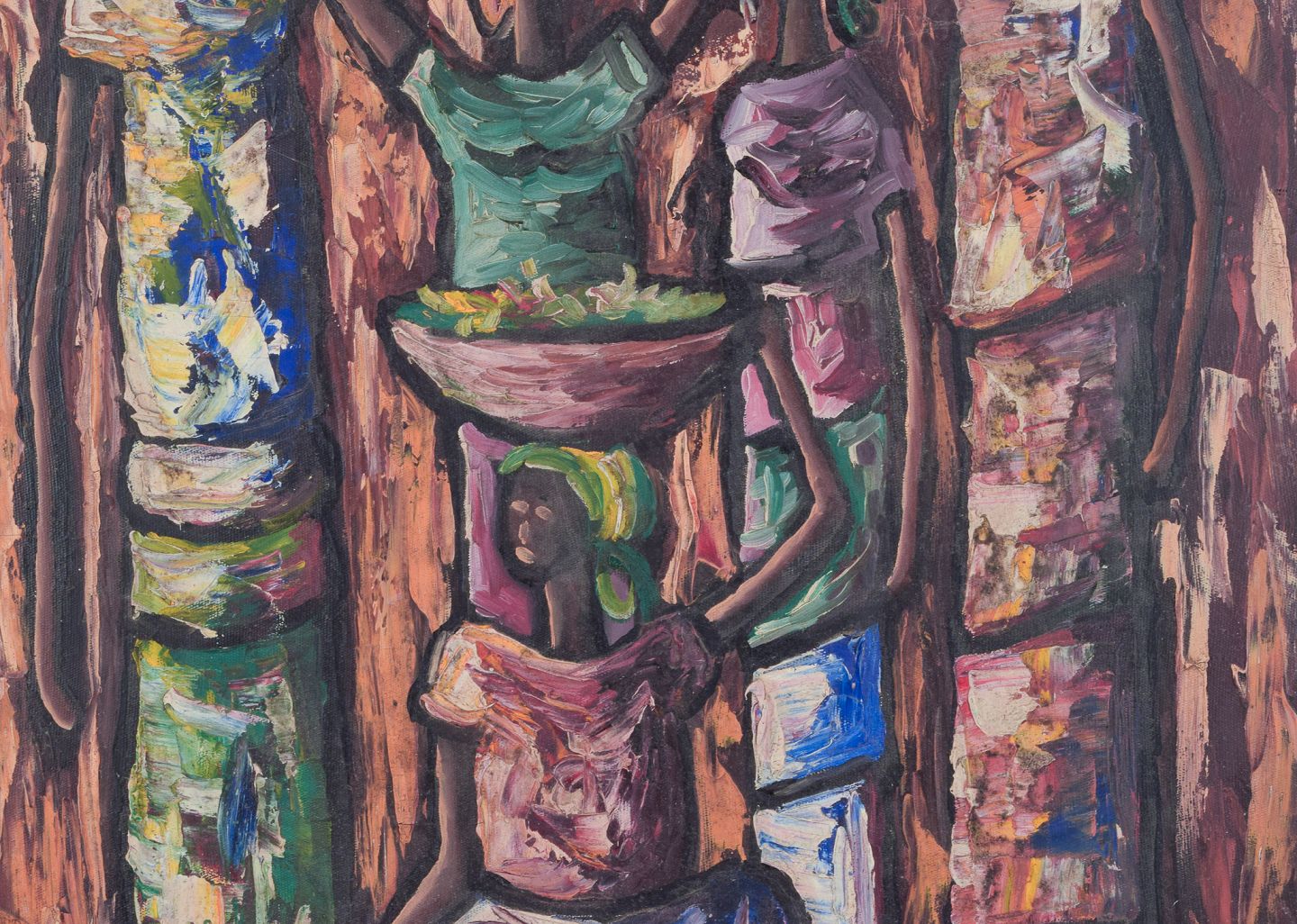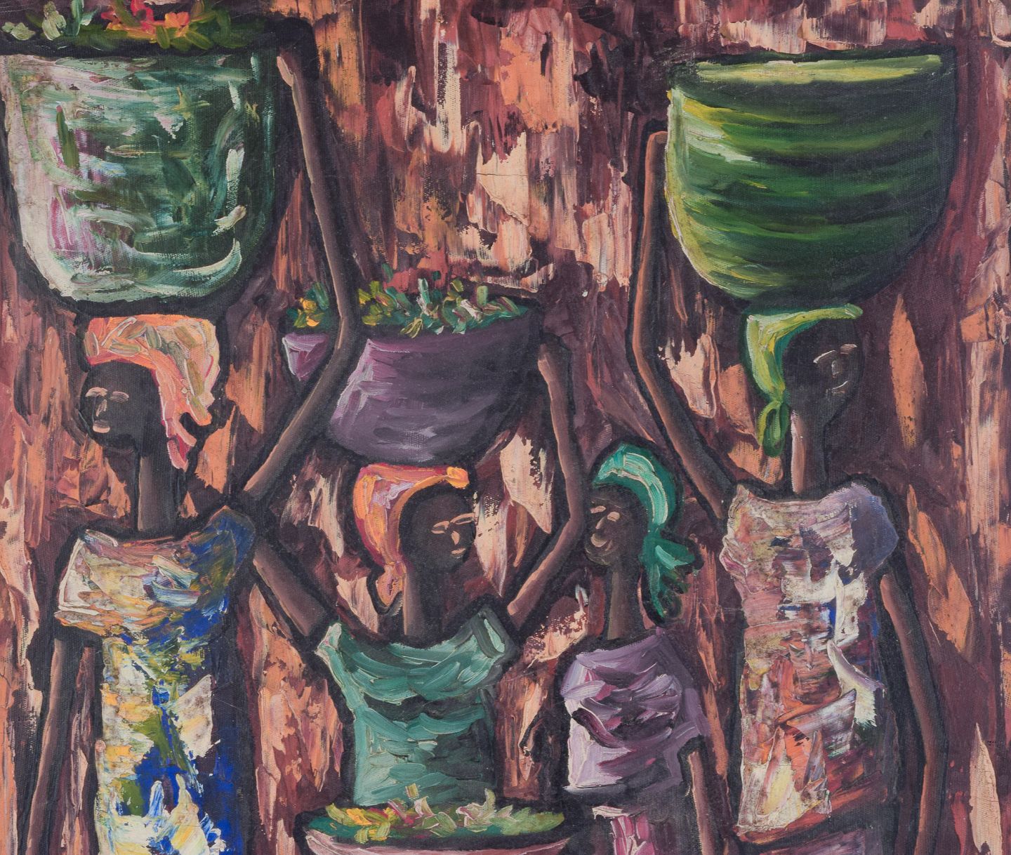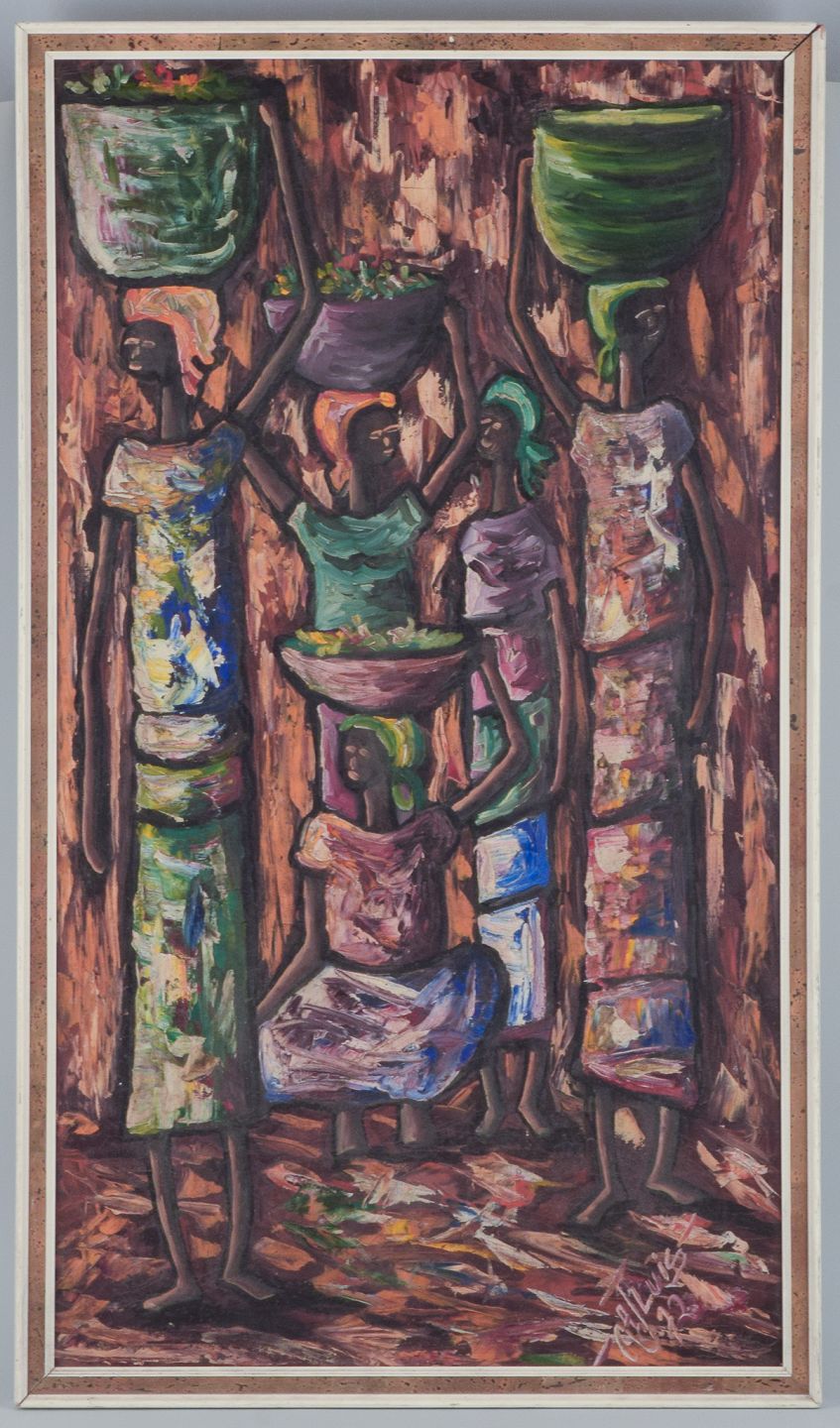 A. J. Luis, Haiti. Olie på lærred. Fem kvinder i landskab. Abstrakt stil. Signeret og dateret ’72. I perfekt stand. Lærred: 49,0 cm. x 89,0 cm. Totalmål: 54,5 cm. x 93,5 cm.