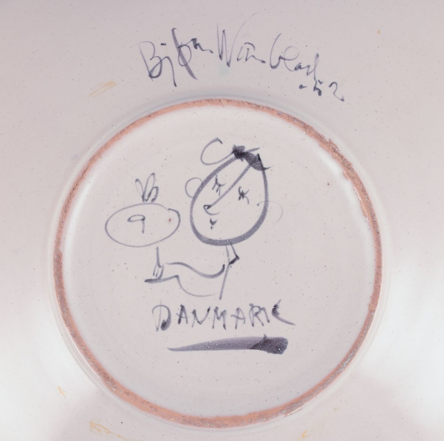 Bjørn Wiinblad (1918-2006), eget værksted. Stor tidlig unika keramikskål. Motiv af kvinde og fugle. Polykrom glasur. Håndmalet.