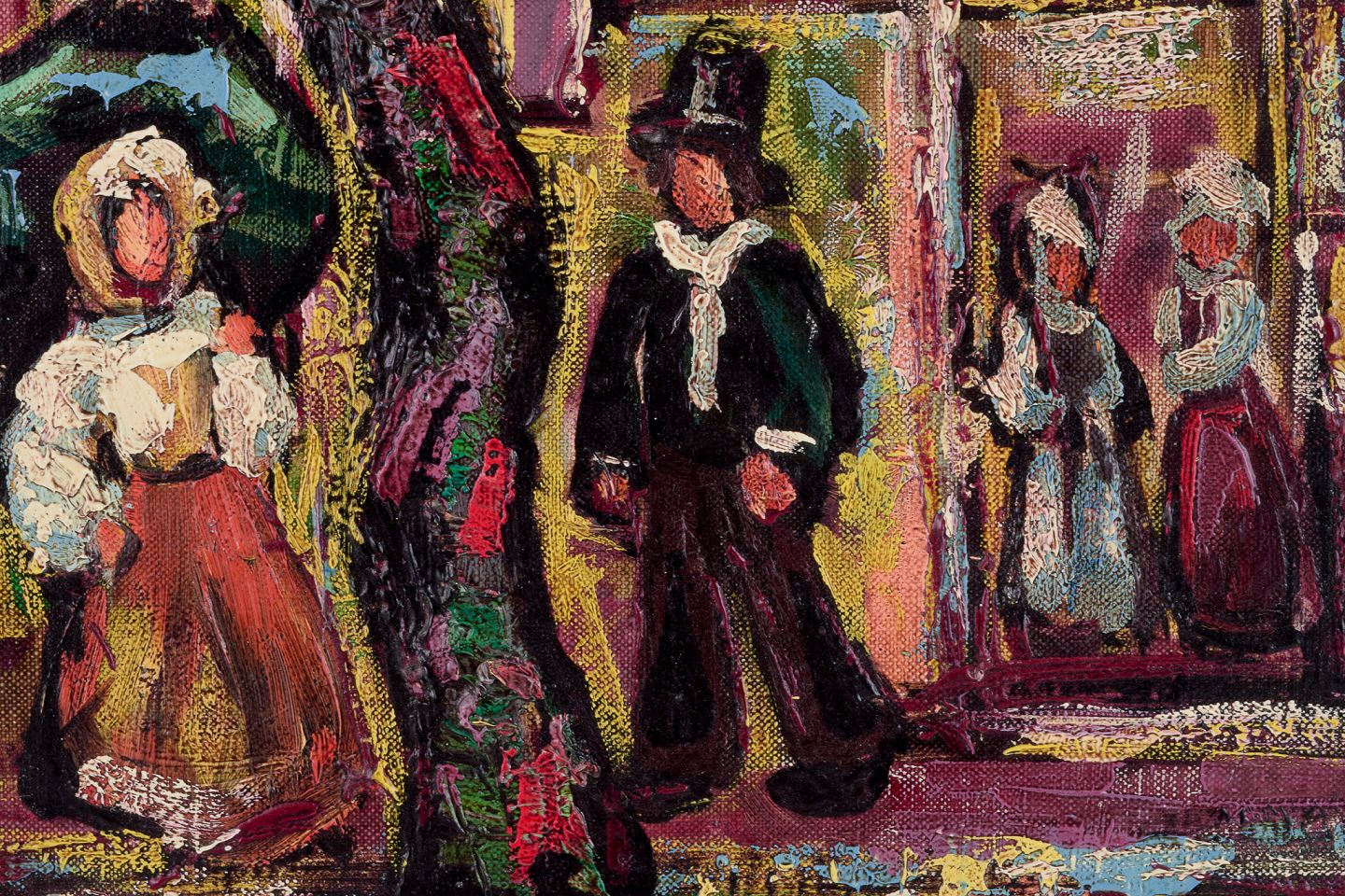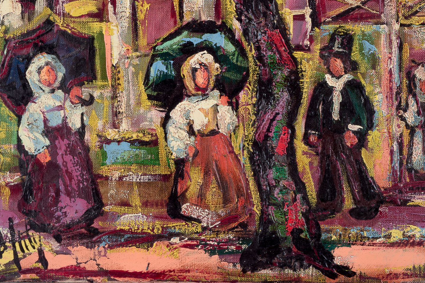Henry Maurice D'Anty (1910-1998), svensk/fransk kunstner. Olie på lærred. Bymotiv med personer i forgrunden. Abstrakt stil.