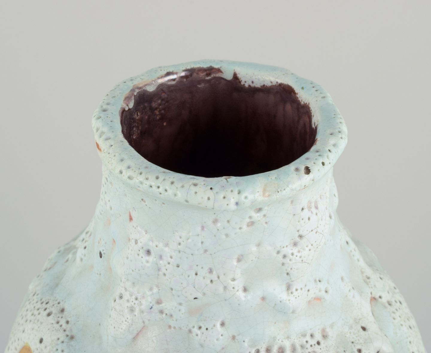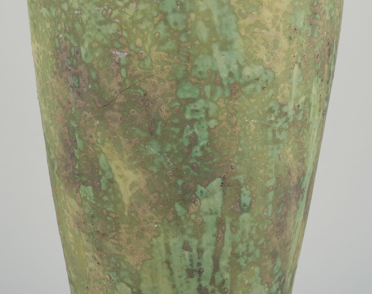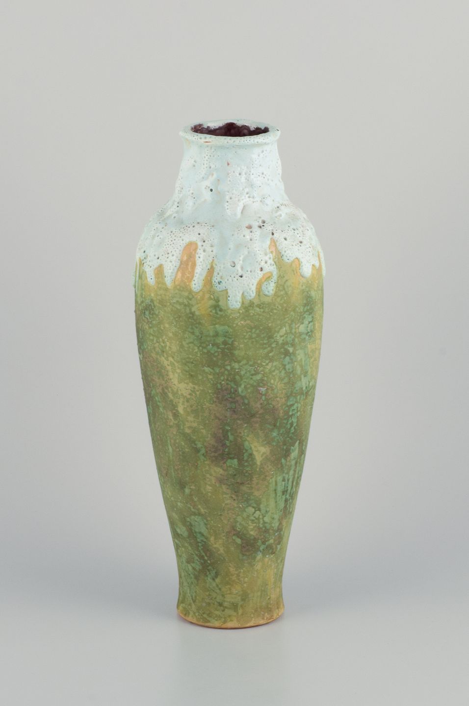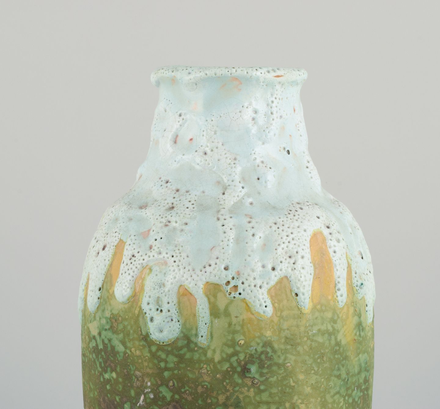 Pierrefonds, fransk keramikværksted. Unika keramik gulvvase. Flydeglasur i lyse toner på mat grønlig bund.