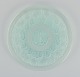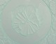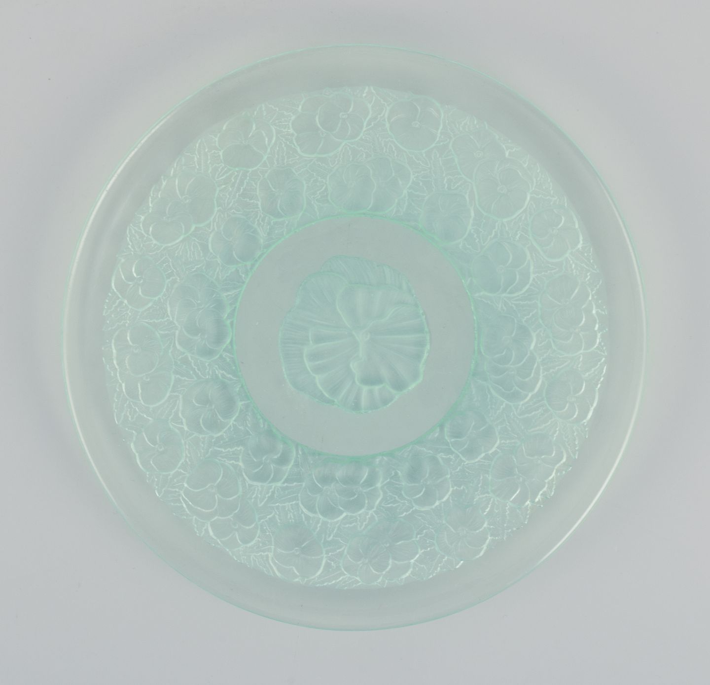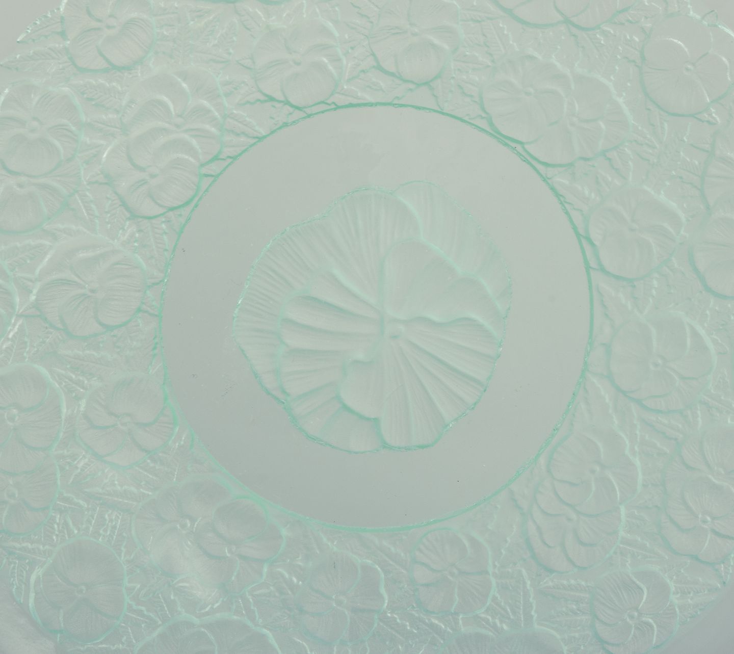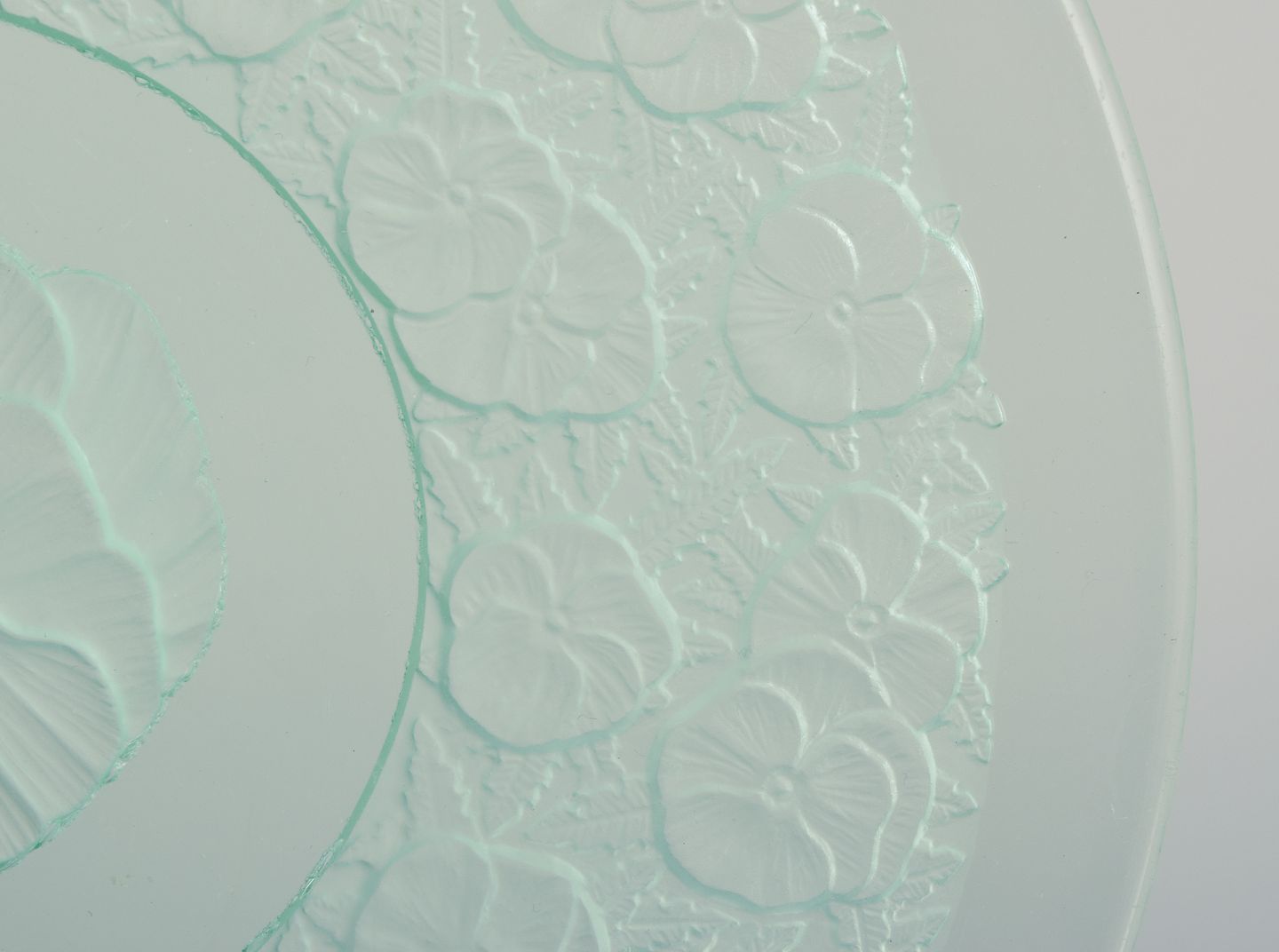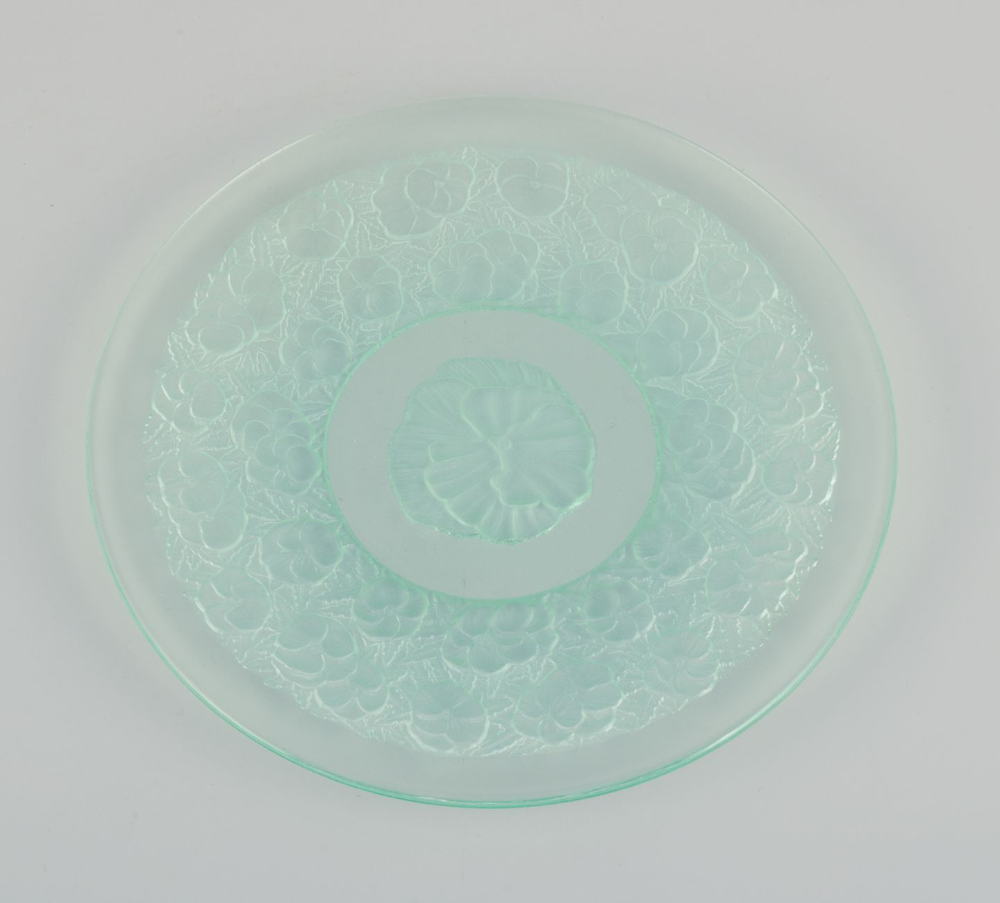 René Lalique stil. Et sæt på ni glastallerkner designet med blomstermotiver i grønt glas. Mundblæst glas. 1930/40’erne. Perfekt stand. Mål: D 18,0 cm.
