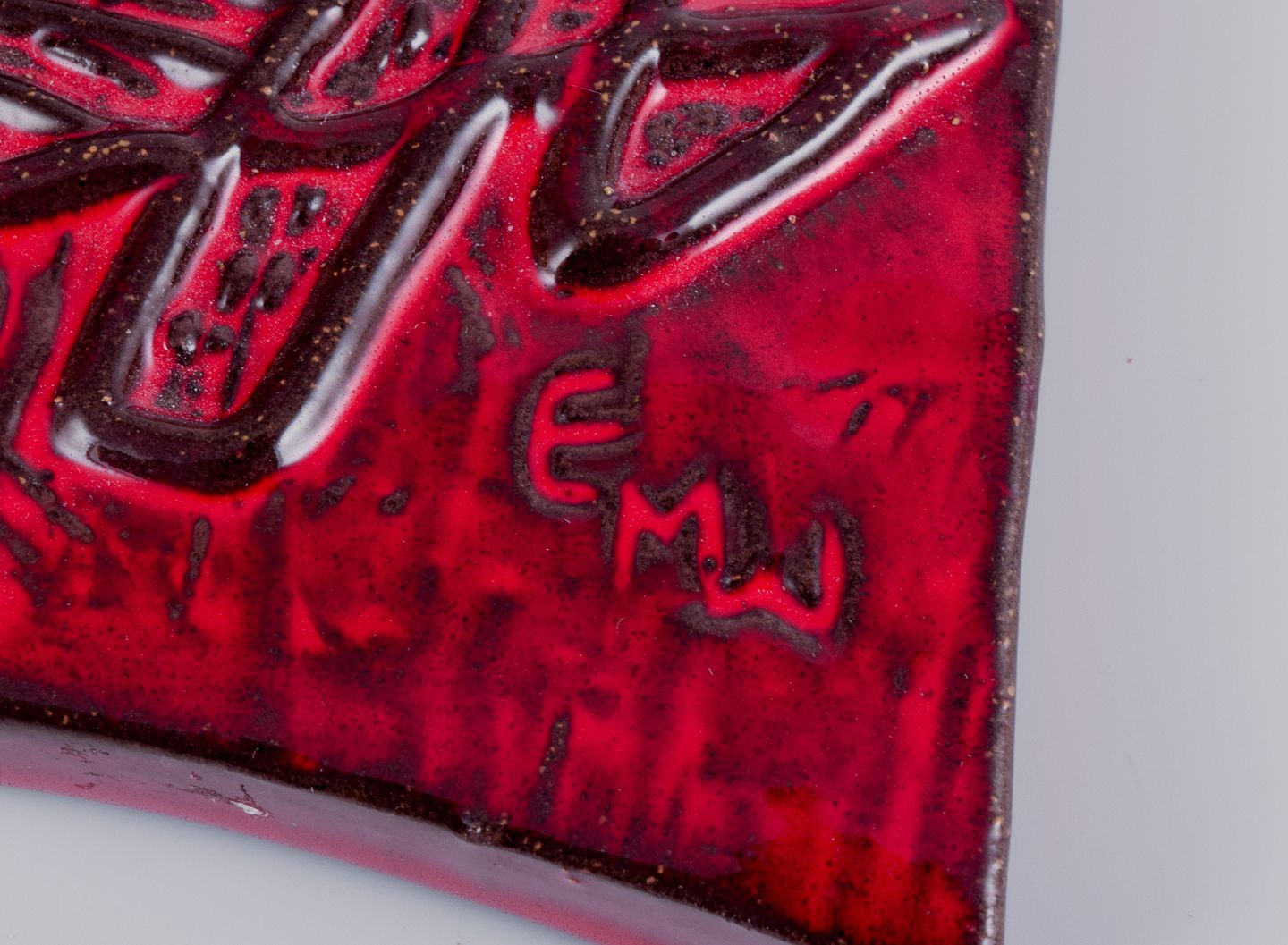 Ester Wallin (1928-2009) for Upsala Ekeby, Sverige. Vægrelief i stentøj med abstrakt motiv. Glasur i røde nuancer. Ca. 1960. Model: 0117E Perfekt stand. Stemplet. Mål: B 18,0 cm. x H 28,0 cm. D 1,8 cm.