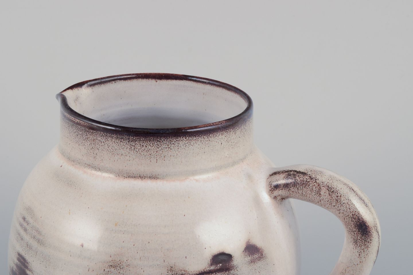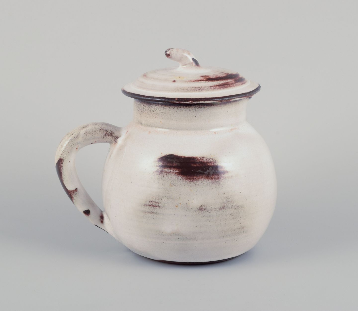 Gerard Hofmann (1917-1965), fransk keramiker, eget værksted. Stor tekande i unika keramik. Glasur i jordfarver. Håndlavet. Ca. 1960. I perfekt stand. Signeret Mål: H 17,0 cm. x D 18,0 cm. med hank.