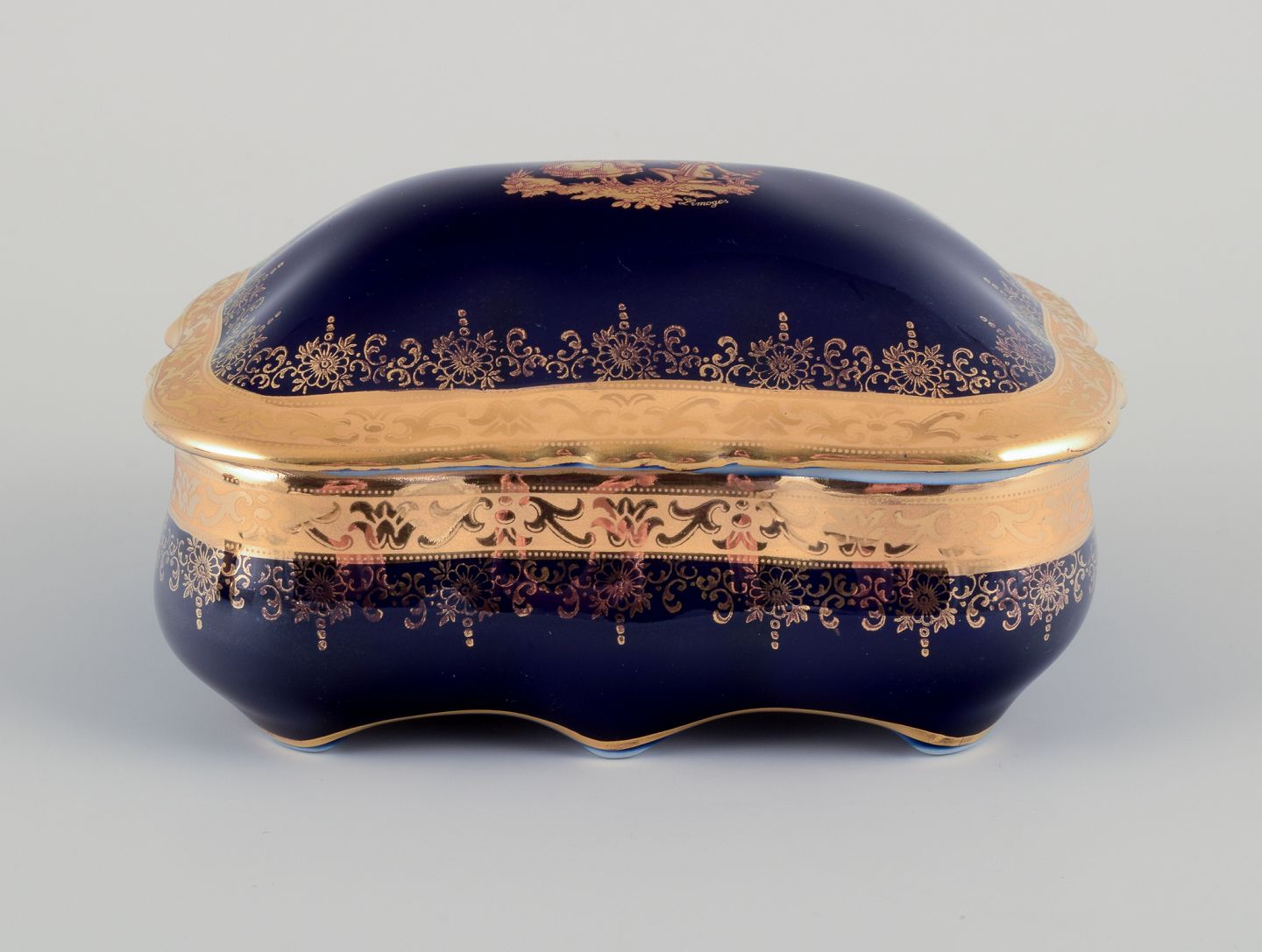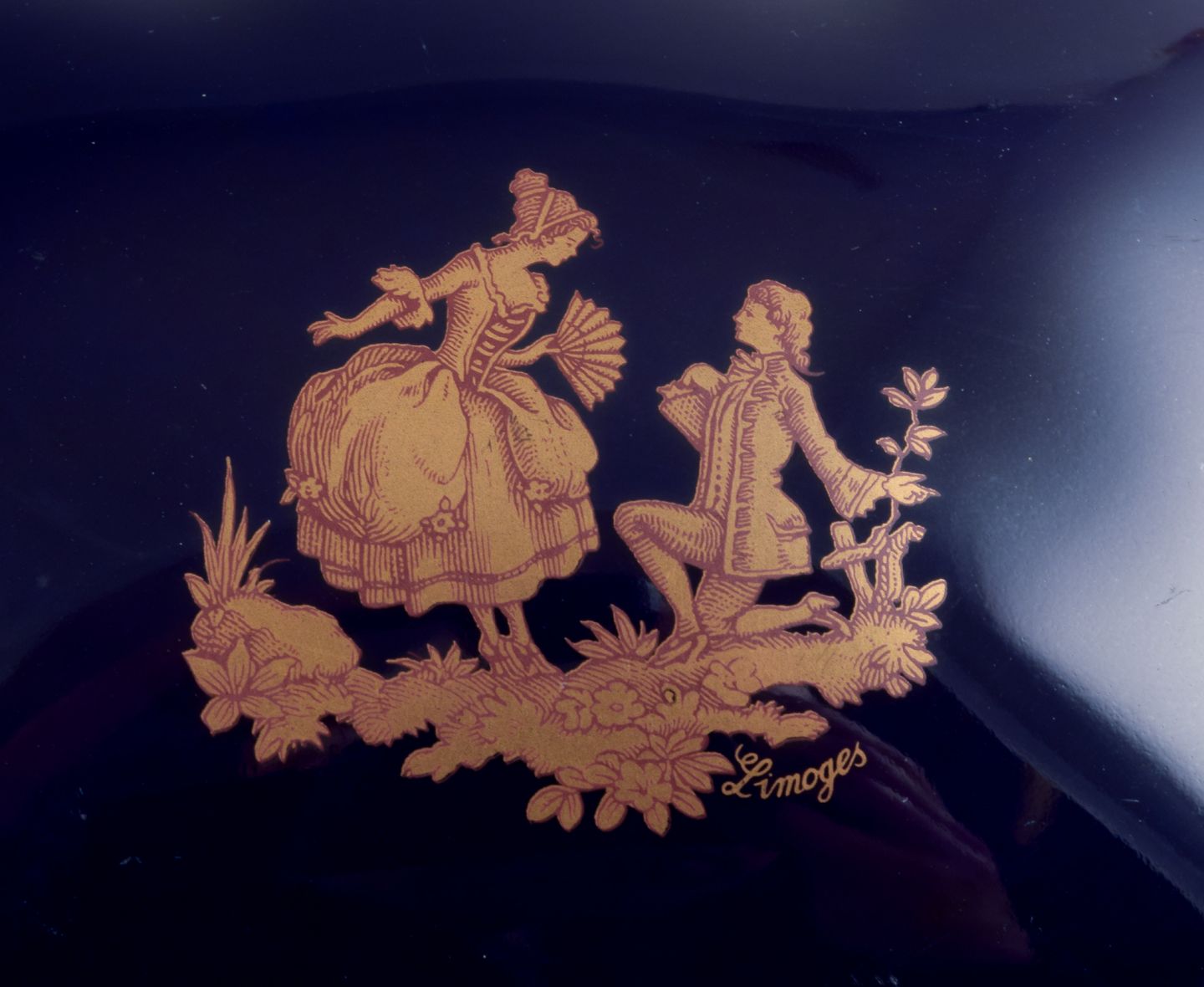 Limoges, Frankrig. To lågkrukker i porcelæn. Dekoreret i 22-karat bladguld. Smuk kongeblå glasur. Scène galante.