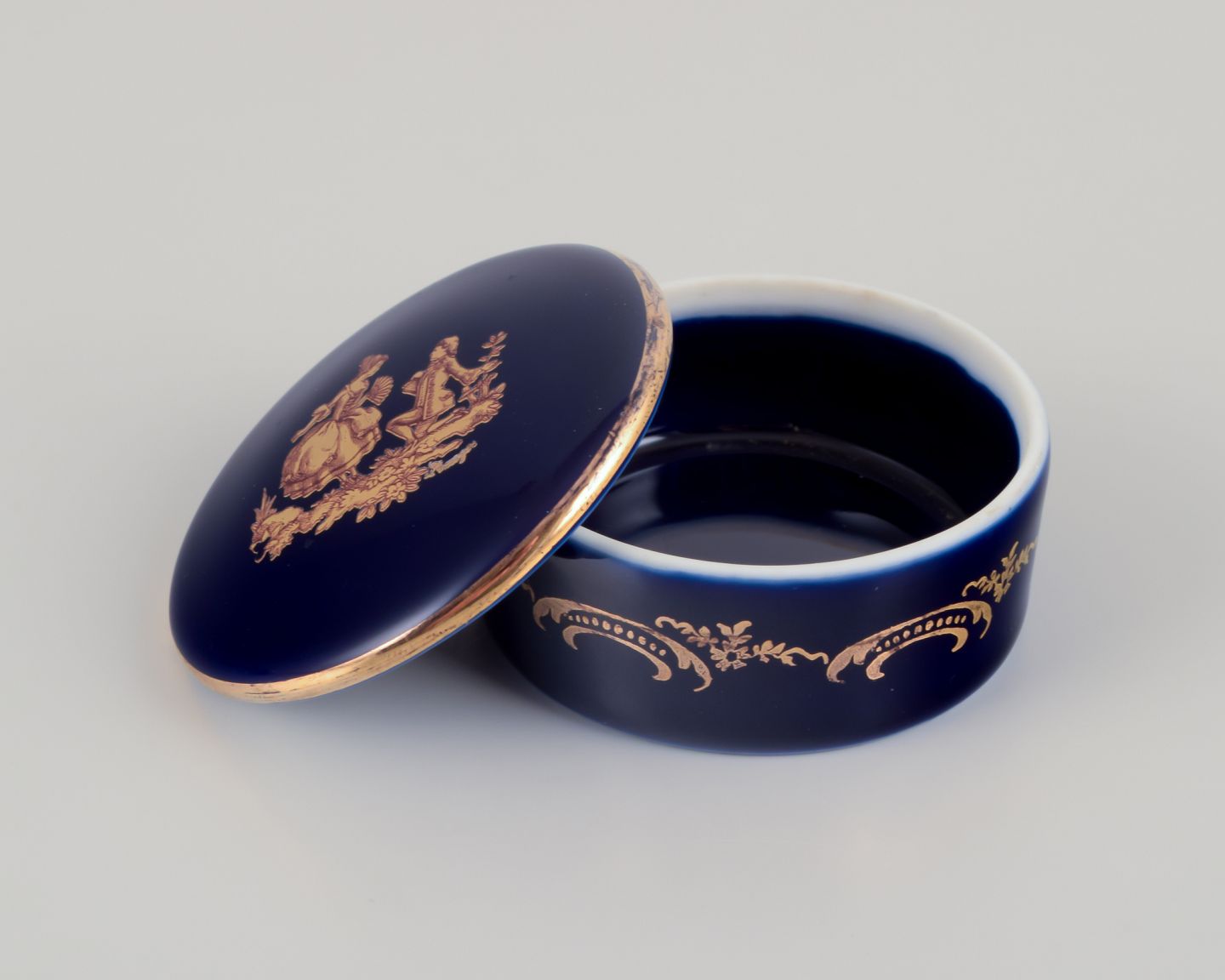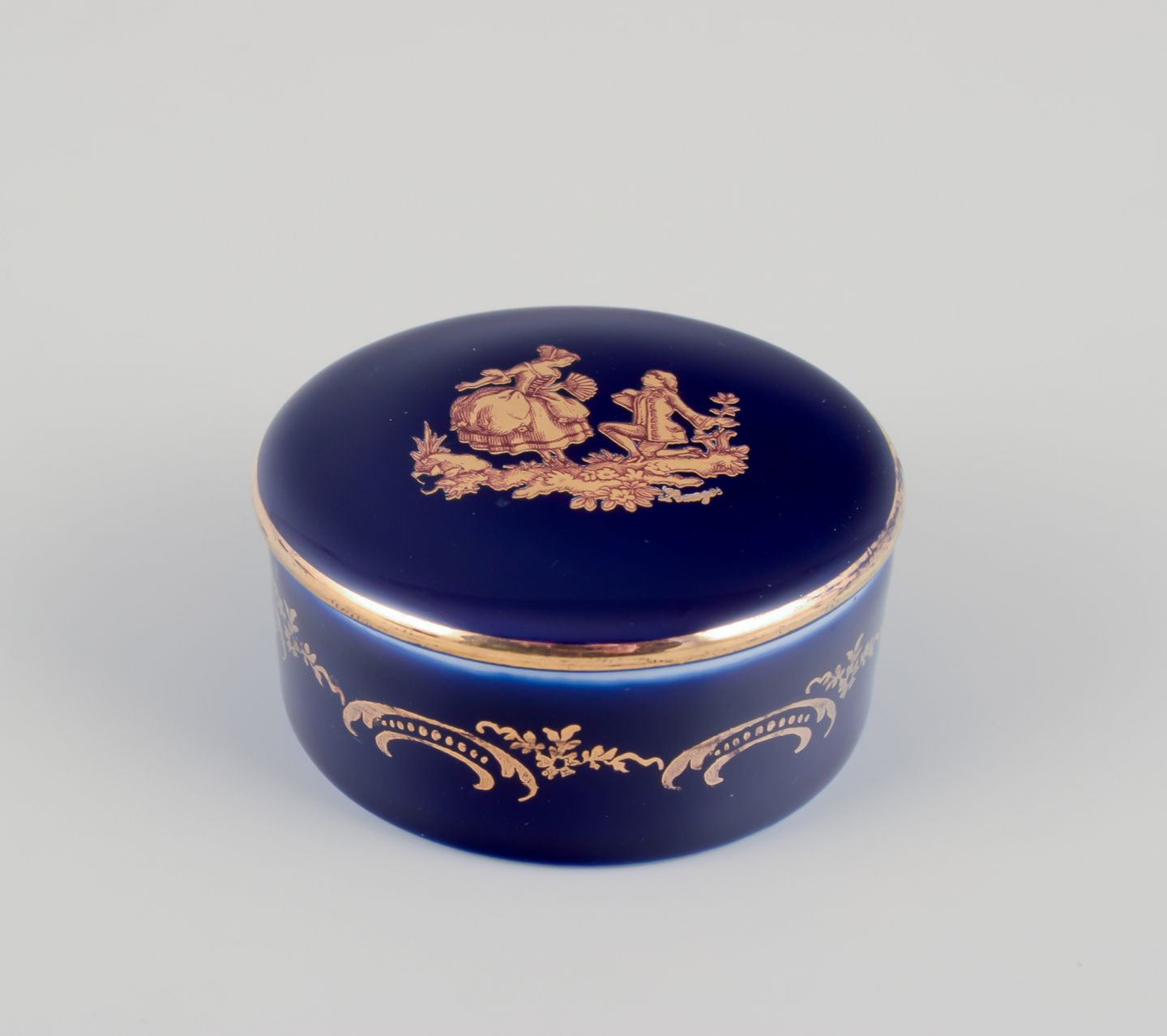 Limoges, Frankrig. Tre miniature lågkrukker i porcelæn. Dekoreret i 22-karat bladguld. Smuk kongeblå glasur. Scène galante.