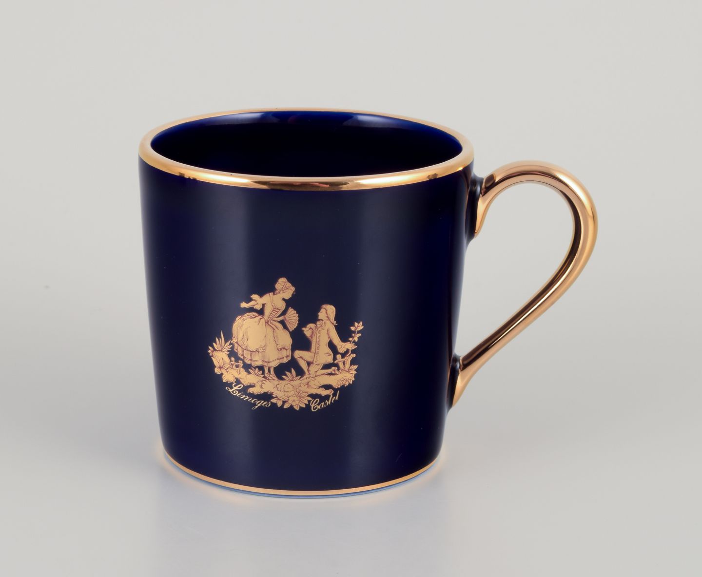 Limoges, Frankrig. Syv dele miniatureporcelæn. Dekoreret i 22-karat bladguld. Smuk kongeblå glasur. Scène galante.