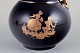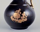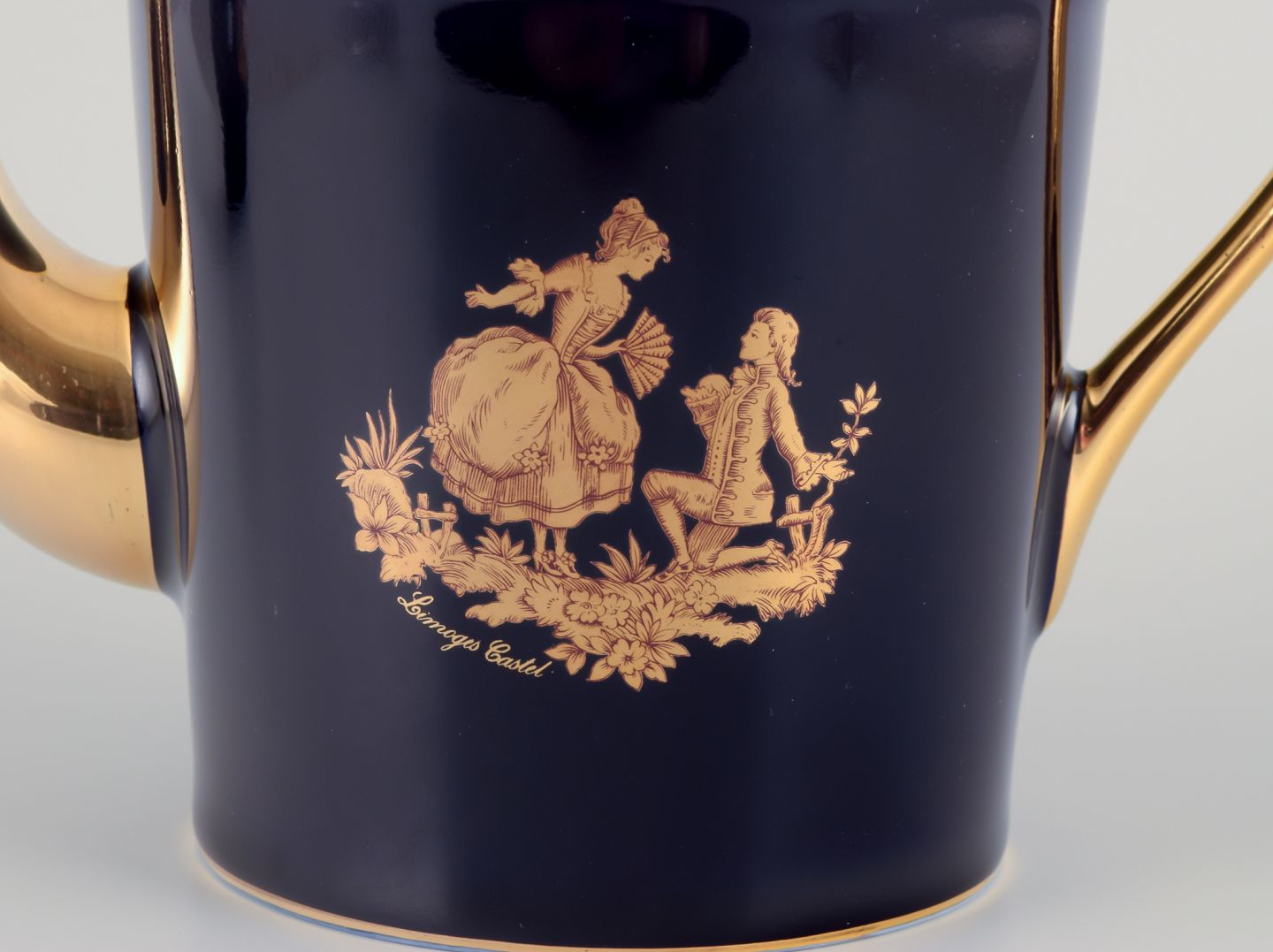 Limoges, Frankrig. MIniature Kaffekande og vandkande i porcelæn. Dekoreret i 22-karat bladguld. Smuk kongeblå glasur. Scène galante.
