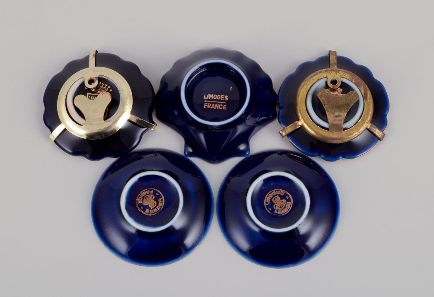 Limoges, Frankrig. Fem små dele porcelæn dekoreret i 22-karat bladguld. Smuk kongeblå glasur. Scène galante.