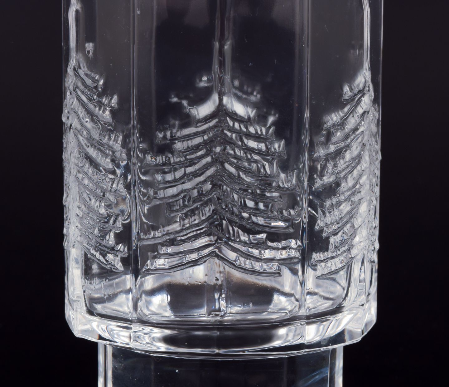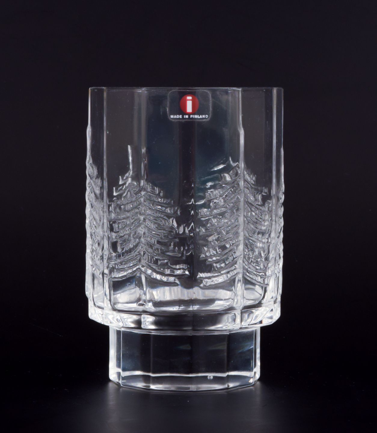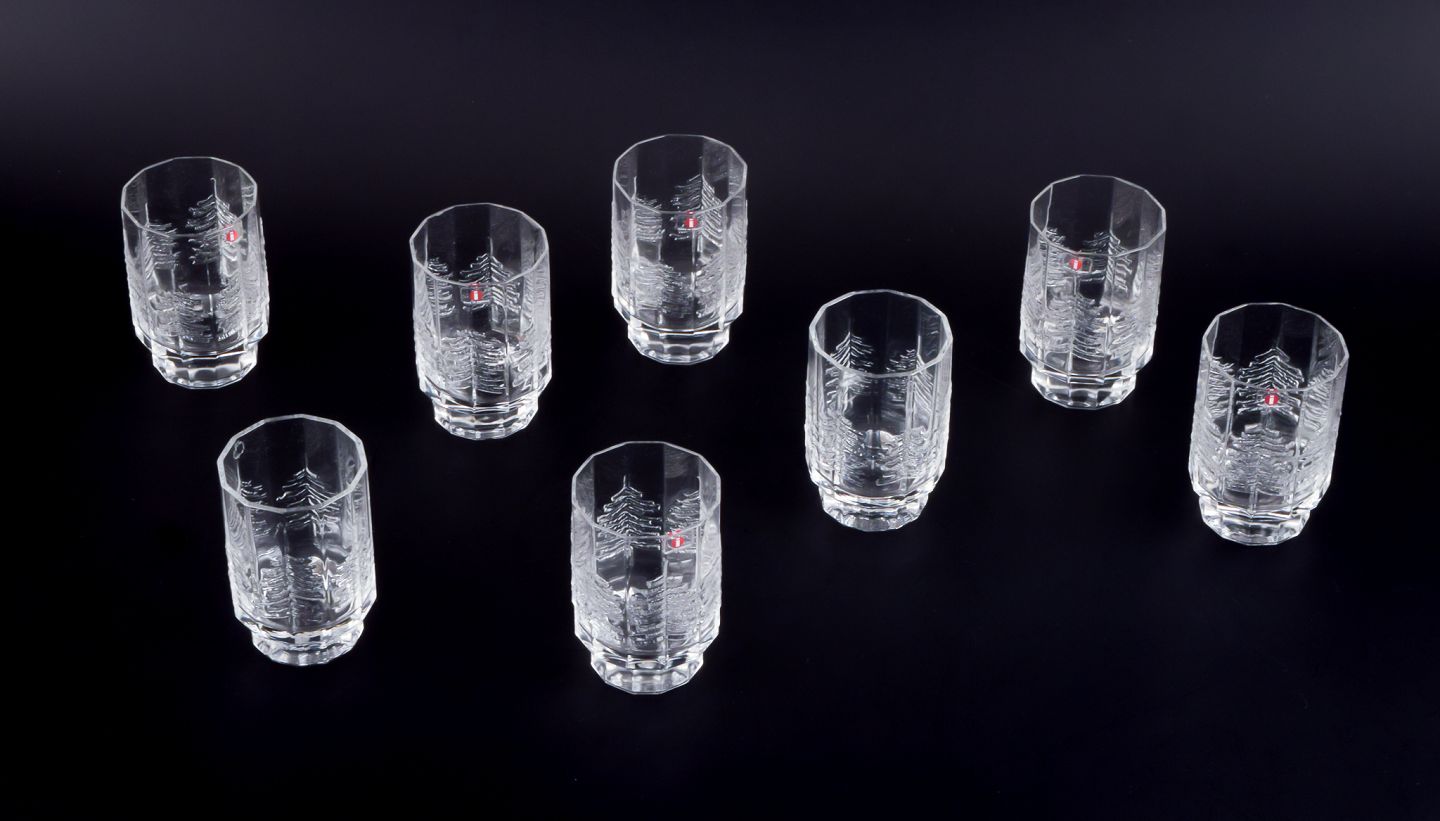 Jorma Vennola for Iittala. Otte ”Kuusi” drikkeglas med motiv af grantræer. Sent 1900-tallet. Perfekt stand. Mærkat. Mål: H 10,0 cm. x D 6,5 cm.