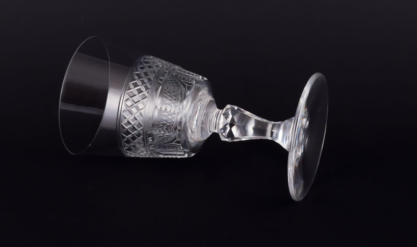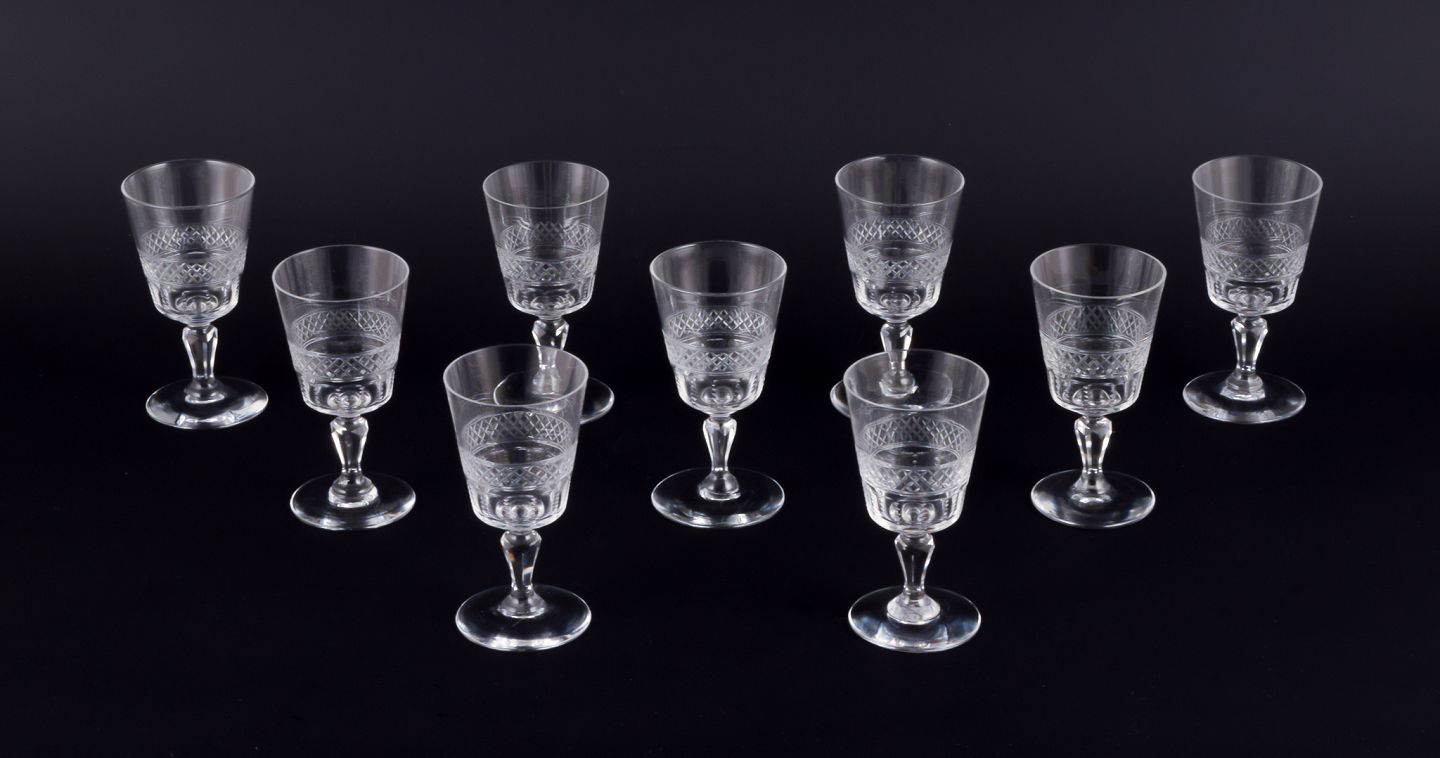 Et sæt på ni mundblæste franske sherryglas i krystalglas. Facetslebet. Håndlavet. Ca. 1900. Perfekt stand. Mål: H 11,0 cm. x D 5,5 cm.