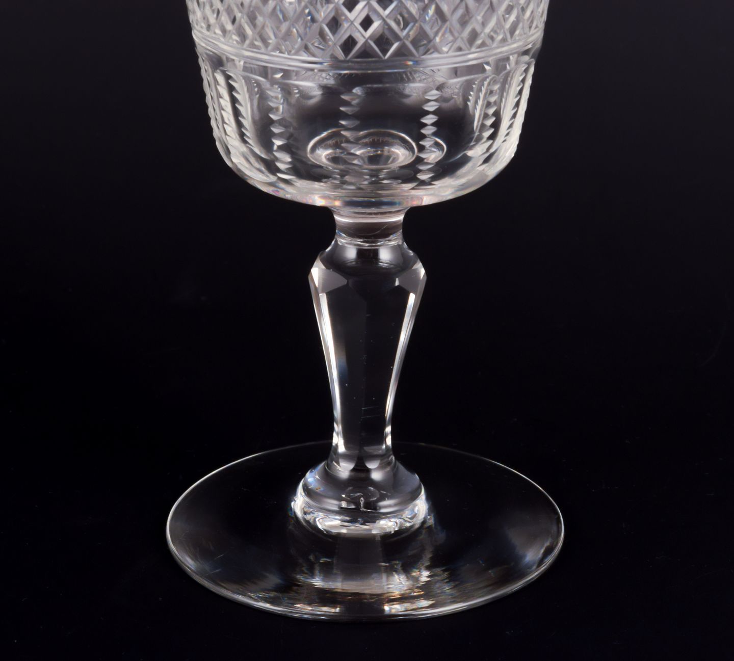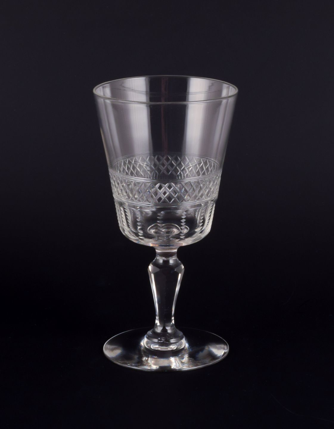 Et sæt på fem mundblæste franske rødvinsglas i krystalglas. Facetslebet. Håndlavet. Ca. 1900. Perfekt stand. Mål: H 15,0 cm. x D 7,8 cm.