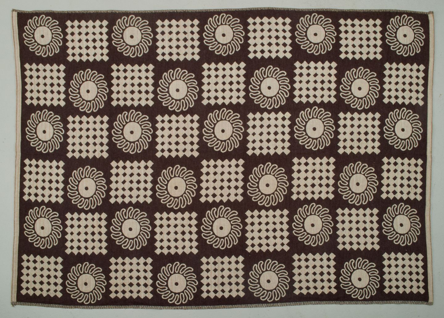 Stort håndvævet vægtæppe i ren uld. Geometriske felter i brunt og hvidt.