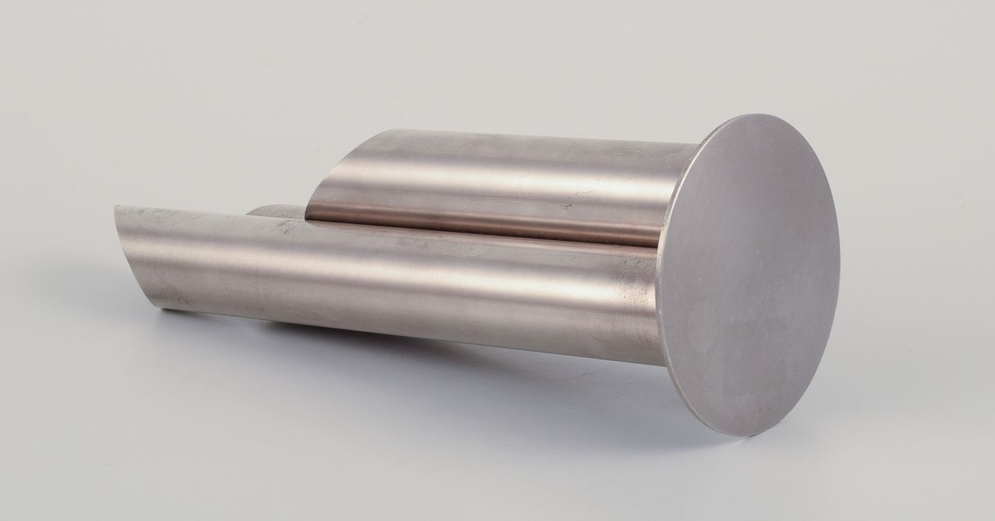 Svensk industriel designer. Vase i rustfrit stål udformet med tre sammensatte rør på rund sokkel. Brutalistisk stil. Ca. 1970. I flot stand. Mål: H 30,0 cm. x D 11,0 cm.