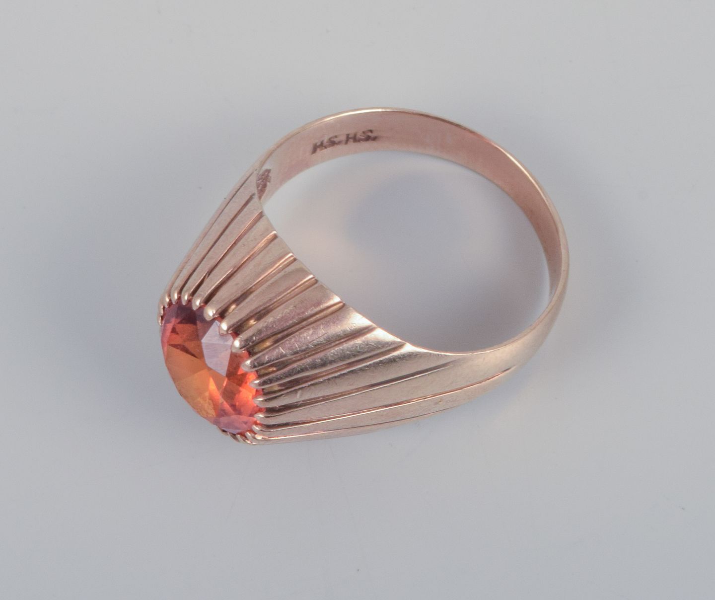Med facetslebet orange halvædelsten.