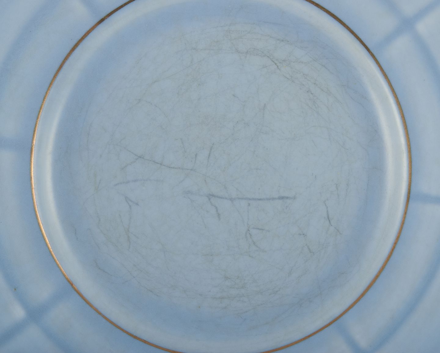 Arthur Percy for Gefle, Sverige. Syv Art Deco ”Grand” tallerkener i pastelblå porcelæn med håndmalet guldkant.