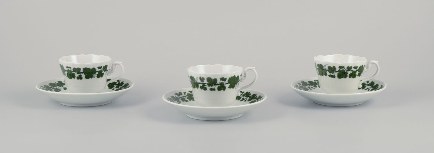Meissen, Tyskland, Green Ivy Vine, tre kaffekopper med tilhørende underkopper. Håndmalet.