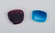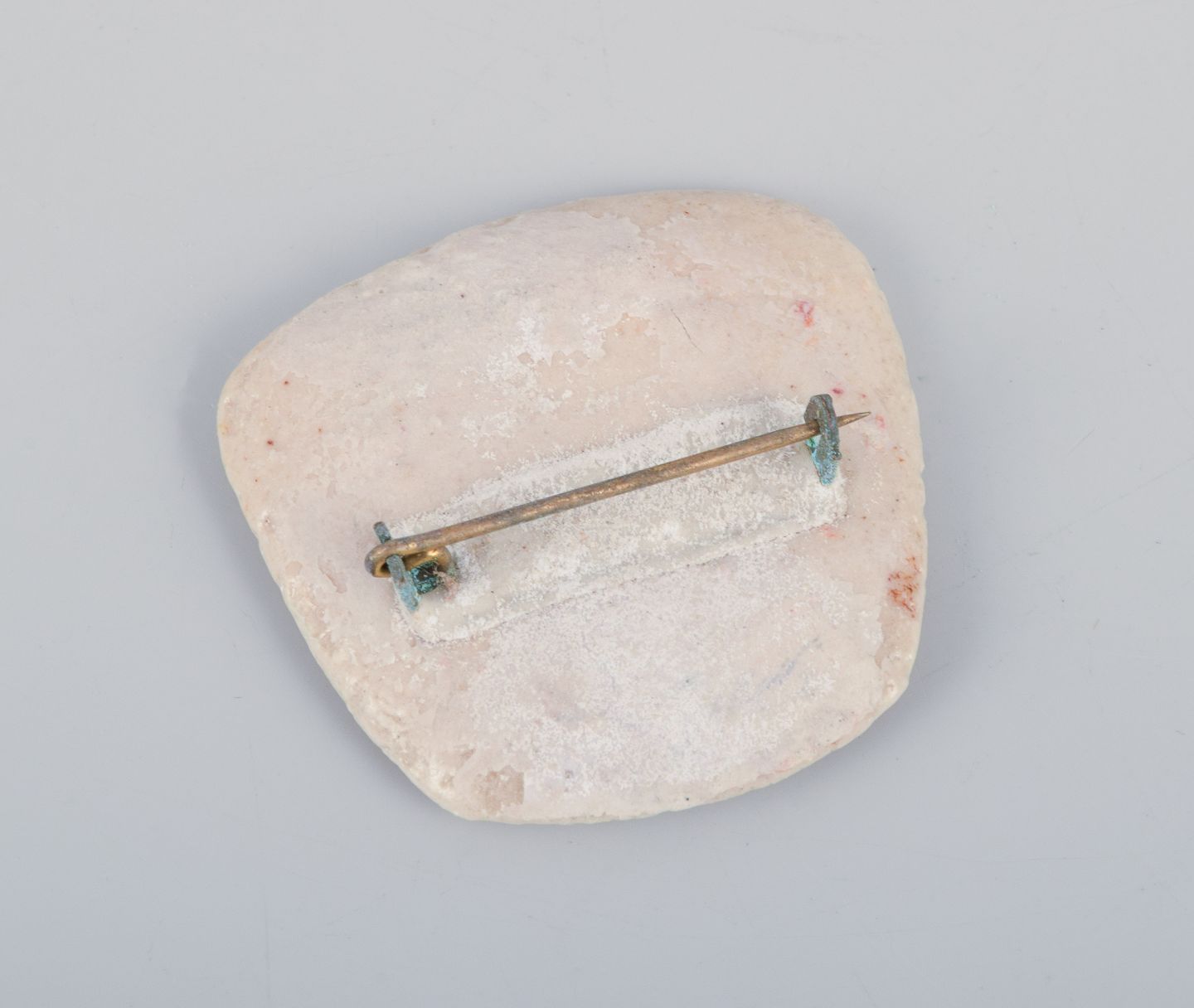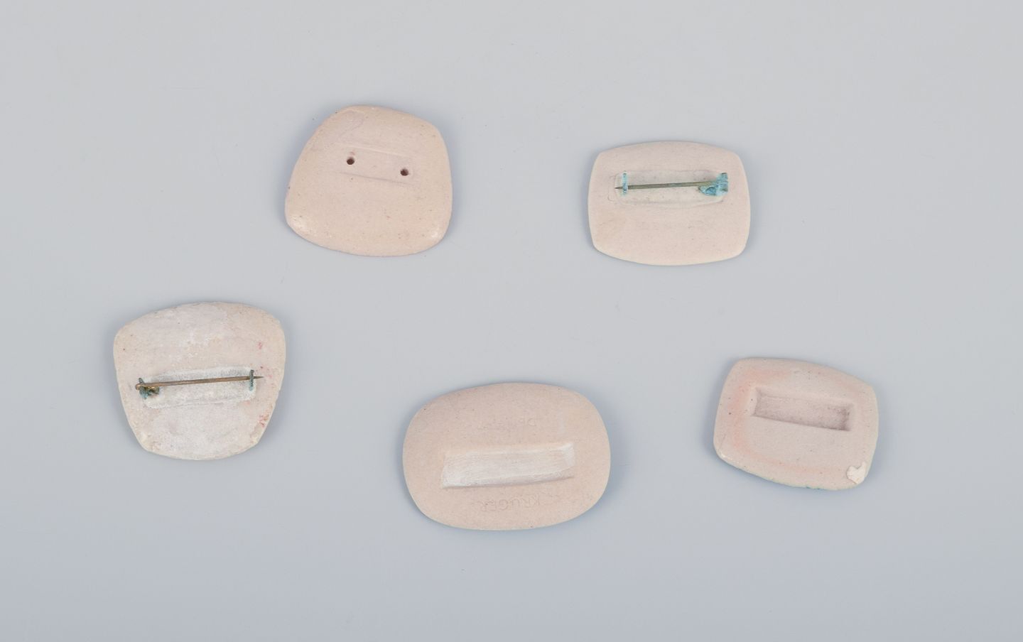 Fem unika brocher i glaseret stentøj i blå, grønne, lilla og gule nuancer.