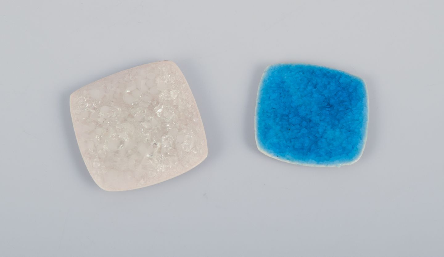 Otte unika brocher i glaseret stentøj i blå og hvide nuancer.