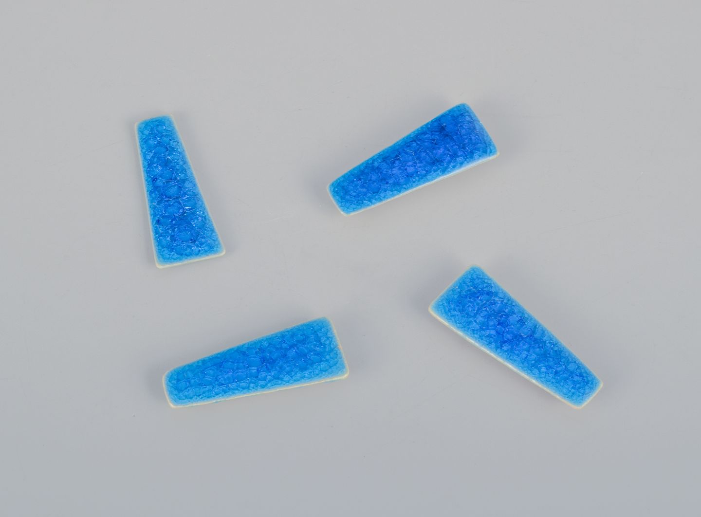 Ti unika brocher i glaseret stentøj i blå nuancer.
